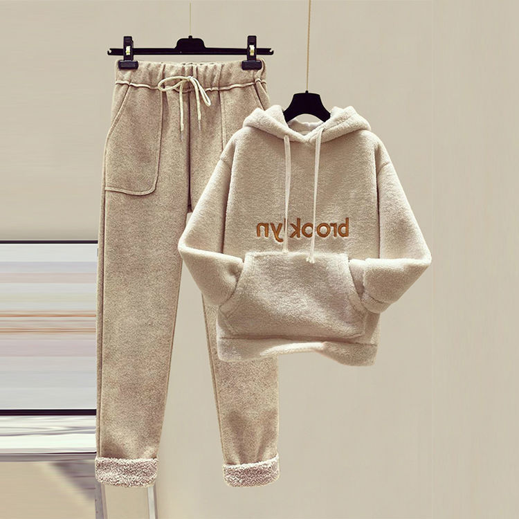 女士秋冬季加绒卫衣套装连帽上衣休闲裤