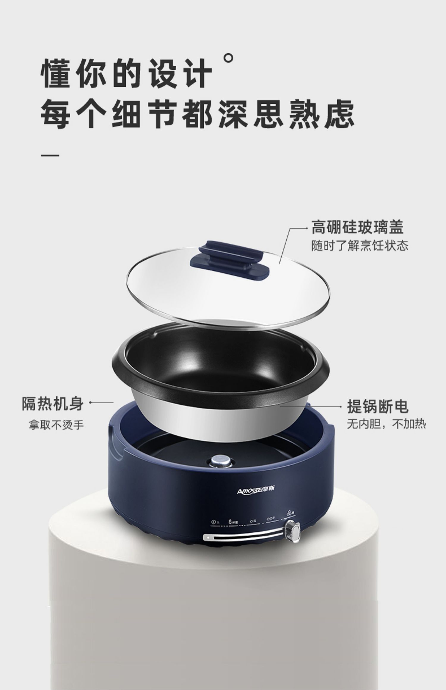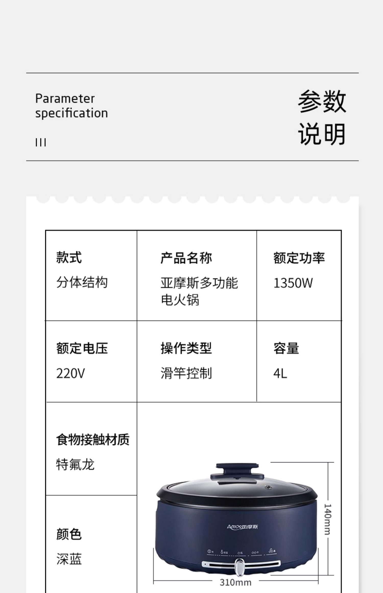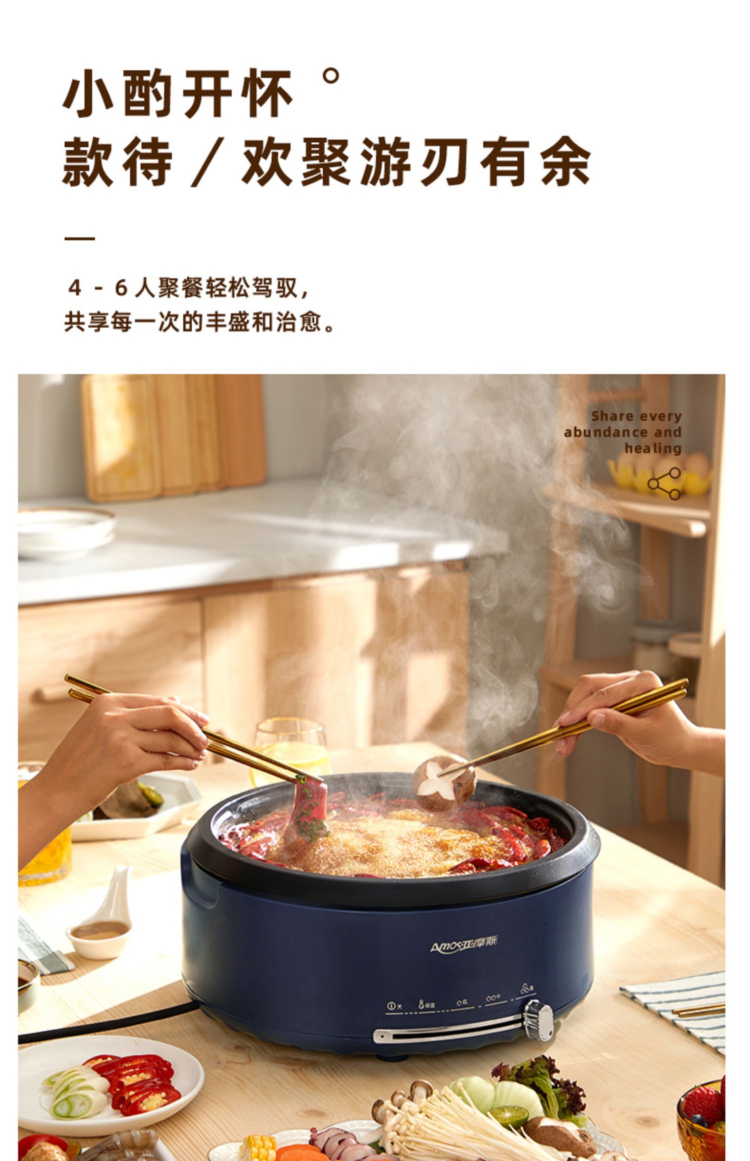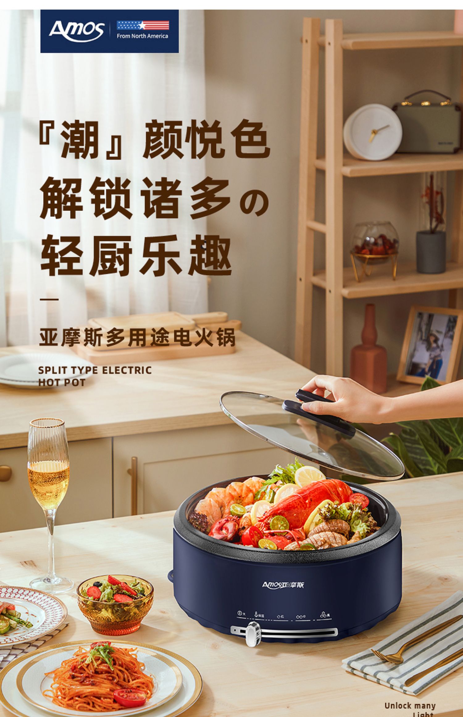【送锅铲】荣事达旗下子品牌,1年换新!全国联保!亚摩斯电火锅,分体式设计,可整锅端起,不粘涂层,内胆可直接清洗。4档火力,煎烤涮煮炸焖炖样样都行!4L容量,满足4-6人所需!