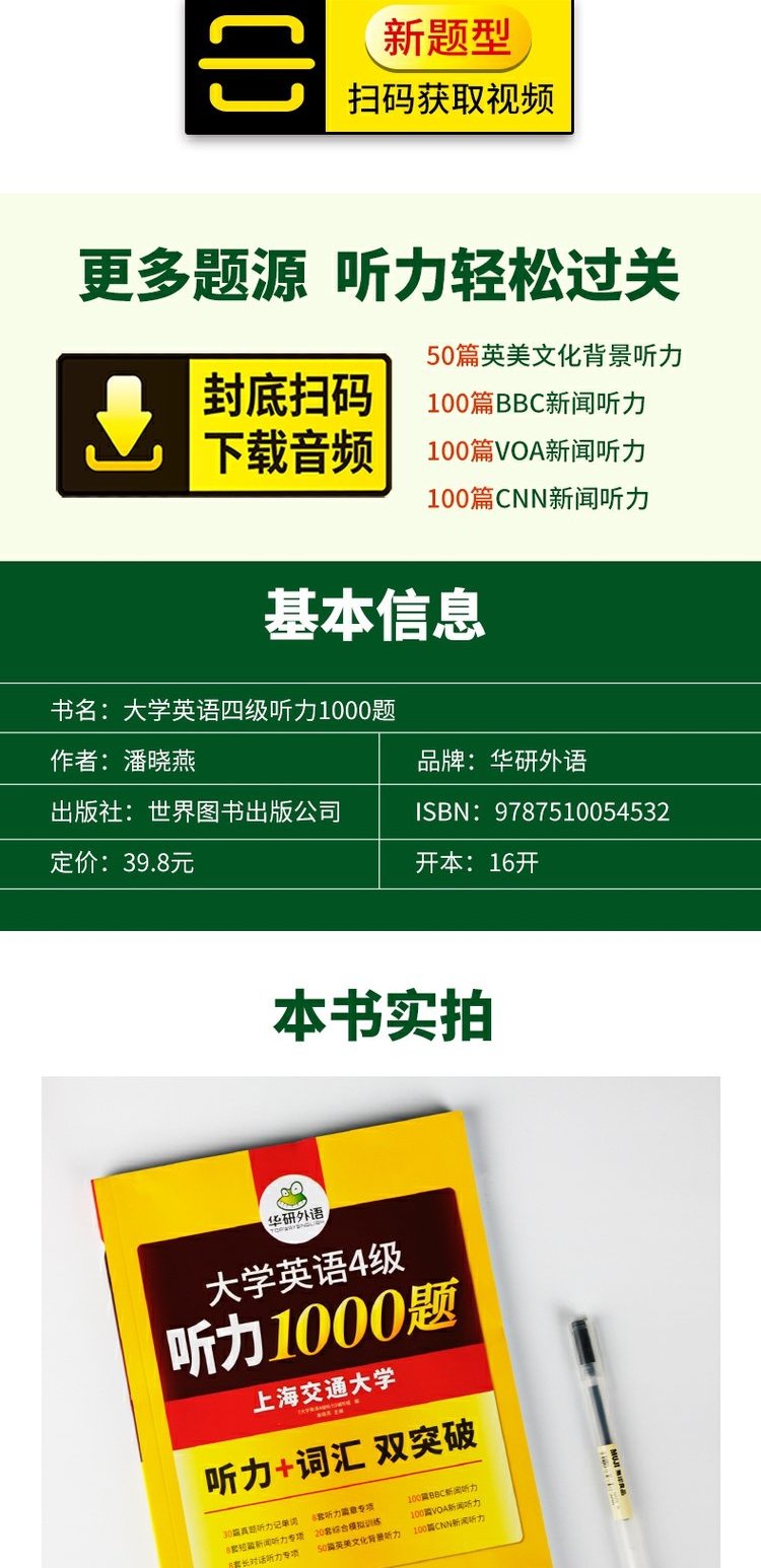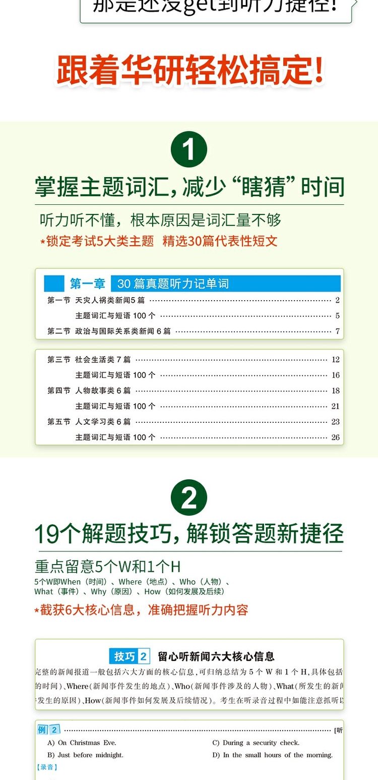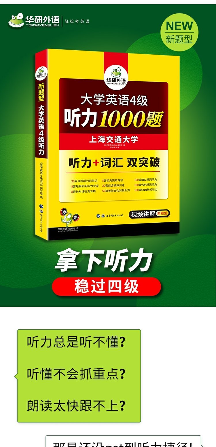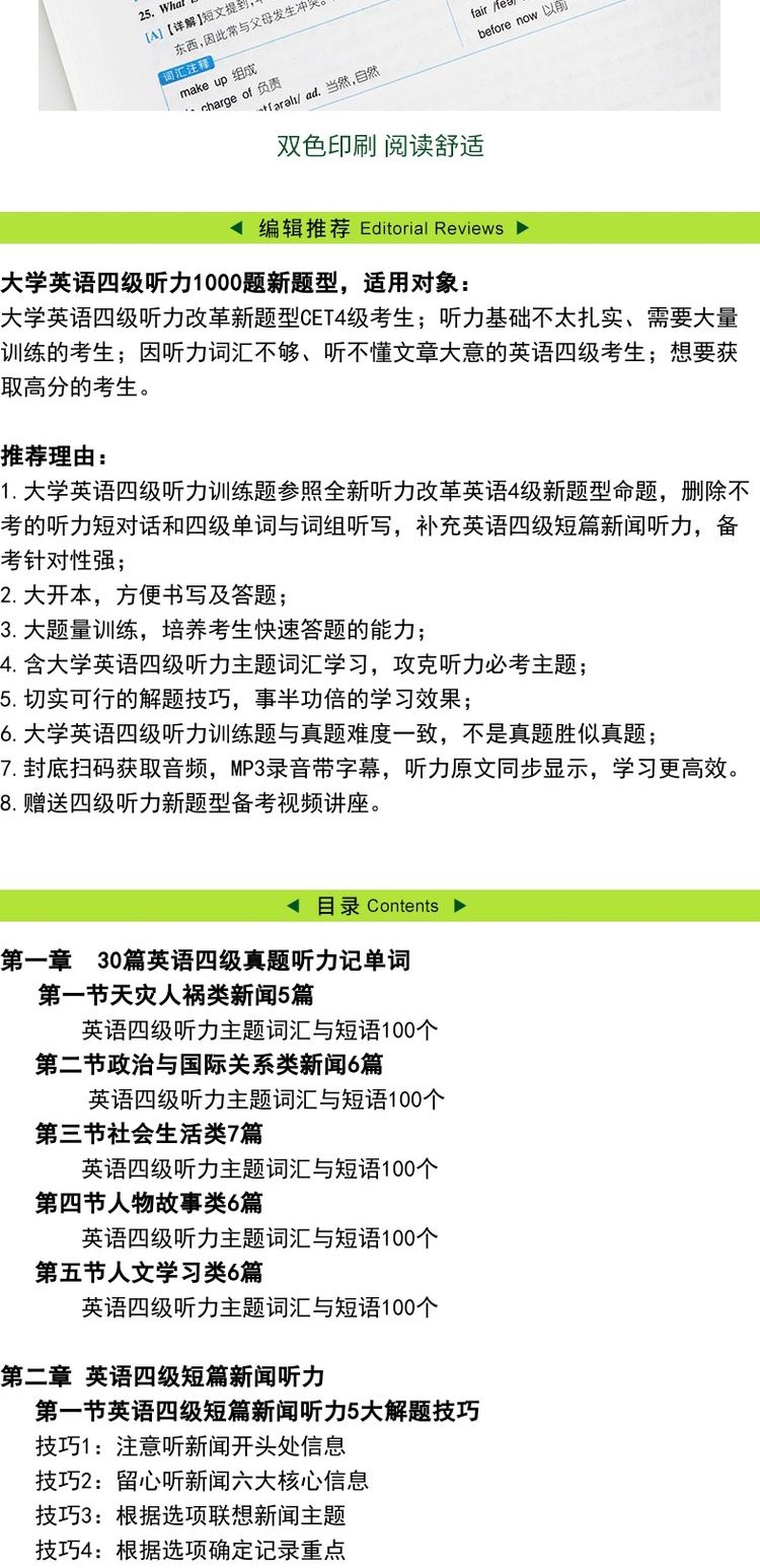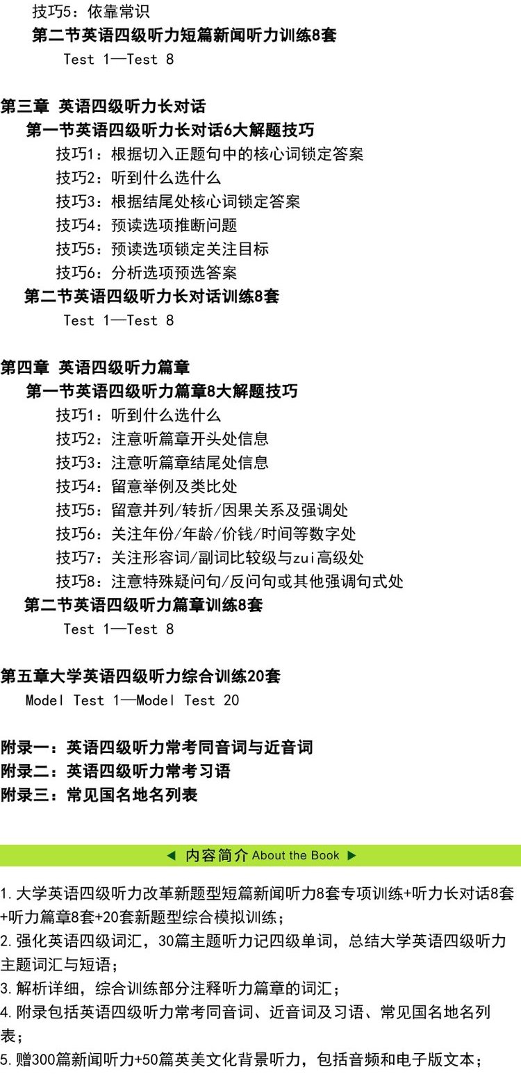 拿下听力,稳过四级!全新改革新题型,30篇代表性短文,快速锁定考试5大类主题,掌握主题词汇,19个解题技巧轻松截获6大核心信息,1000题训练,答题速度快人一倍!
