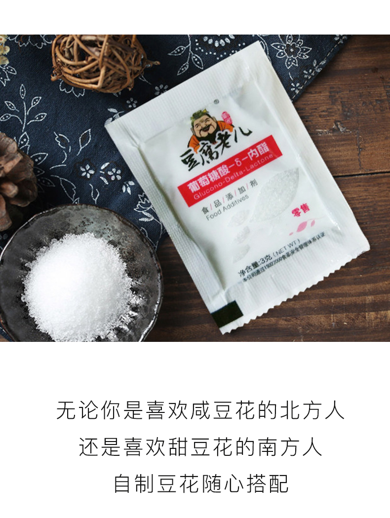 【买盒装二件9折送豆腐模具+白砂糖】豆腐老儿葡萄糖酸内酯,内脂减少蛋白质的流失,使豆腐的保水率提高,质地细腻,口感滑嫩,方便卫生,南北方人,甜咸豆花都可,自制豆花随心搭配。