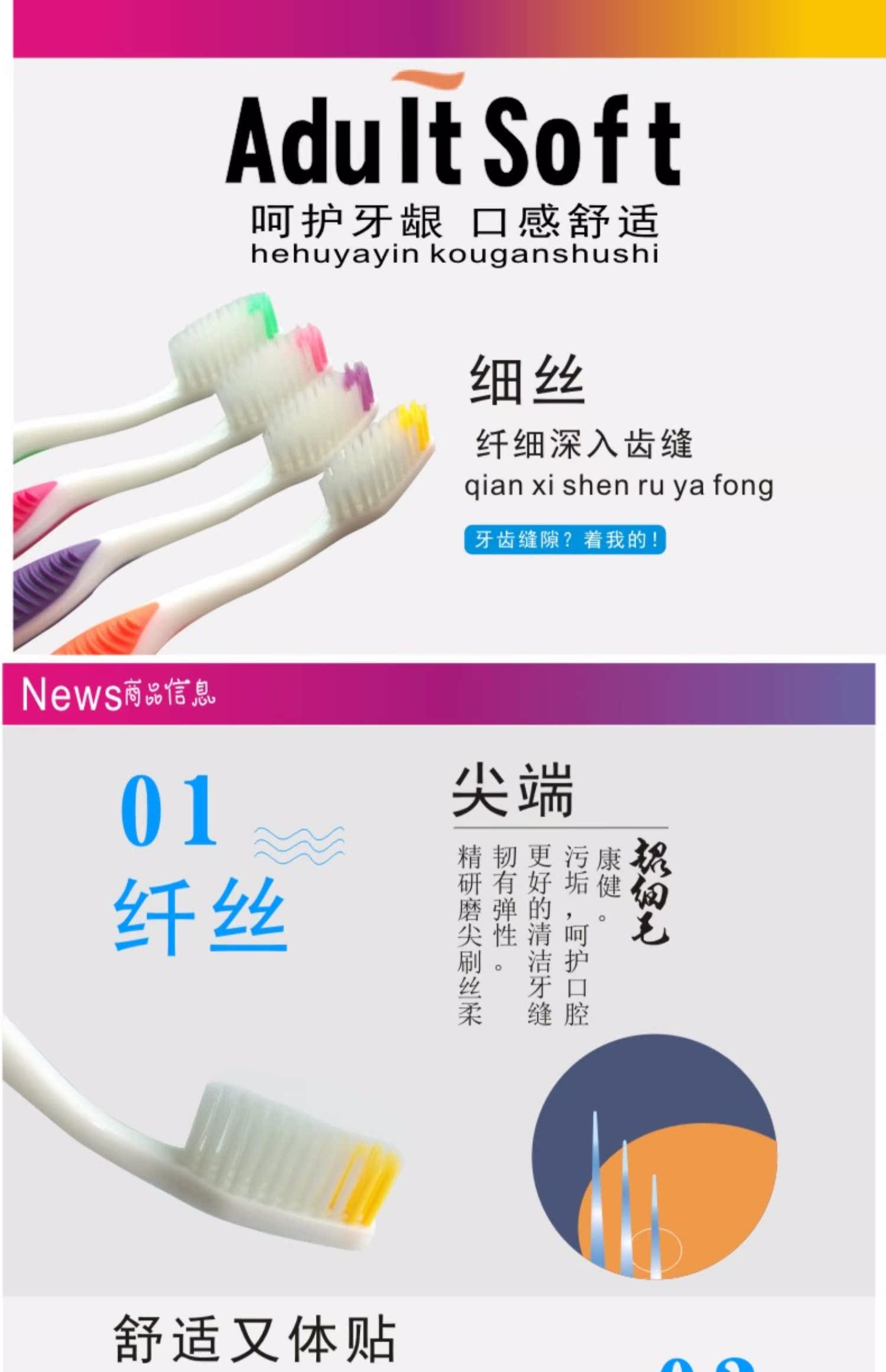 软毛呵护牙龈,防滑手柄,清洁面积大,细丝深入清洁,时尚设计,多彩颜色,10支特惠装,家中常备,来客人,不尴尬。