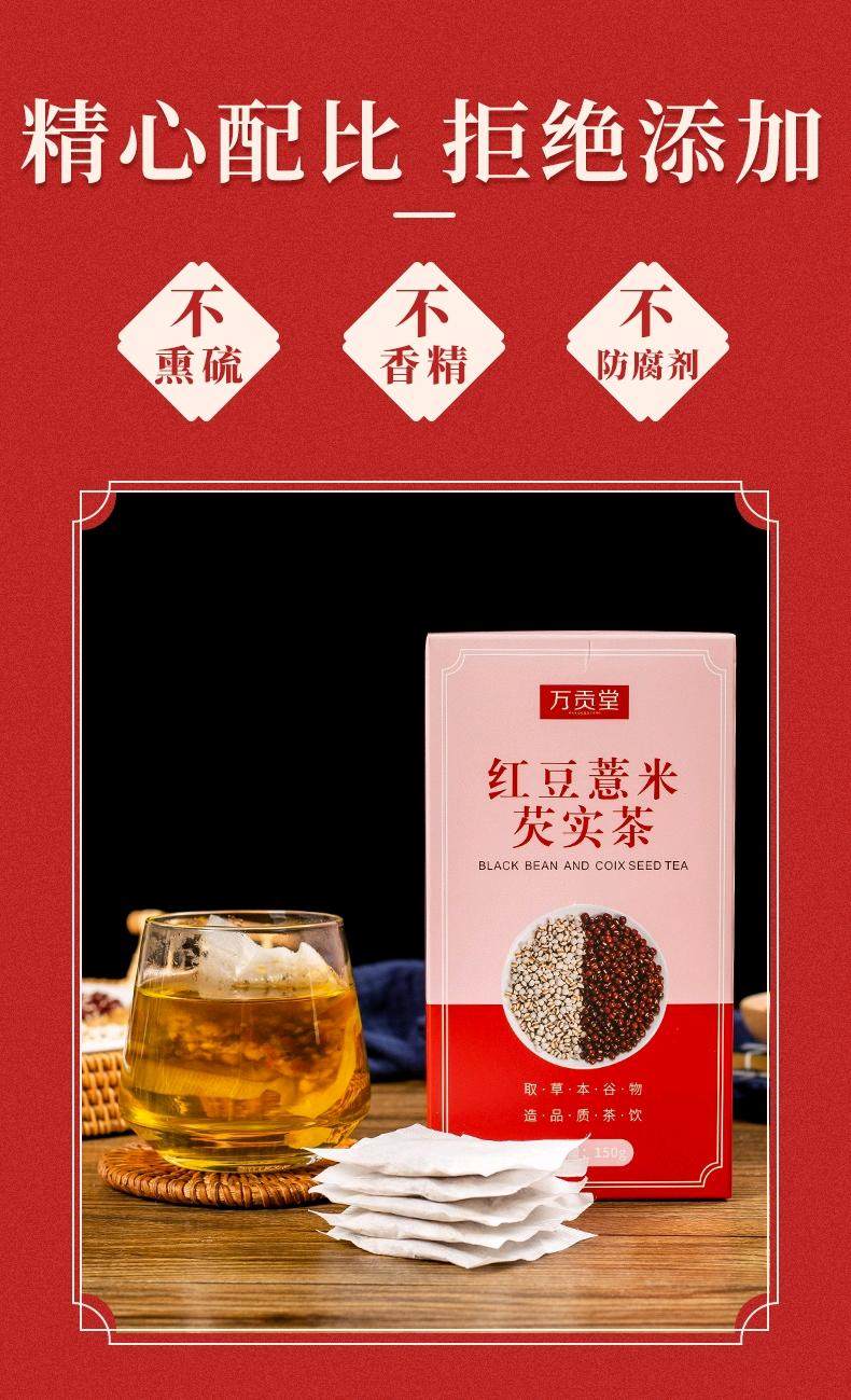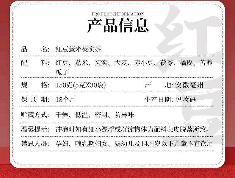 色泽金黄,无添加,口感清香回甘,摆脱身体湿气、不臃肿,红豆薏米芡实茶喝起,排湿养颜,每天一杯,喝出健康好气色,无湿一身轻!除湿就是这么简单!