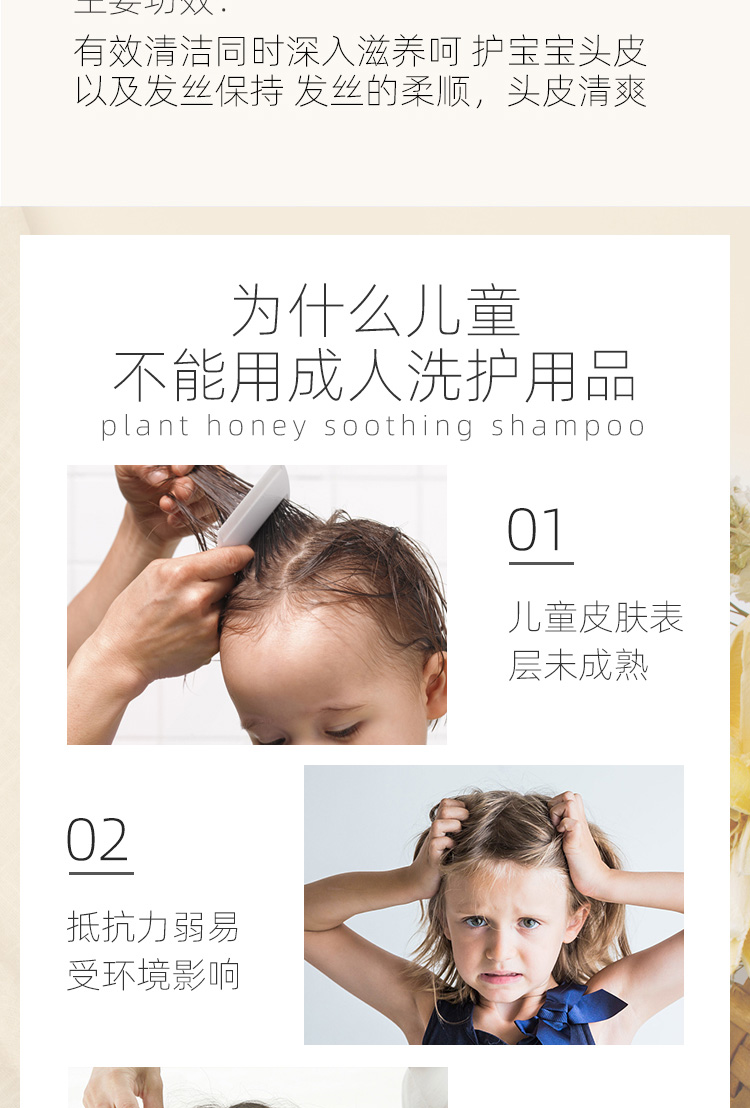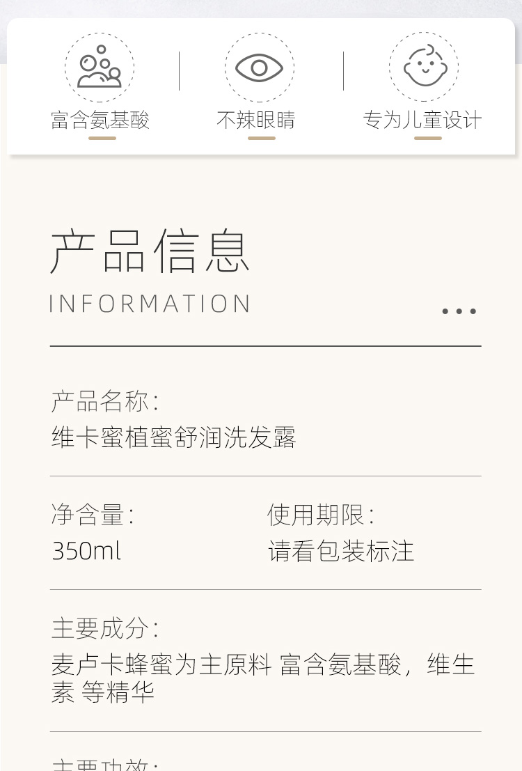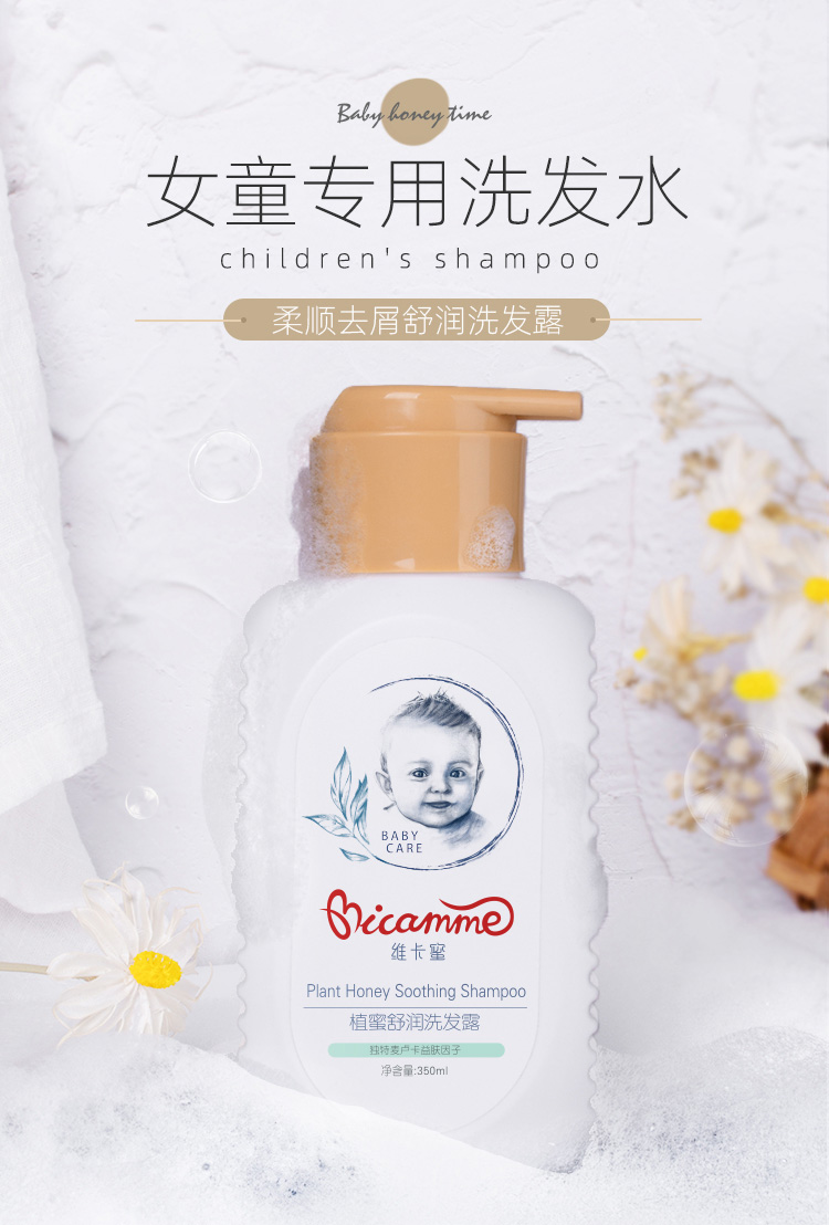 维卡蜜儿童无硅油柔顺去屑洗发水,专注3-15岁儿童肌肤护理,纯植物配方,PH弱酸性,原料温和,不含多种化学成分,更亲肤。气味温和,不刺鼻。