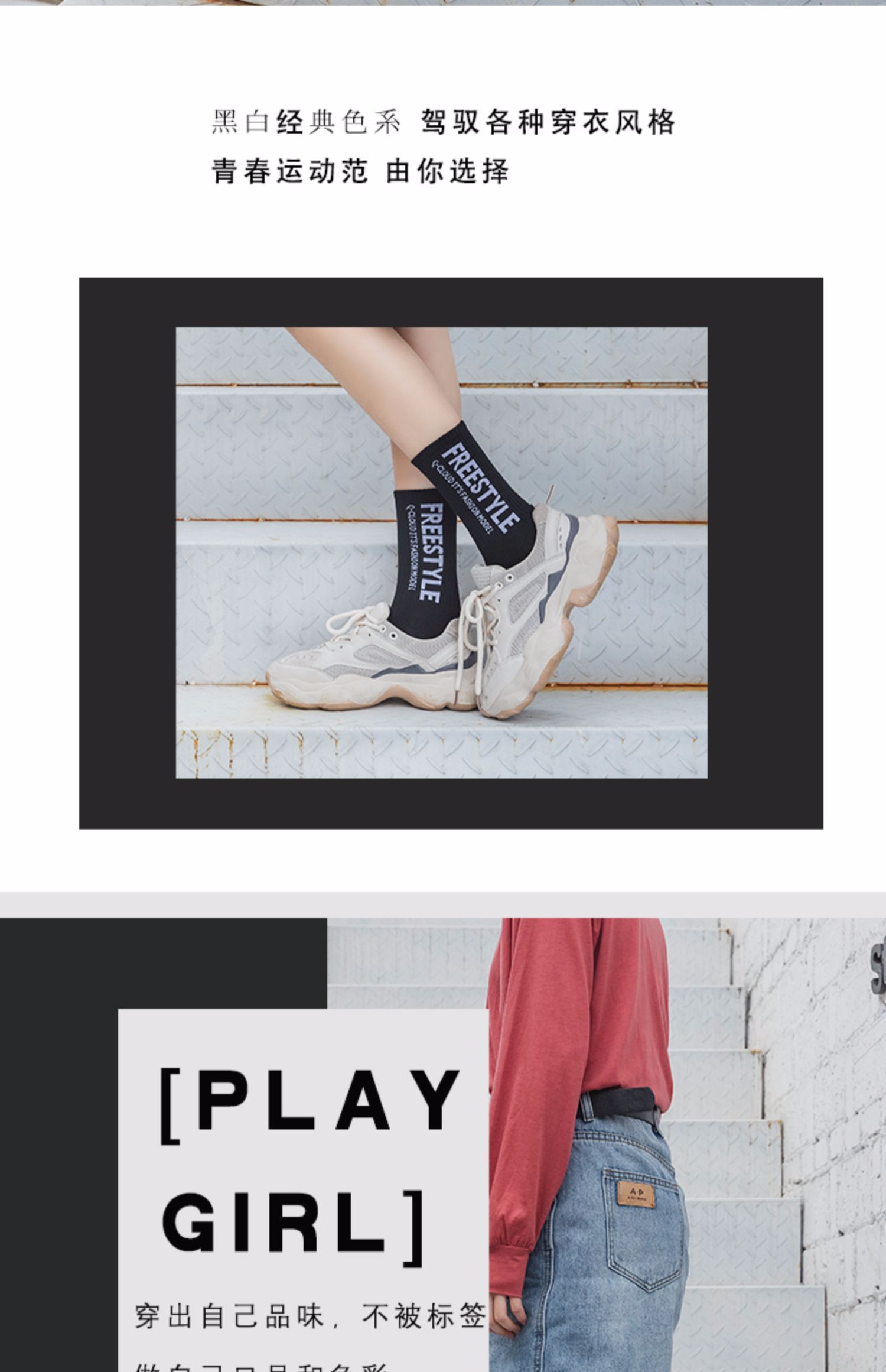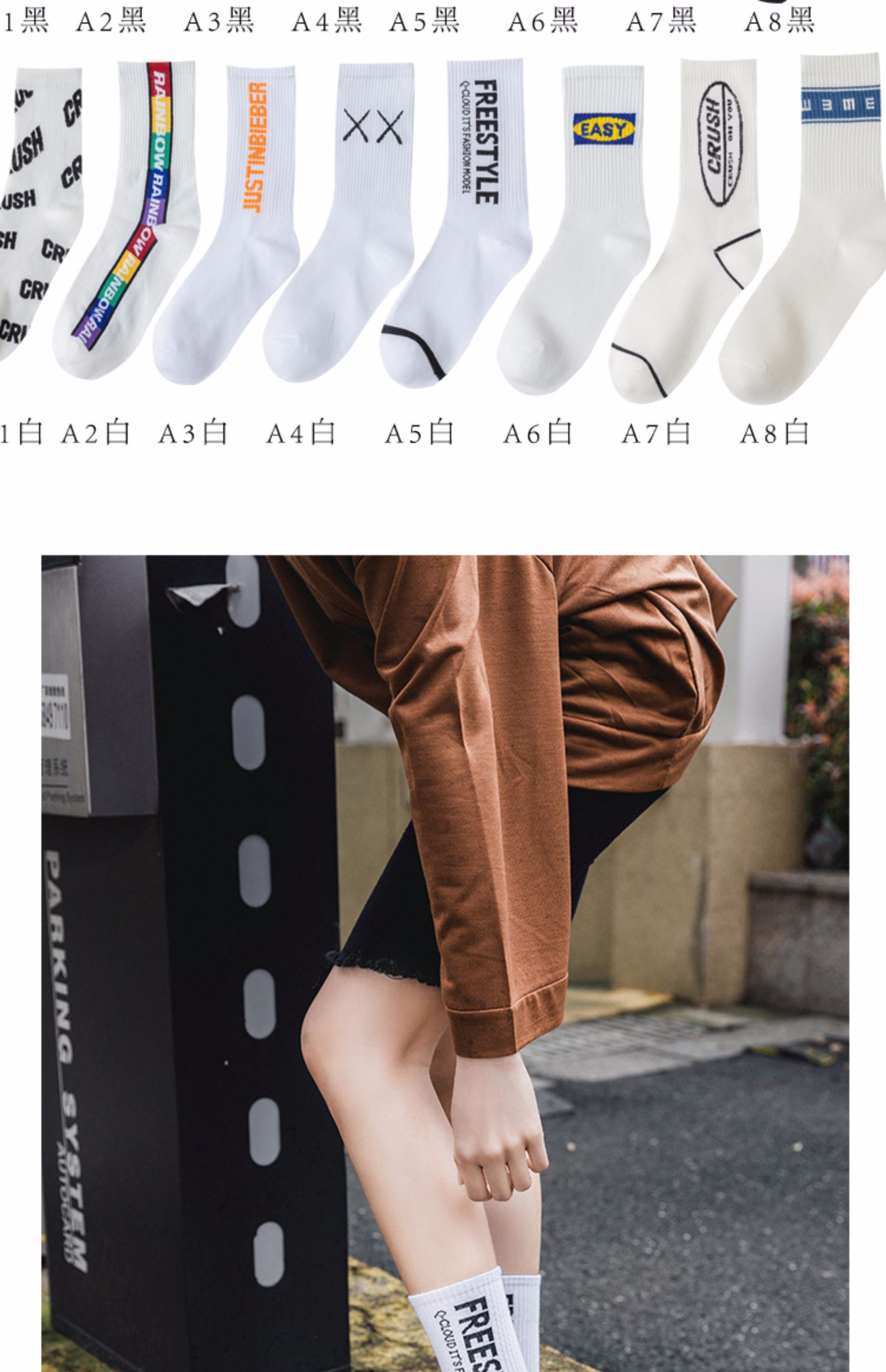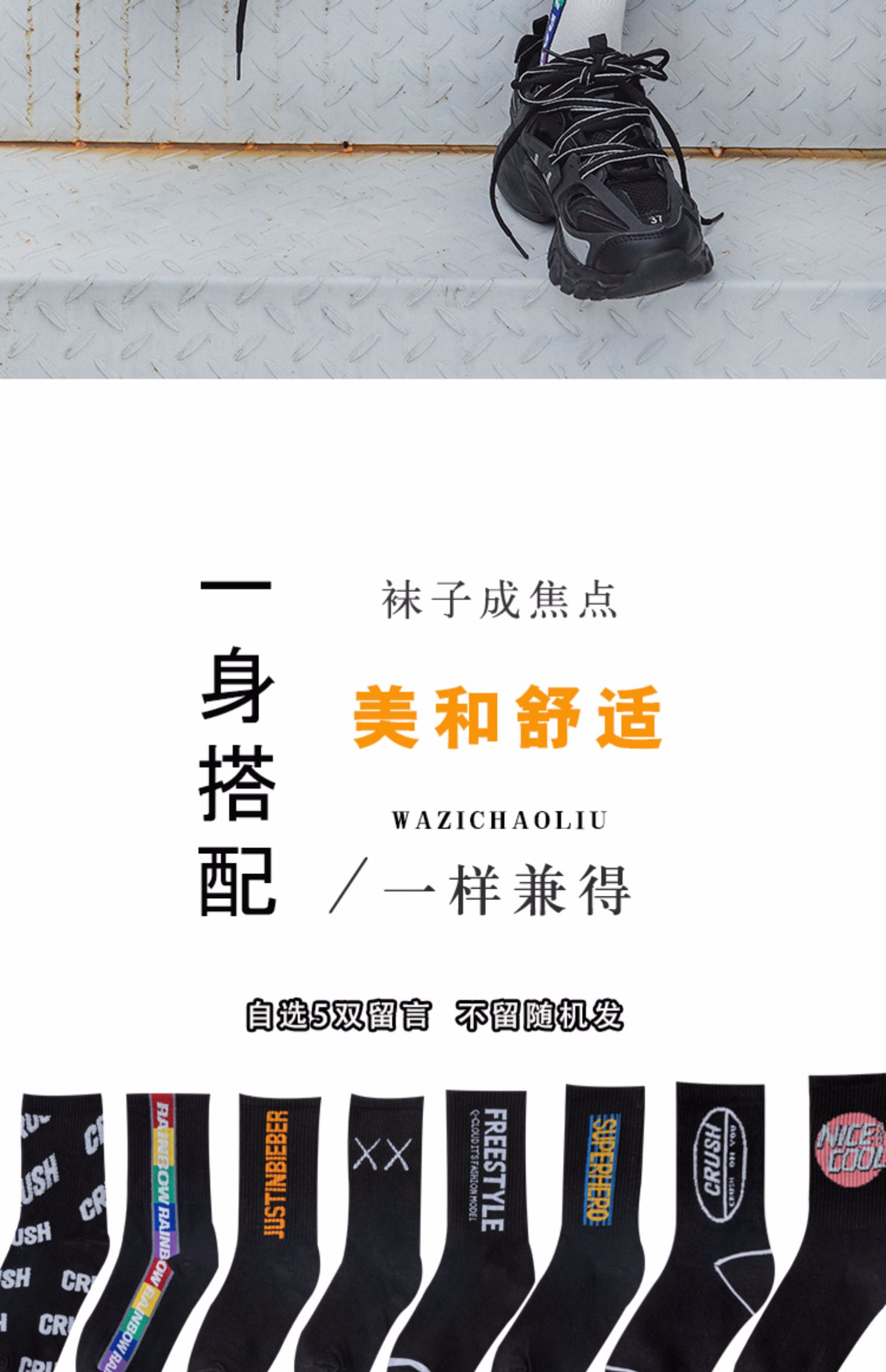 多款运动风潮流中筒袜,INS百搭,无运动不青春,你是否需要一双好看的运动袜,5双装,每天不重样,不论配上你的万斯,匡威或者老爹鞋。长裙或者短裤都很百搭啊~数量有限,动手!