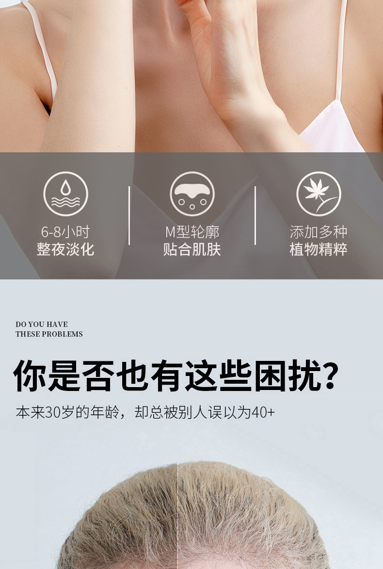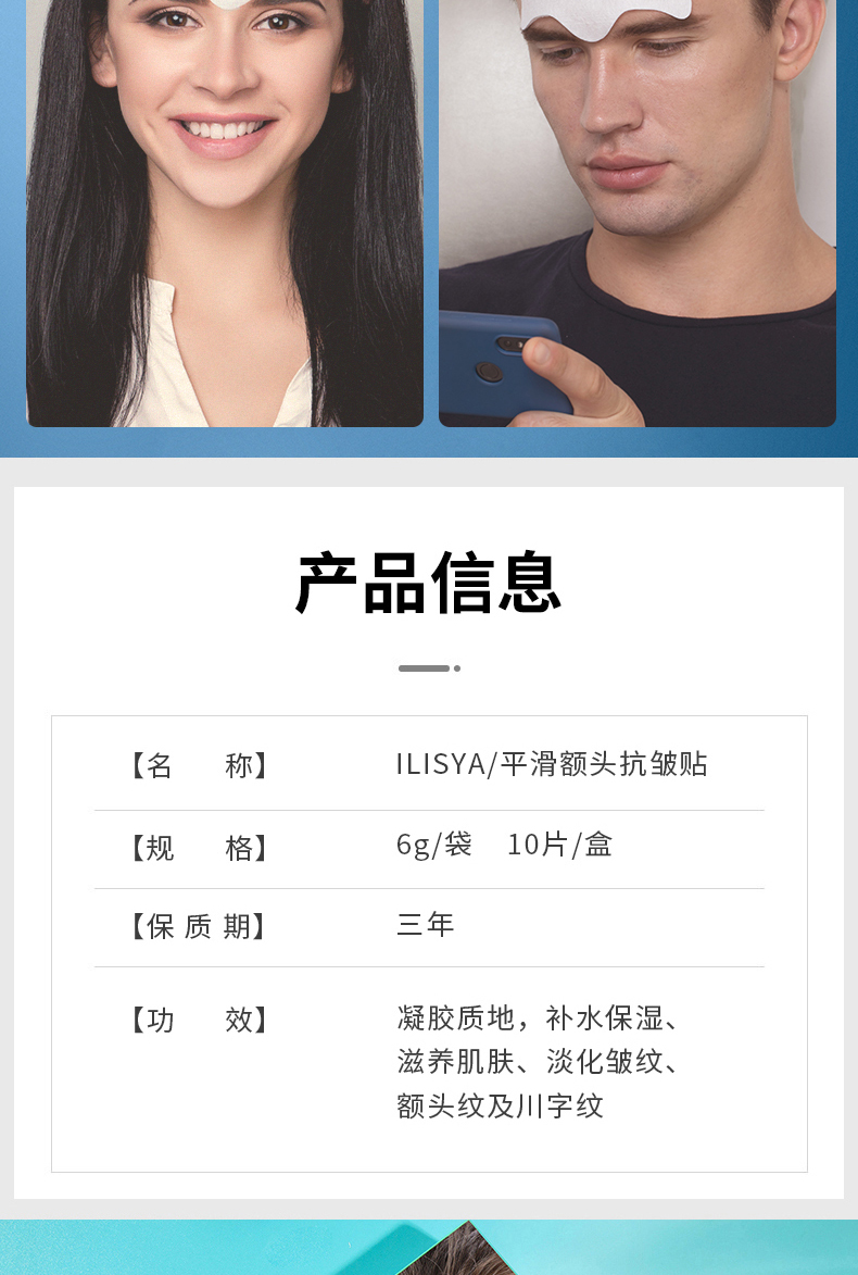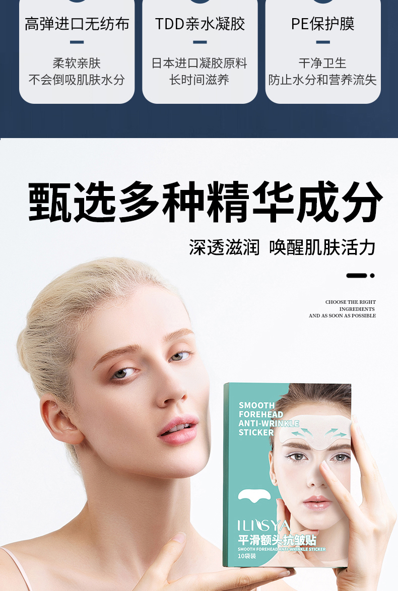 紧致抗皱,告别抬头纹!抚平纹路,收缩眉间肌肉,深层修护,补水提亮,强黏性凝胶层,长时间滋养肌肤,敷一晚,顽固抬头纹不见了!