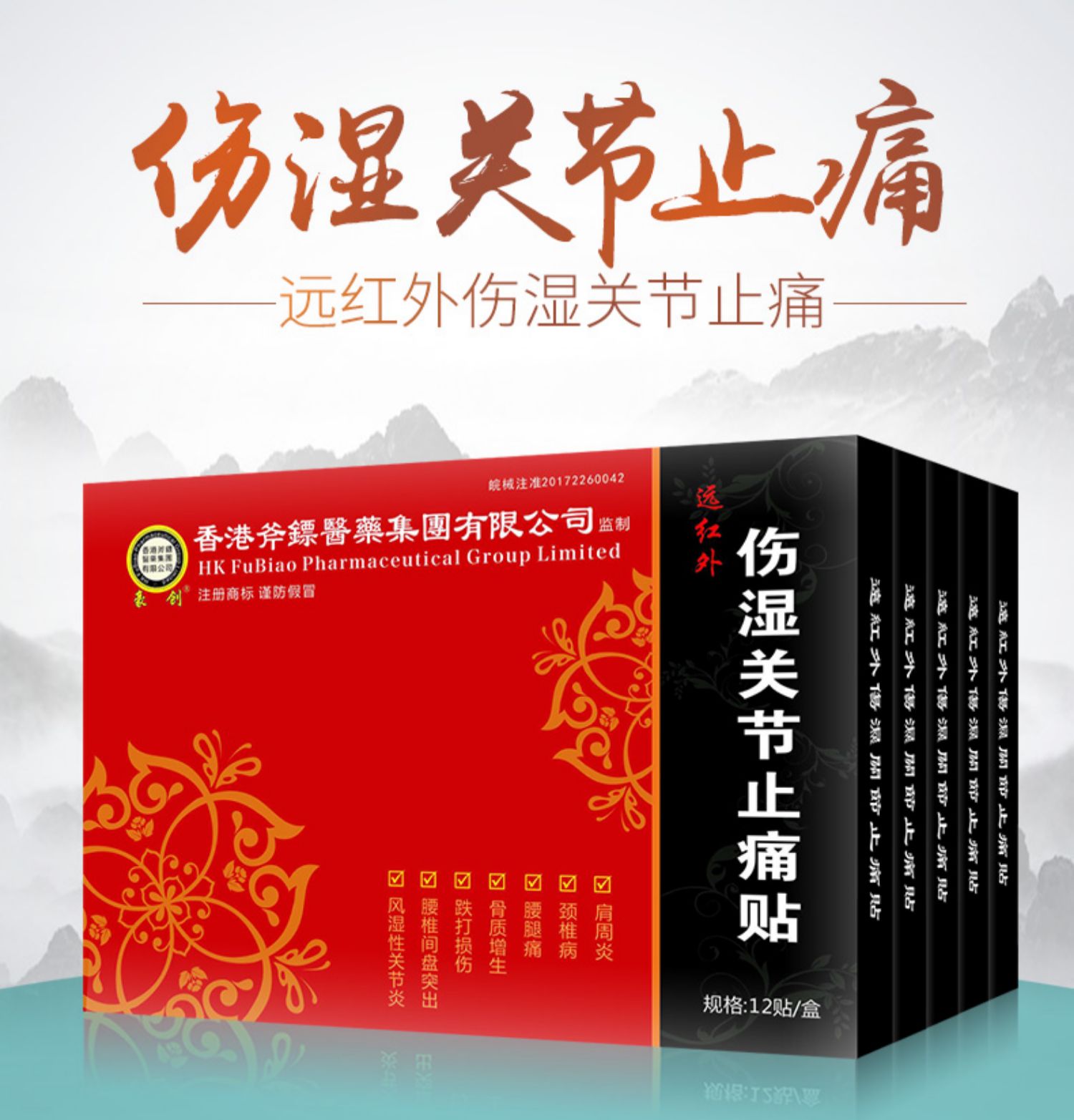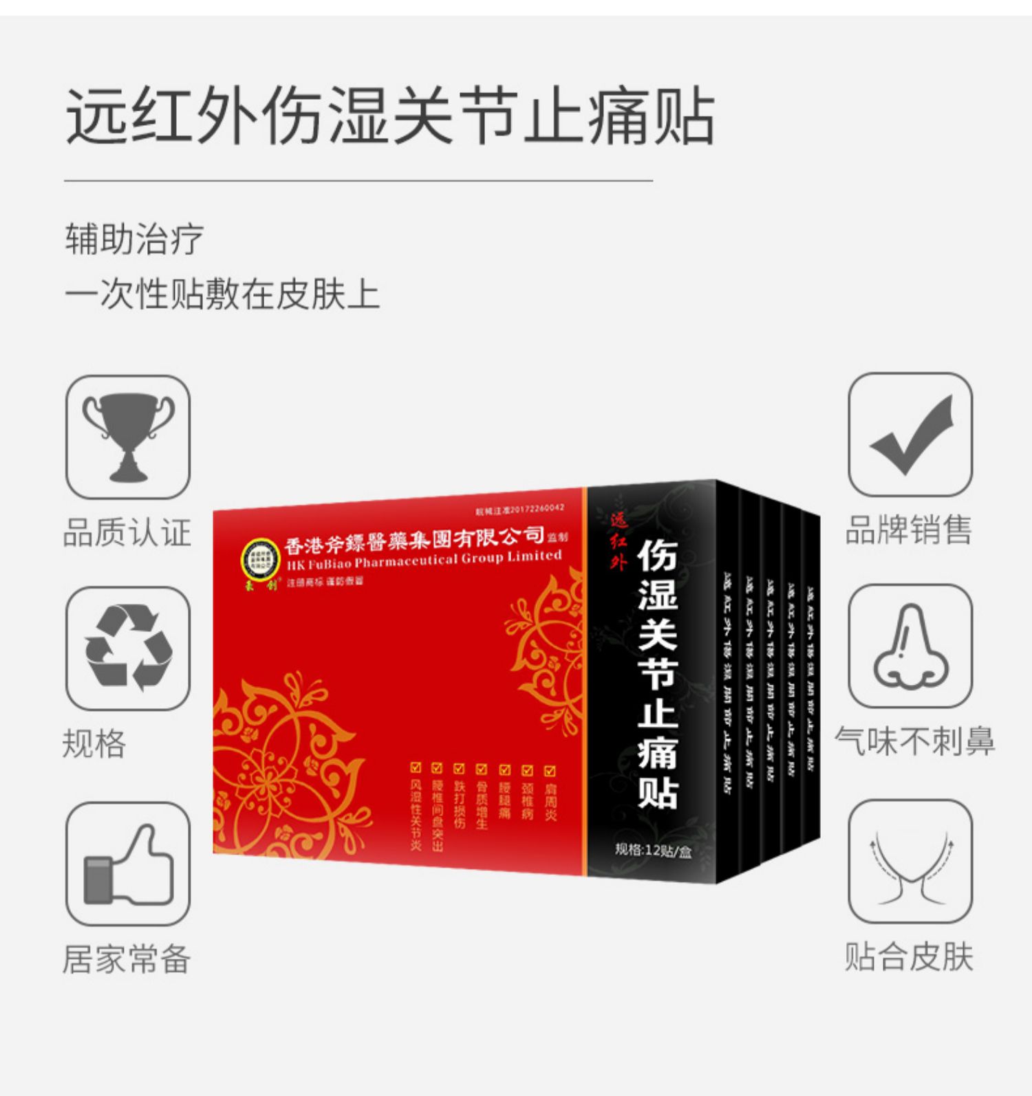 红外伤湿关节止痛贴!香港斧镖医药,线下药店同售!肩周炎,腰肌劳损,颈椎病,腰椎间盘突出,风湿性关节炎,骨质增生,跌打损伤等适用!止痛贴有效时长12-24小时!