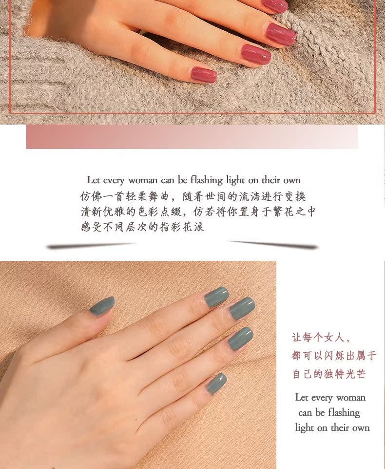 小仙女们种草啦~一款你没有用过的,健康植物甲油胶!持久不掉色,全无毒免烤不含荧光剂,无甲苯不伤手,易上色,持久度长,光泽度强,易干,裸色不可剥,百变指尖,美眉可备