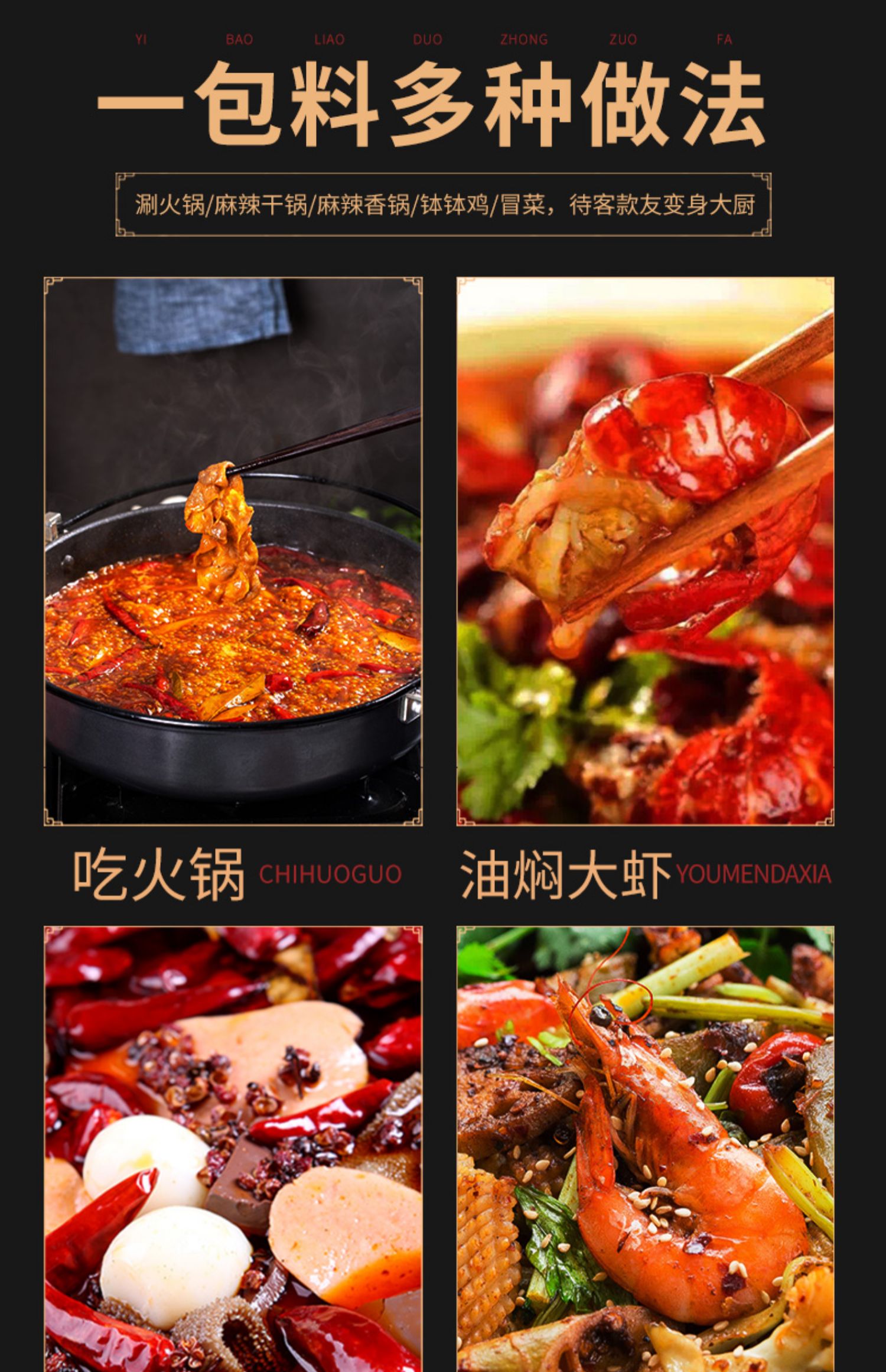 一包料多种做法!吃火锅,毛血旺,麻辣香锅,油焖大虾,等等,麻辣醇厚,香味十足,好吃不上火,买底料,就买九眼桥,川渝人都知道!囤起来!【赠运费险】