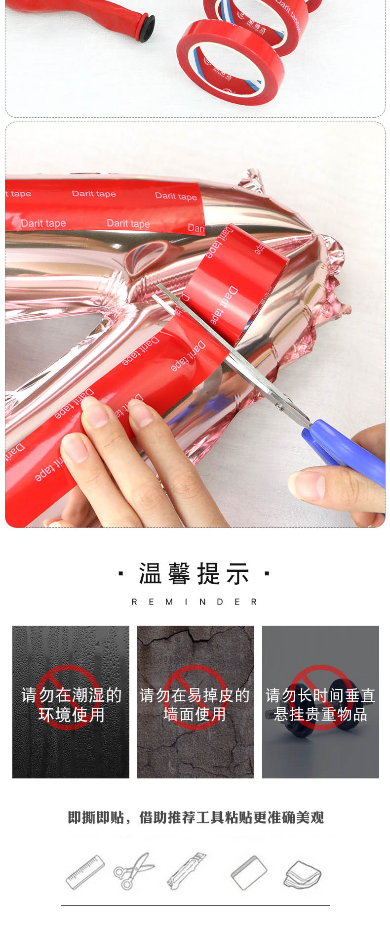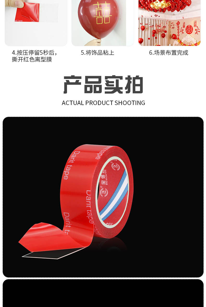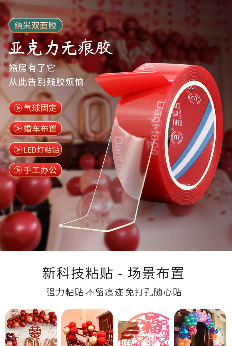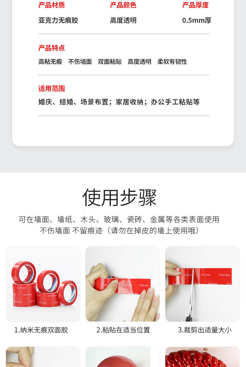双面胶,高粘性耐磨,DIY制作,婚庆,包裹打包等各种用途,超强力高粘度,耐高温,超防水,抗拉伸,无残胶,应用范围广,随意粘贴。