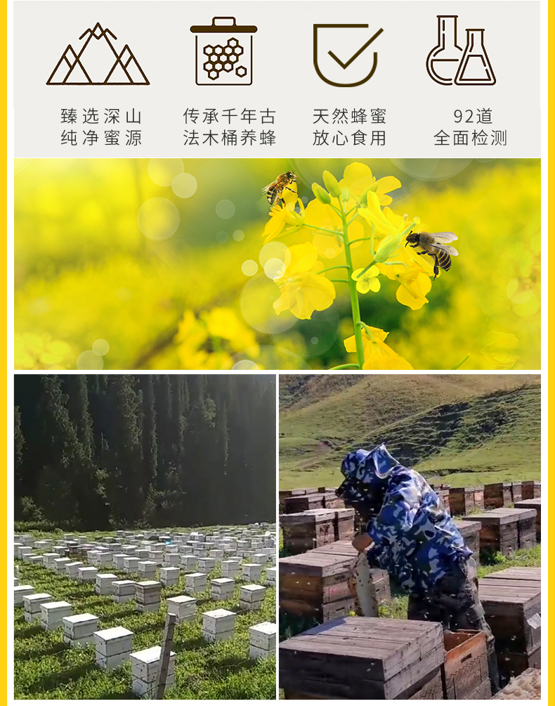 【假1罚万元】纯正农家自产高原山花蜜,来自青藏高原海拔3000米以上的山花,每一滴花蜜均为自然成熟,无人工添加,木桶养蜂,安全健康,放心食用,送大润发勺子。