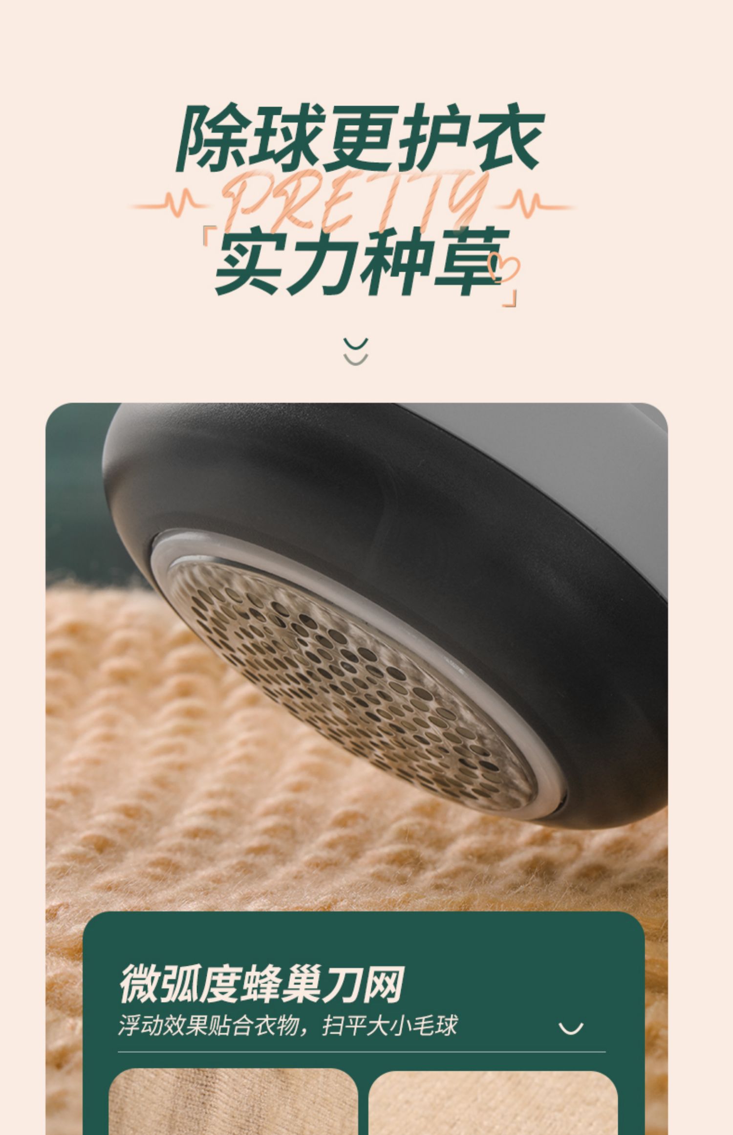 【一键去球,续航持久】高颜值外观,一键启动,旋风刀头,快速去球不伤衣,一体储屑,续航持久,不用反复清理,充电,让冬天更简单!