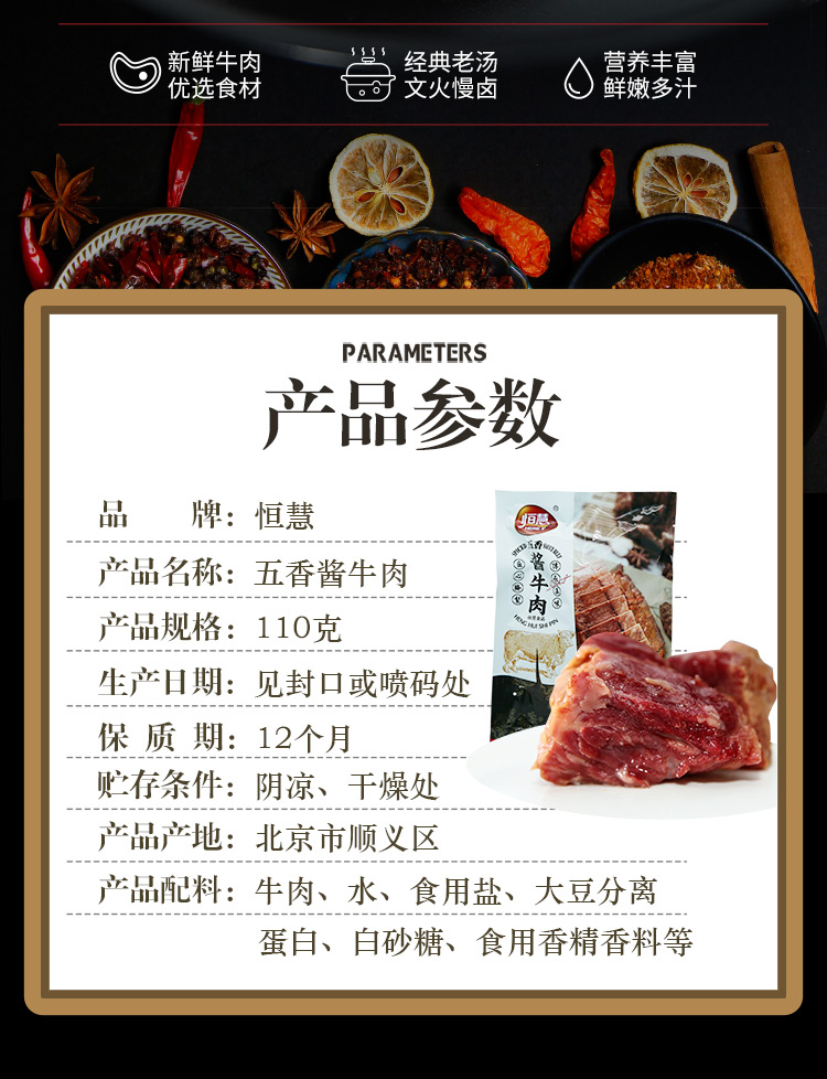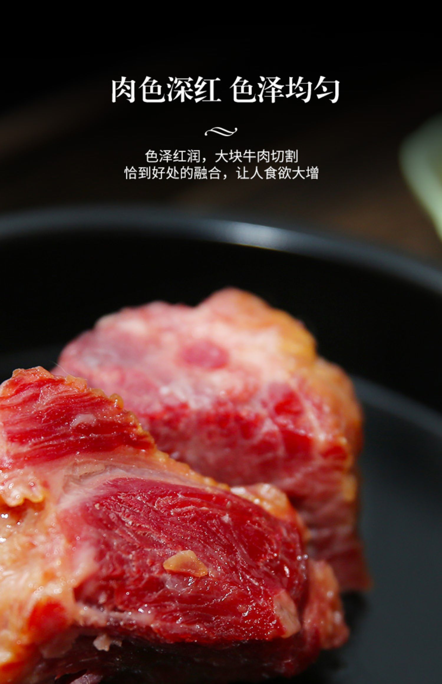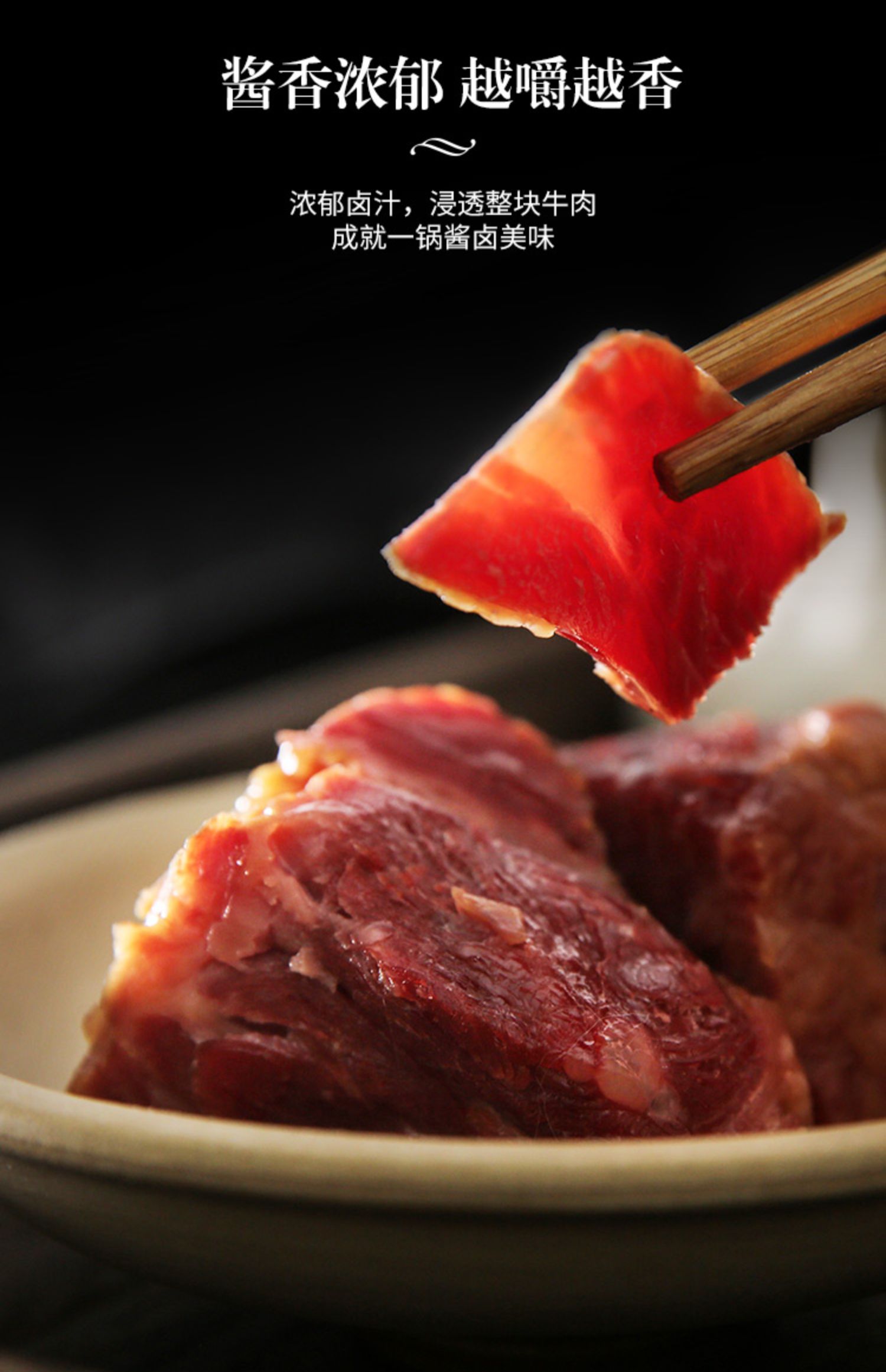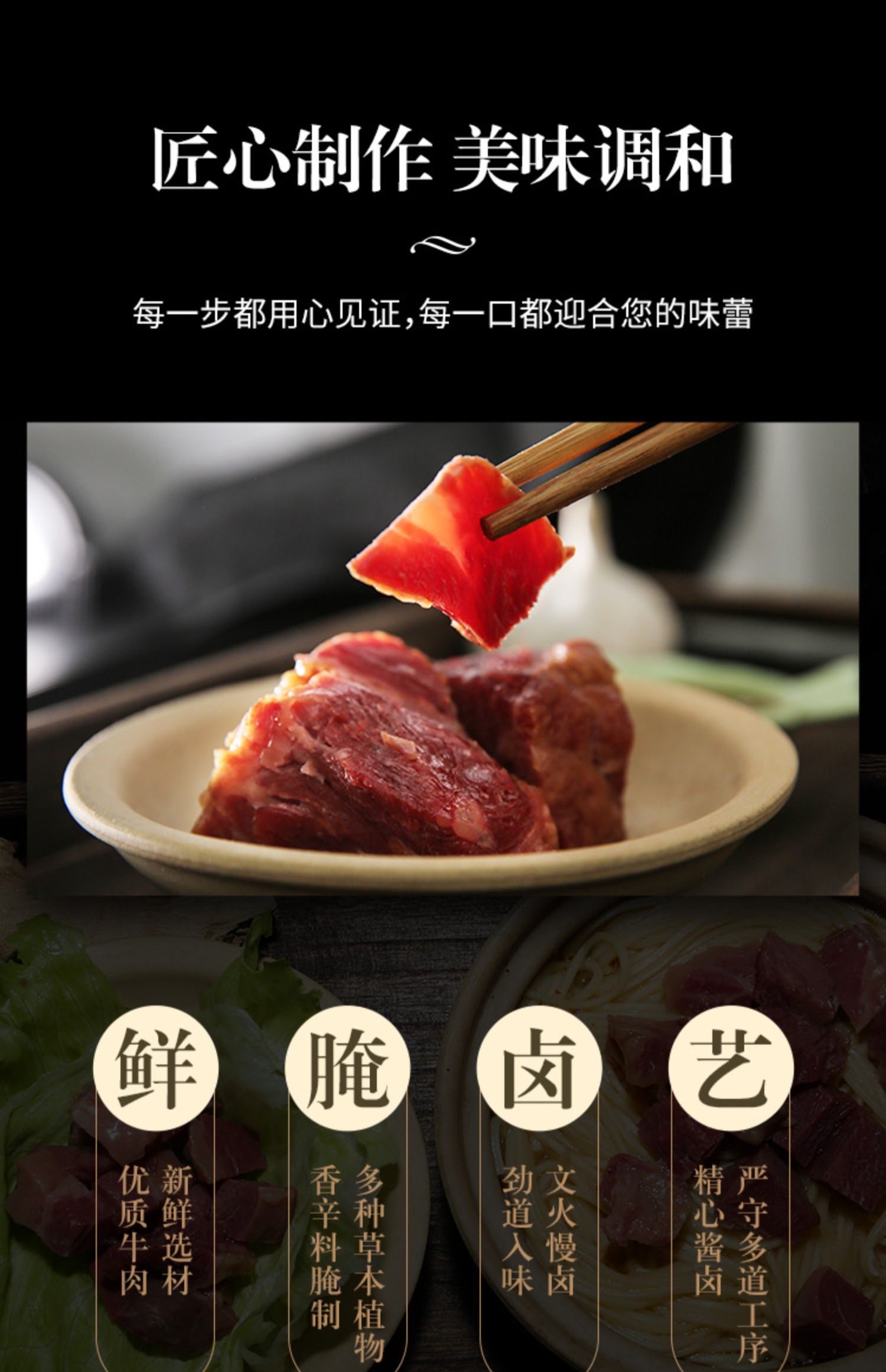 精选大块上等牛肉,肉感鲜美,瘦而不柴,口味纯正。秘制卤肉配方,择纯正香辛料,老卤慢火精心卤制,浓香味美,味蕾享受,唇齿留香。【赠运费险】