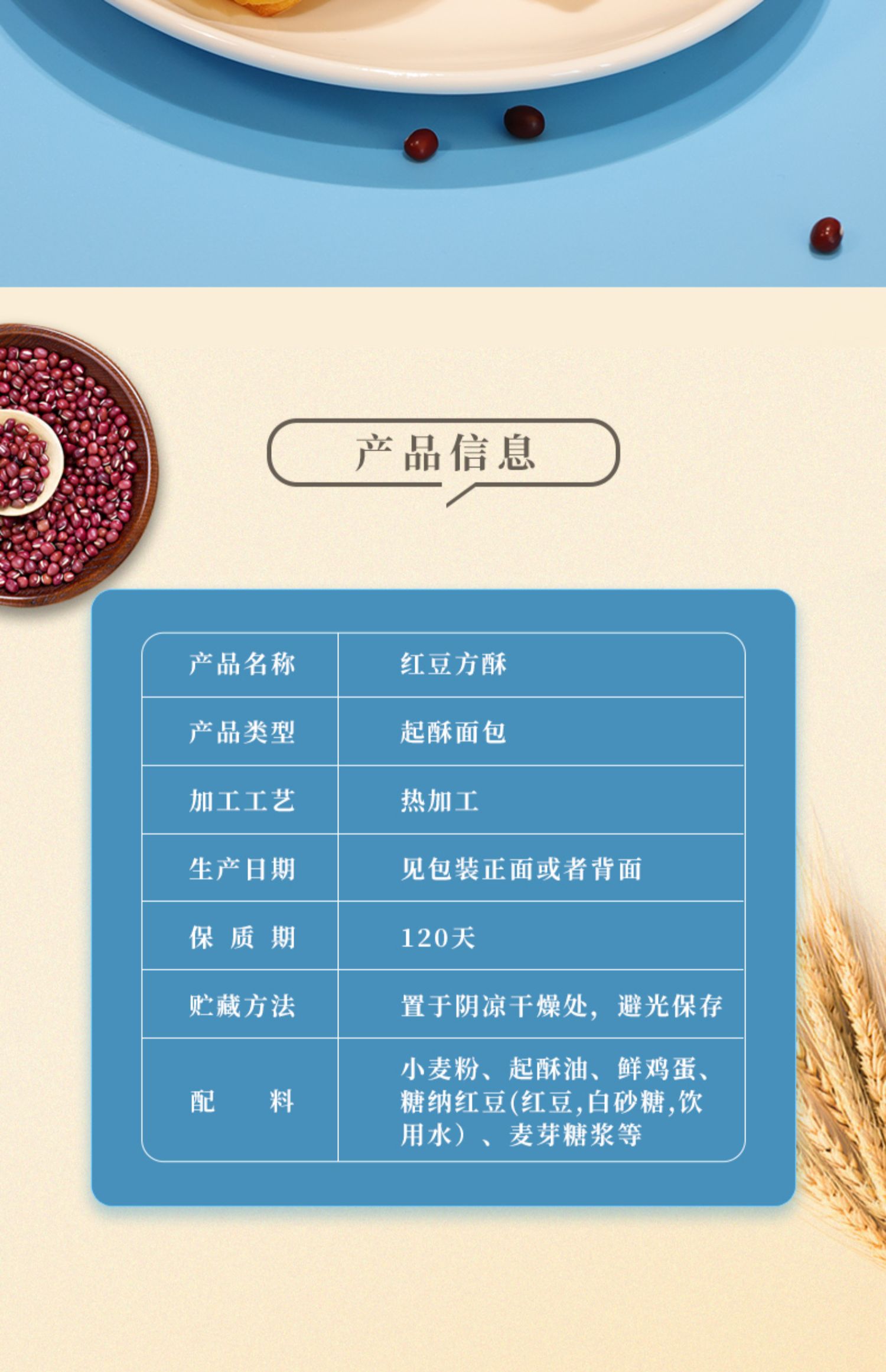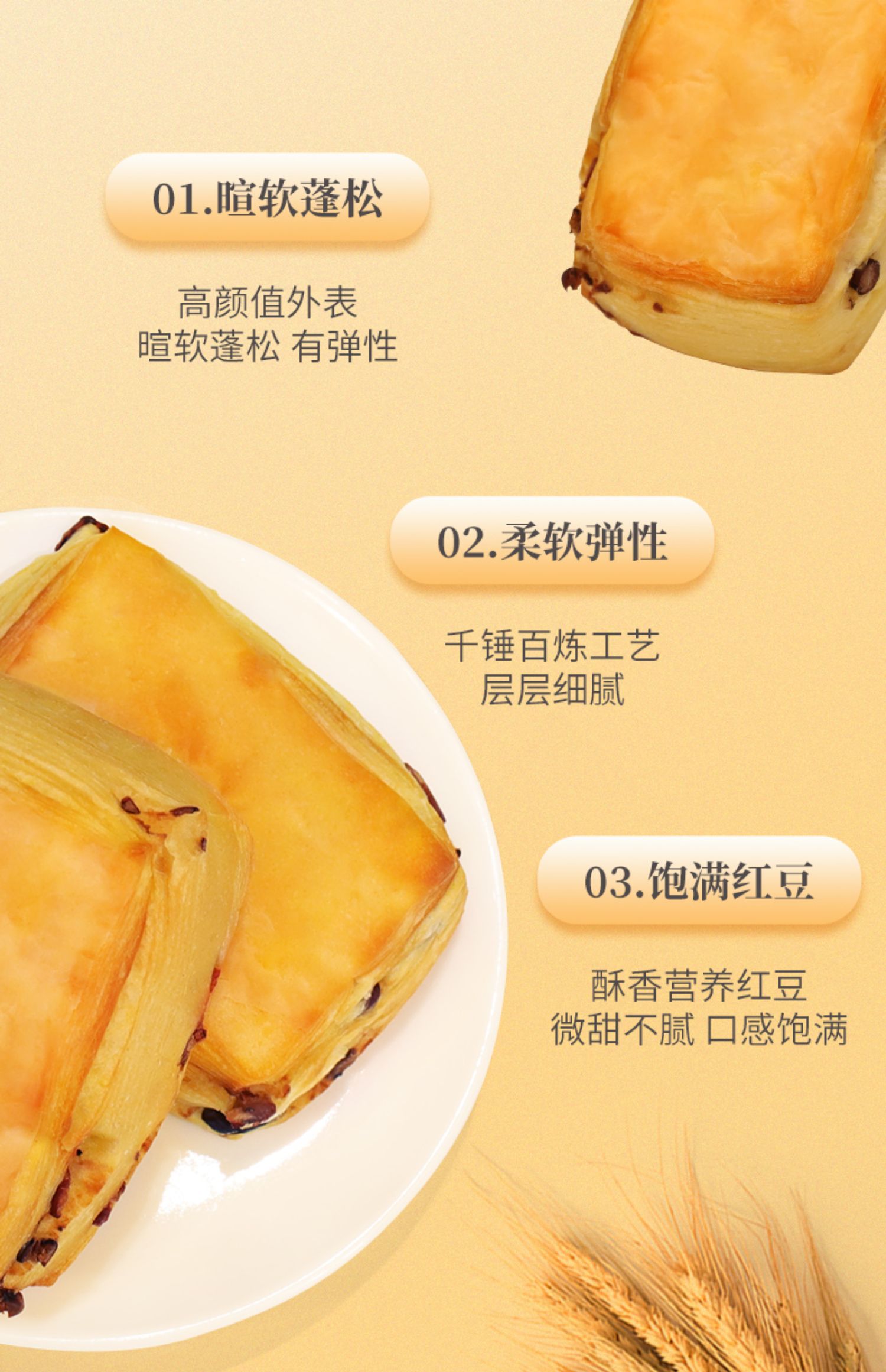 高颜值外表,暄软蓬松,有弹性,千锤百炼工艺,层层细腻,酥香营养红豆,微甜不腻,口感饱满,独立包装,方便实用,包装锁鲜升级,更好锁住新鲜,随时随地享受美味。