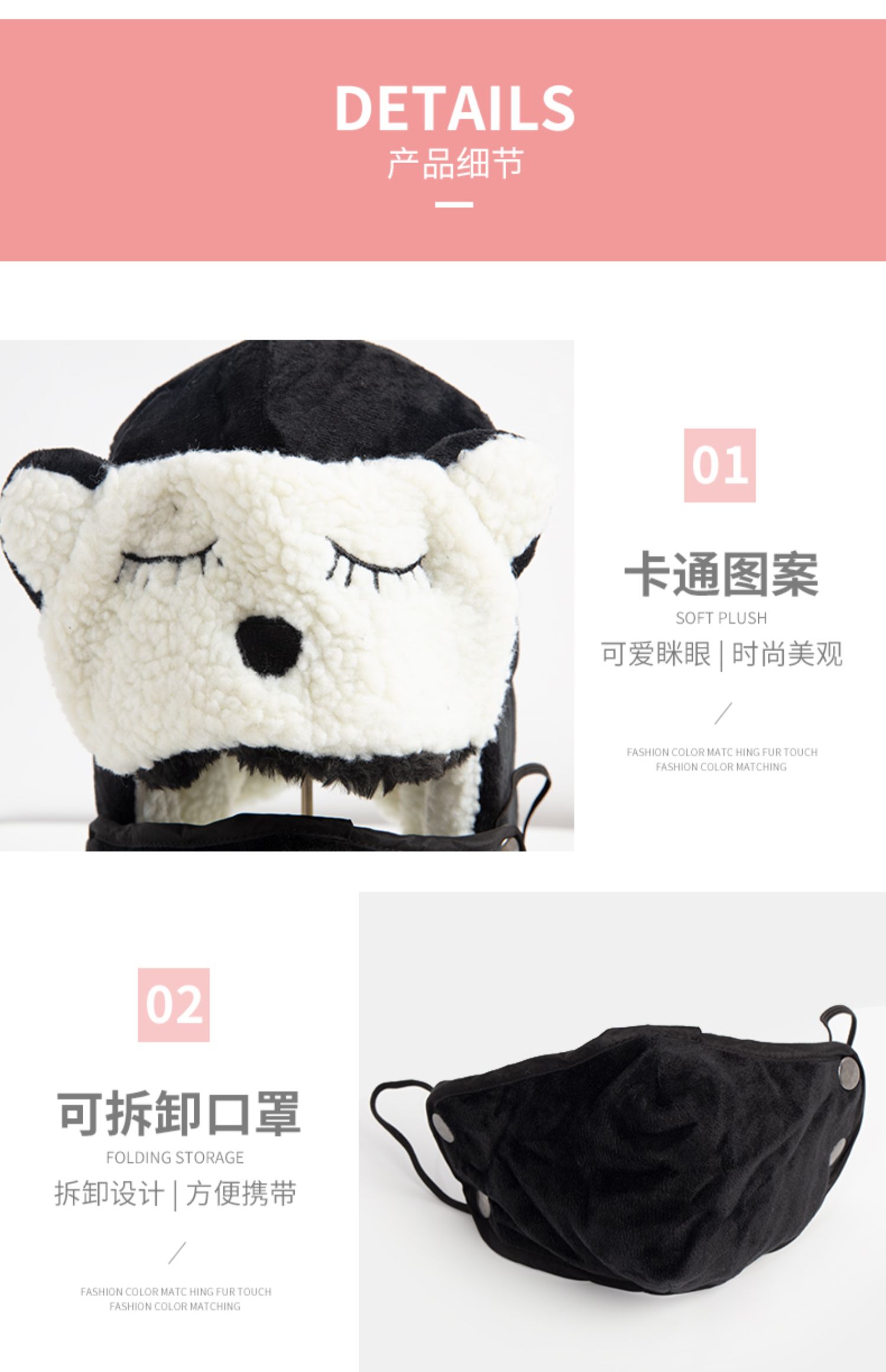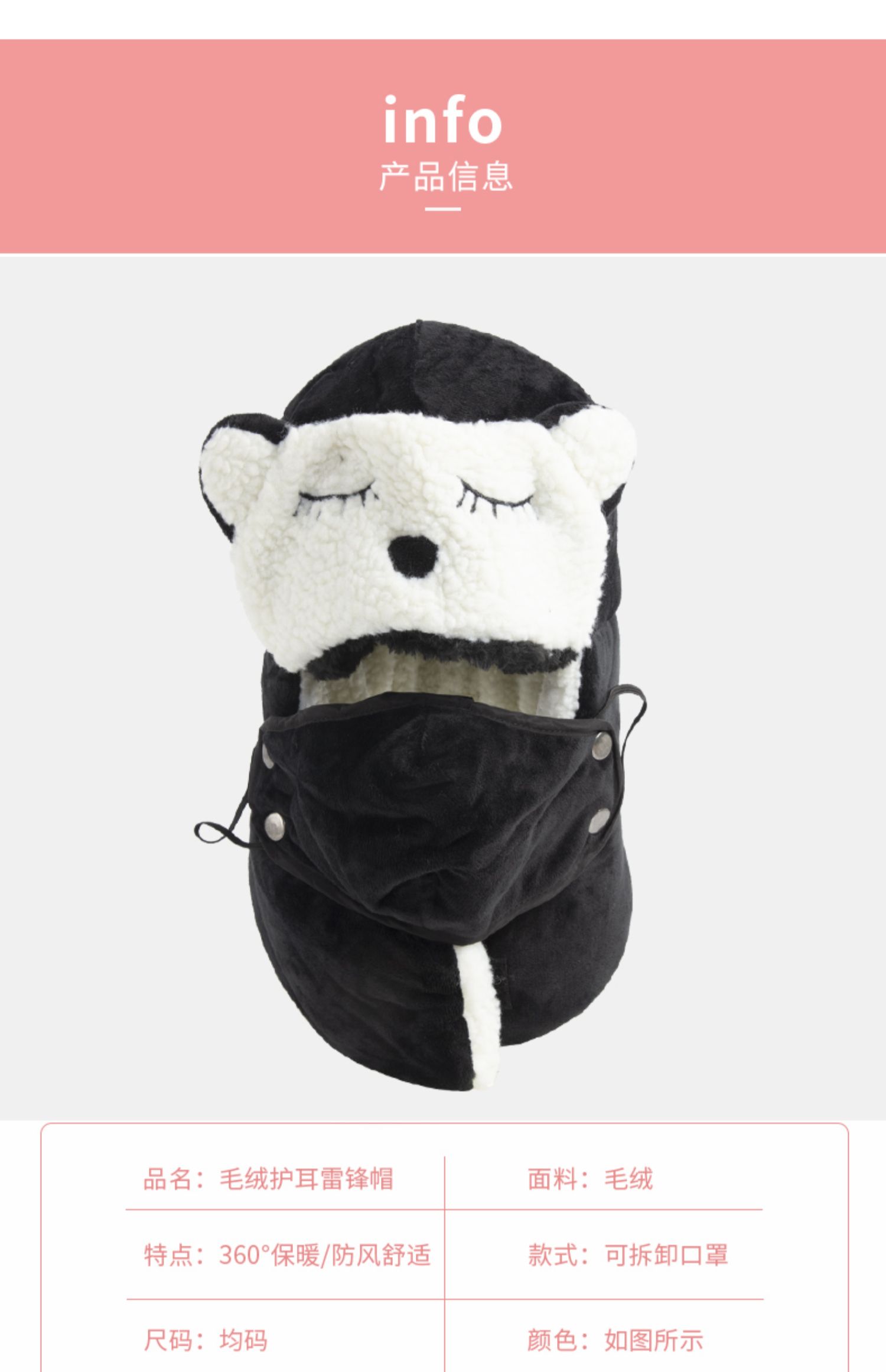 萌萌的保暖卡通雷锋帽,保暖卖萌两不误,毛绒厚厚堆叠,360°护耳护颈保暖,帽子+口罩+围脖三合一,合适各种头围,多色可选,小仙女们,赶紧入手呀!