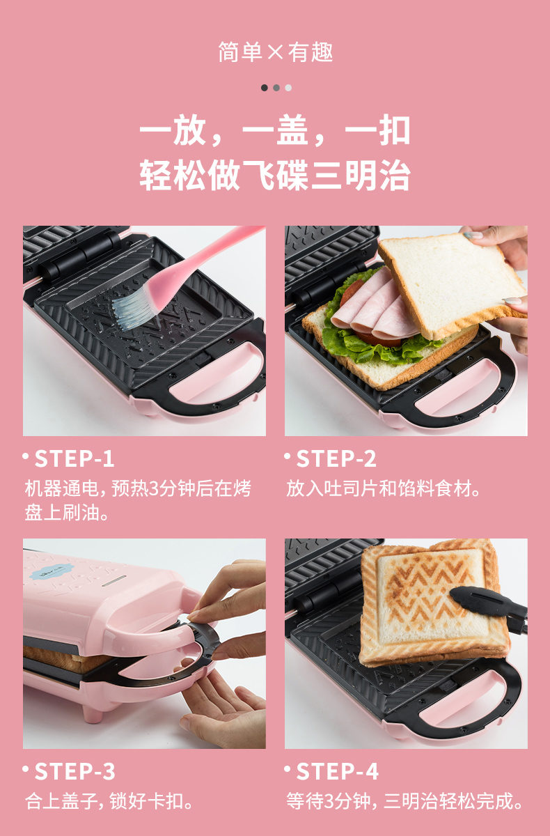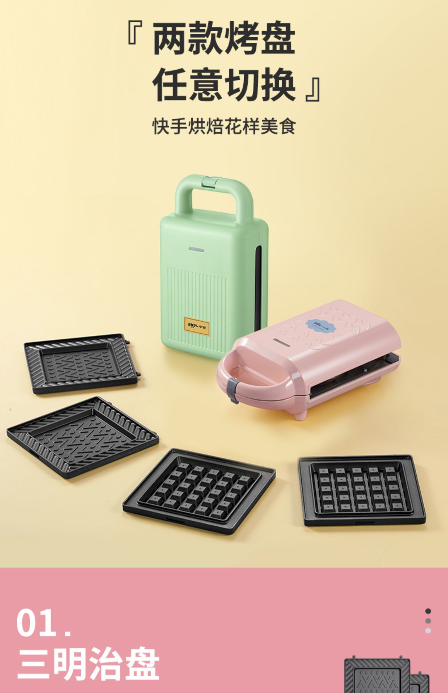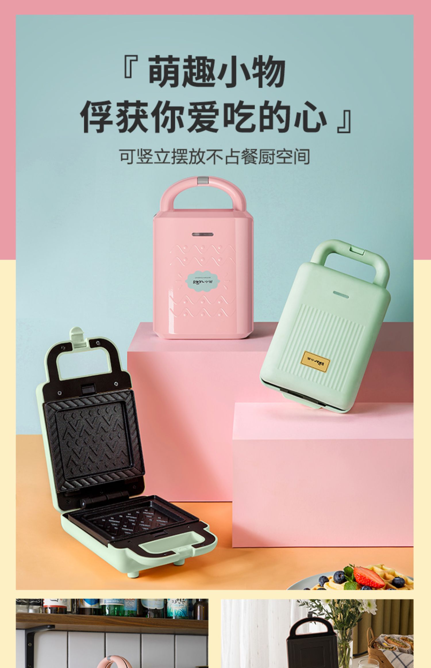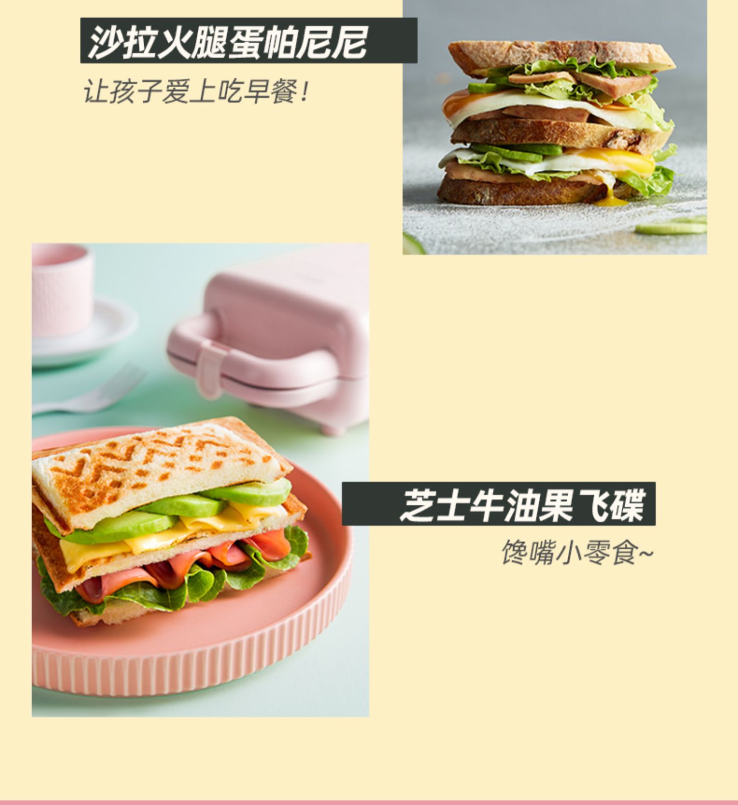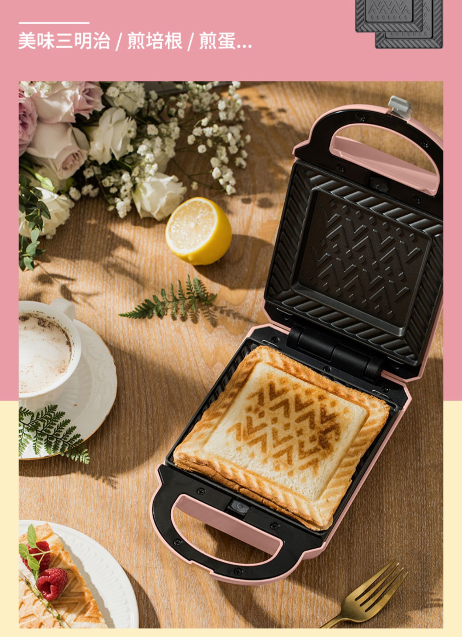 网红轻食机3分钟搞定早餐,不粘烤盘双面加热.可拆卸双面烤盘,小巧轻便不占大位置,花样早餐三明治、煎培根、煎蛋~