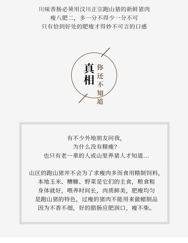 独特的川式风味,严格采用新鲜猪肉,腊味纯正,香甜爽口,四六肥瘦,无添加无色素,醇香有嚼劲,可炒,蒸,做煲仔饭,记忆中的老味道,吃货们赶紧行动!