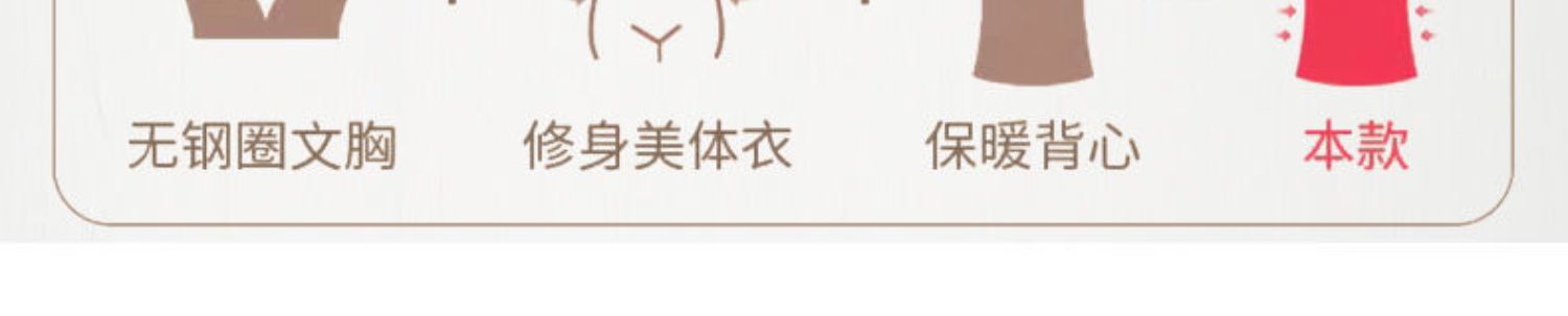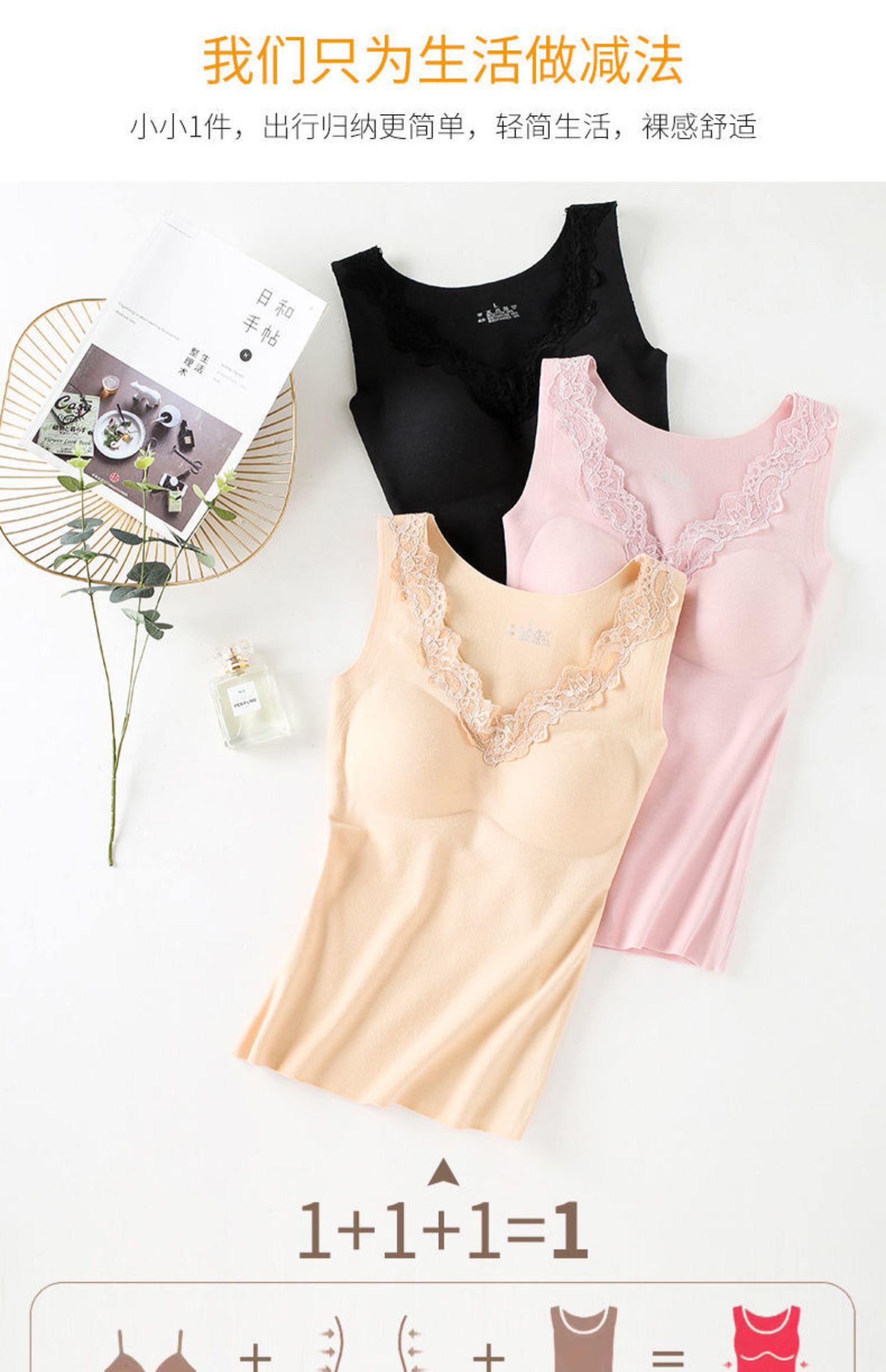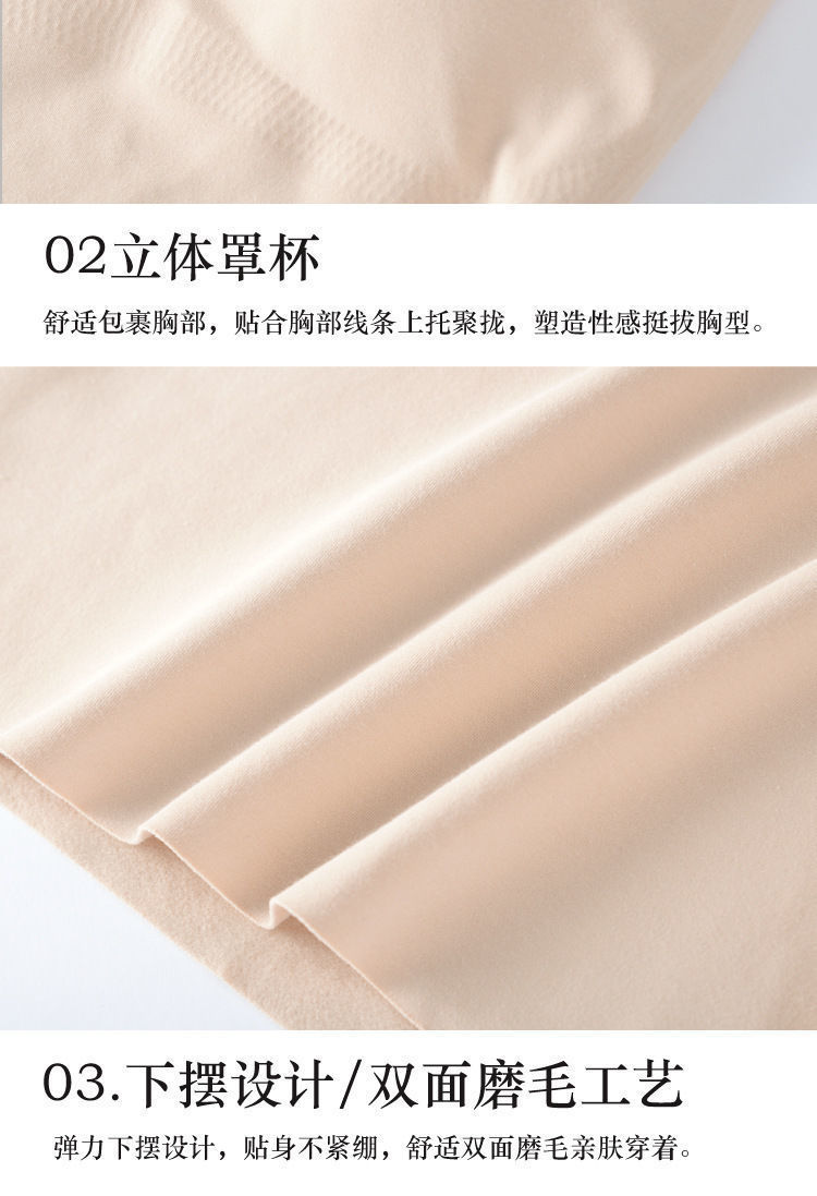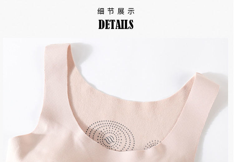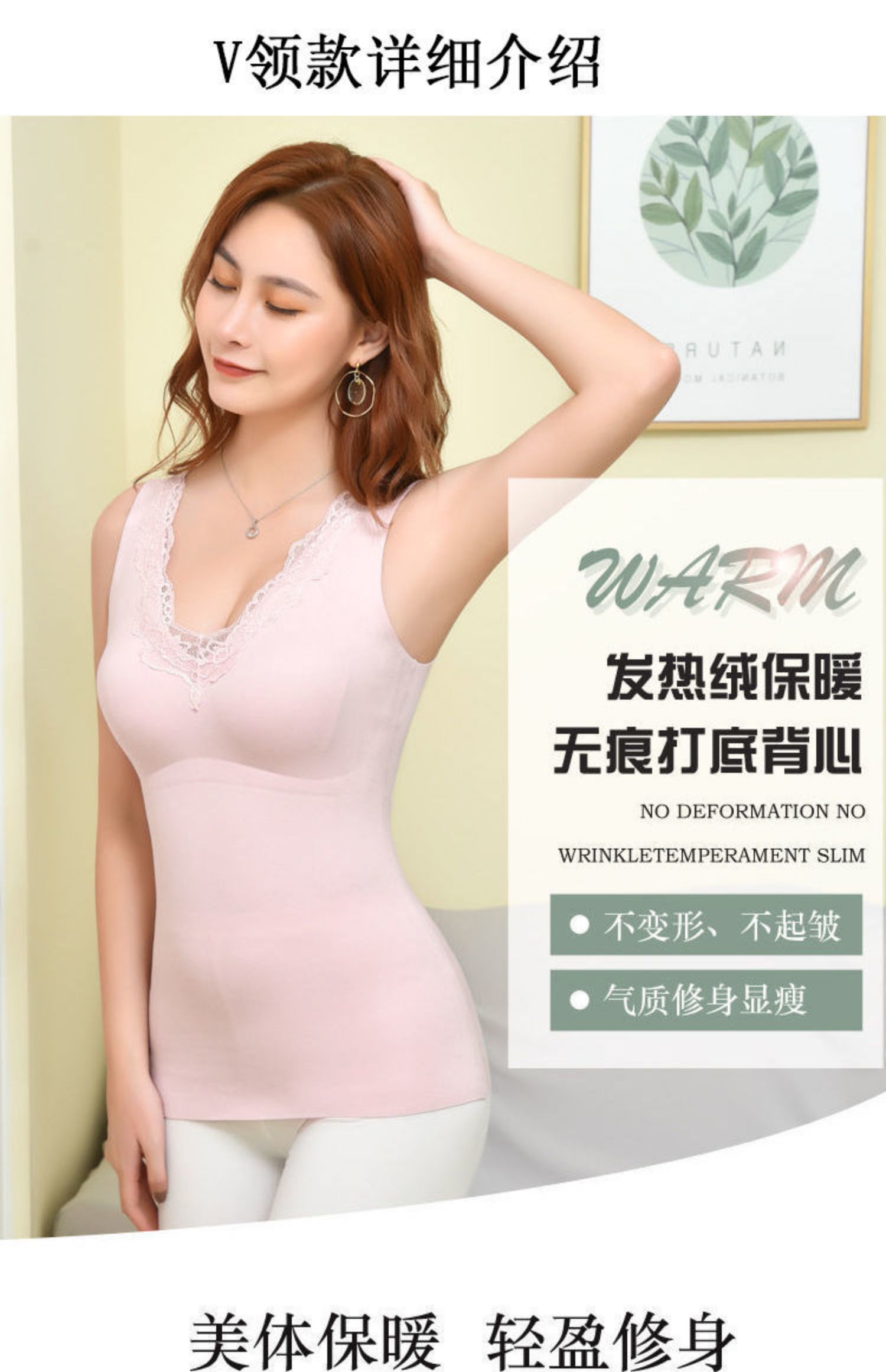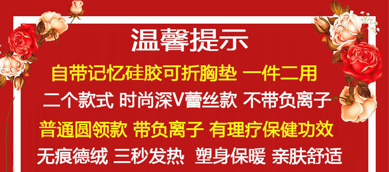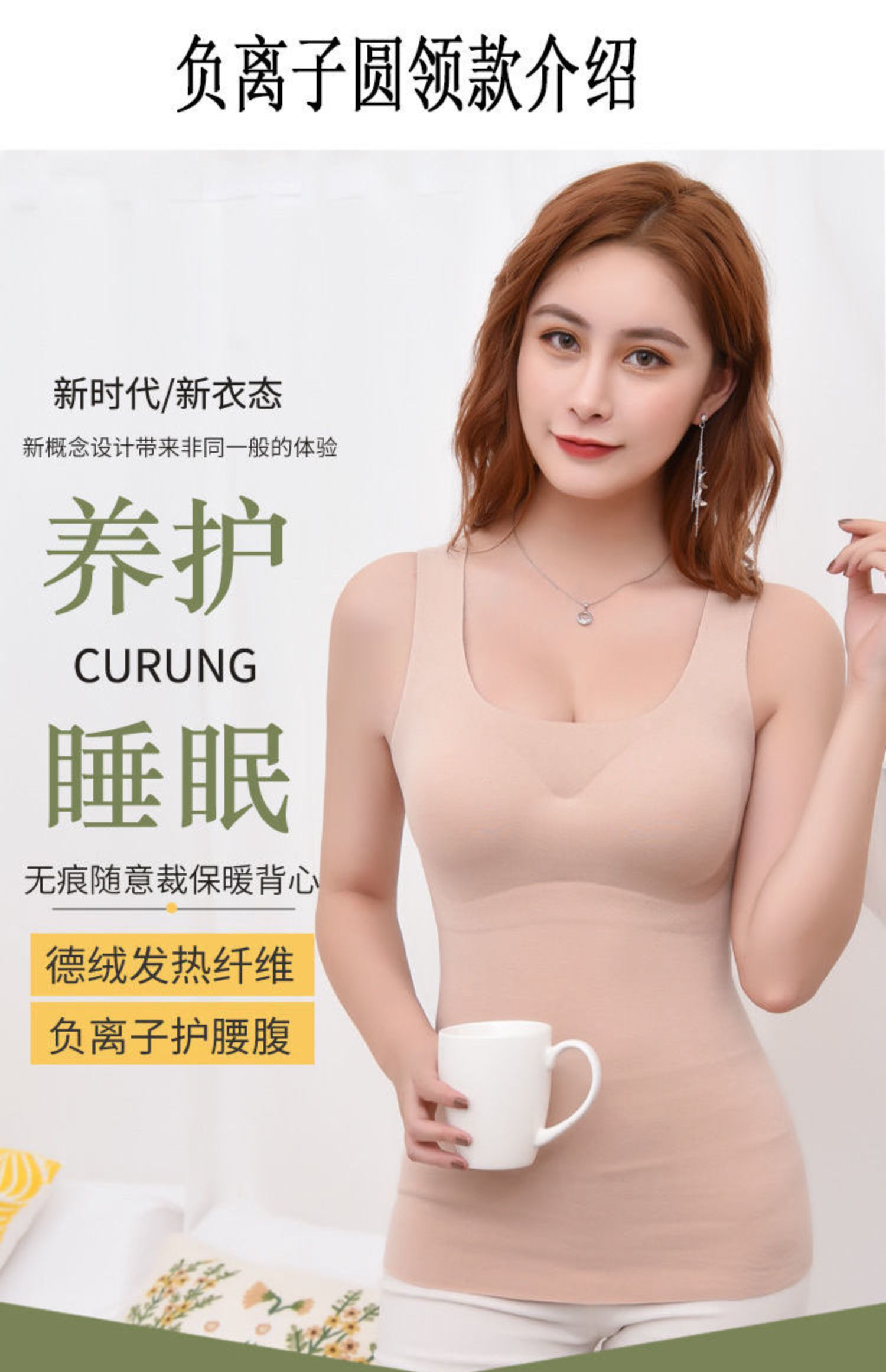 德绒发热纤维、负离子护腰腹,无痕打底背心,不变形不起皱、气质修身显瘦,一体式可拆卸胸垫设计,轻松聚拢、轻薄吸汗、裸感舒适。美体保暖、轻盈修身,负离子红远外,加快促进血液循环、缓解肩颈不适。