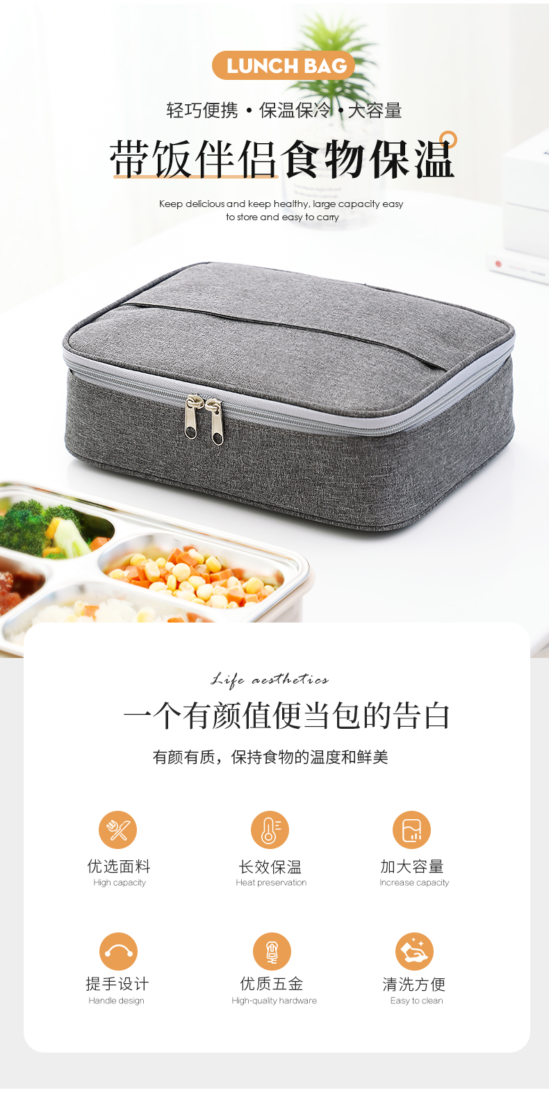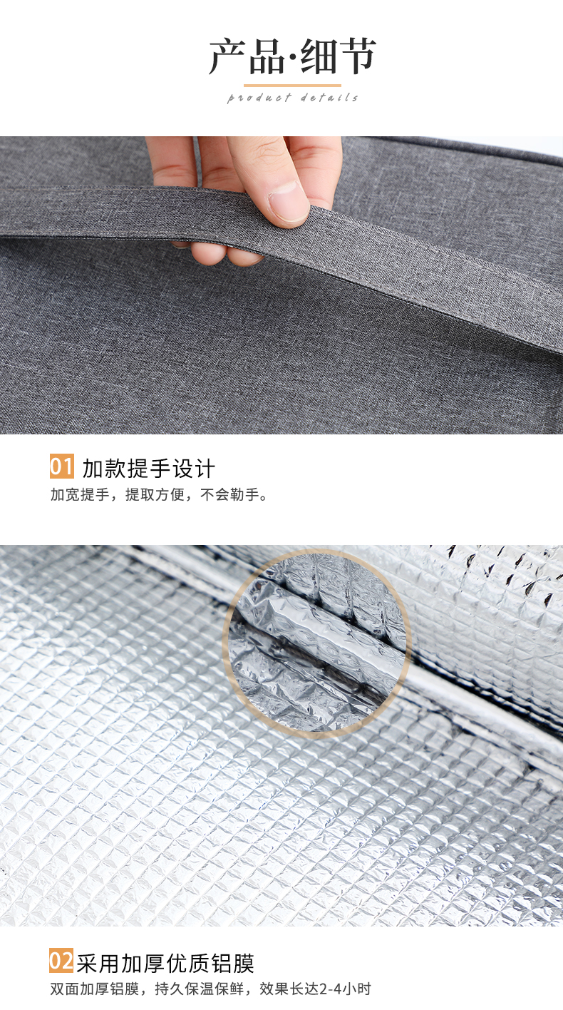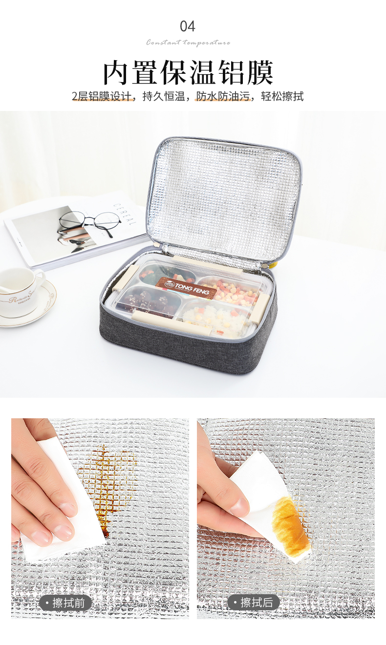 采用阳离子面料,加厚牛津布环保材质,上班上学带盒饭拎着超给力,可折叠易携带,大容量,承重能力强,高效保温保鲜保冷,防水外衣,防污保温内胆,外观颜值爆表!