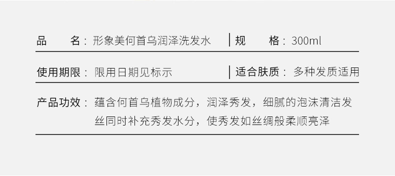 多效呵护,清爽润泽,蕴含何首乌植物成分,润泽秀发,细腻的泡沫润泽秀发的同时补充秀发水分,使秀发如丝绸般顺滑,拥抱小清新,颜值提升不止一点点~