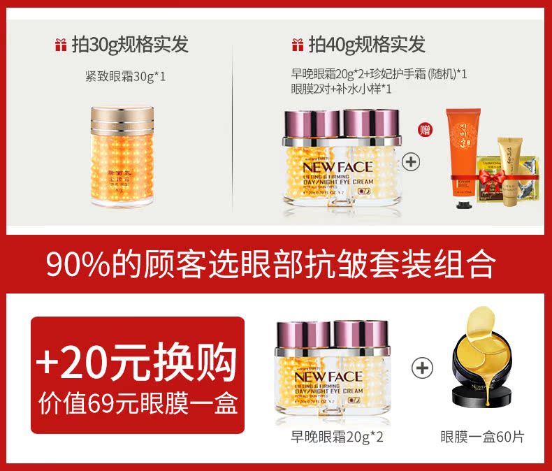 国家队专用产品,新面孔日夜金眼霜黑眼圈三合一,熬夜紧致金眼霜!呵护眼周要趁早!轻盈膏霜质地,渗透肌肤,显著缓解眼周暗沉~成分安全!水润眼周,重拾美眸!保证正品,速速抢购,手慢无~