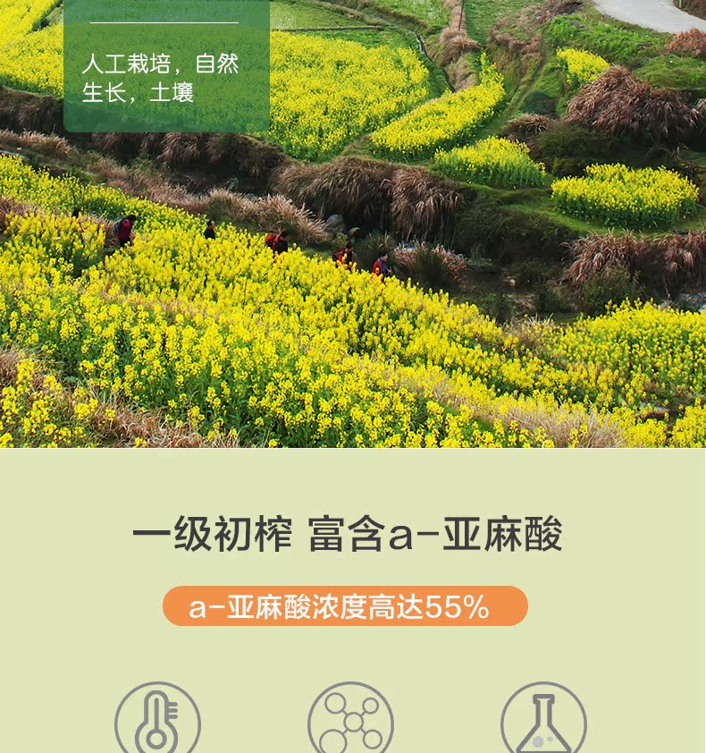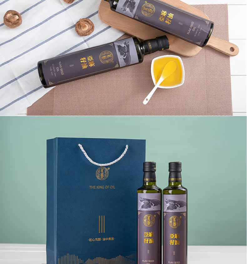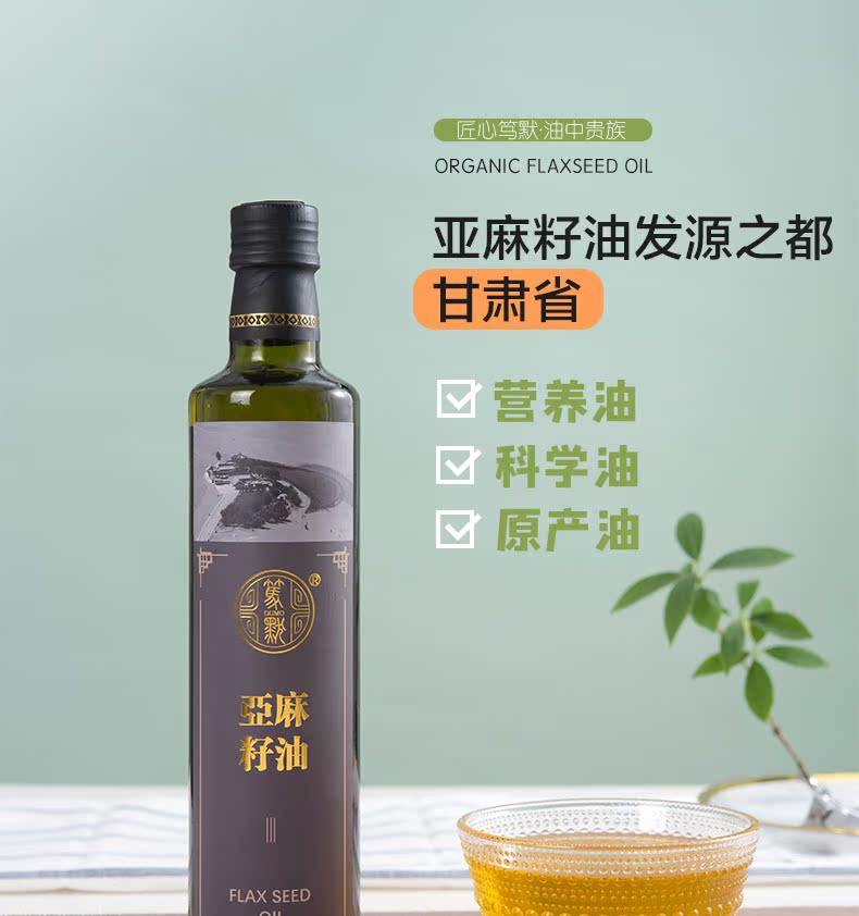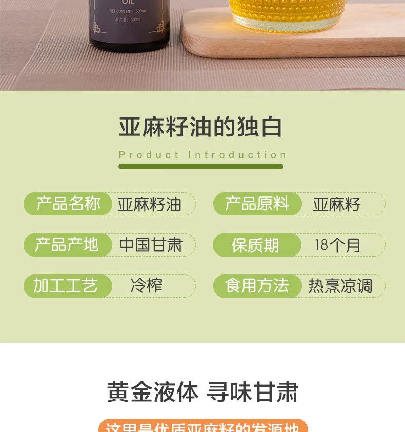 优质亚麻籽发源地,黄金液体,寻味甘肃,一级初榨,富含a-亚麻酸,冷榨工艺,保留原始营养成分,丰富营养元素,守护家人健康~