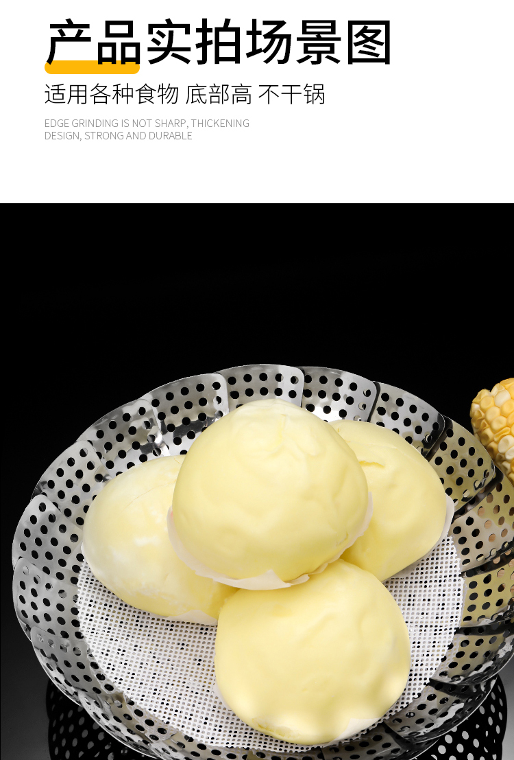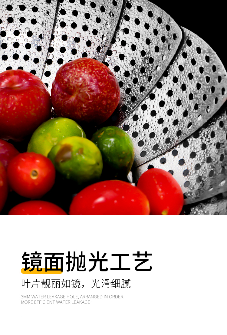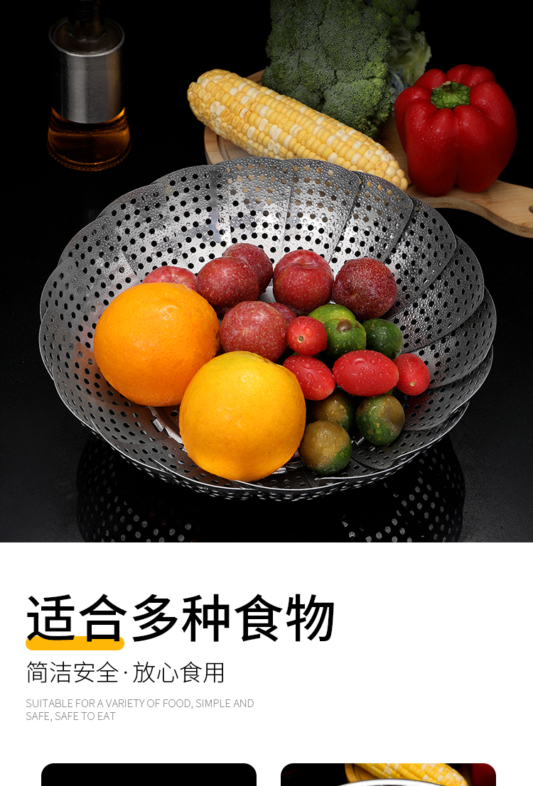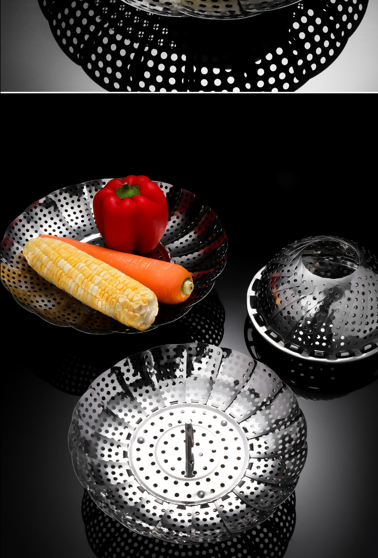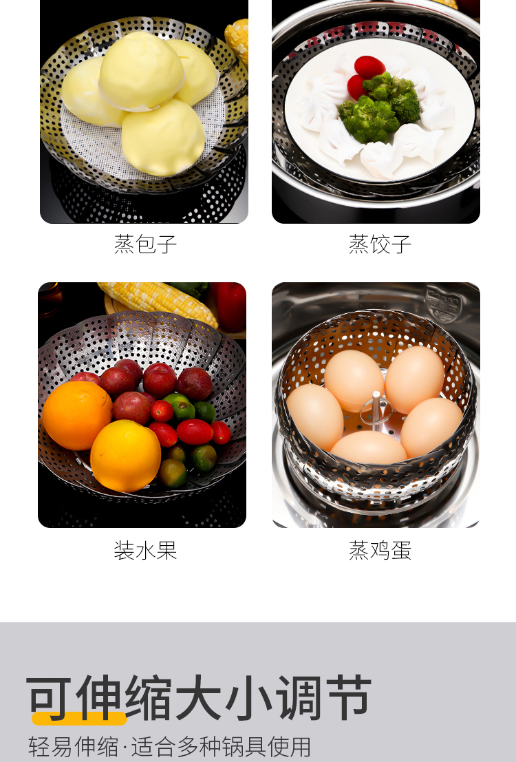百变折叠,可叠加使用,承重力度强,加厚不绣钢,蒸孔均匀,可拆脚架,用途广泛,不锈钢家用伸缩蒸笼盘,可用作水果篮,沥水篮,蒸架,筛网等等,让你做菜时候便捷清洗,是你厨房的好帮手哦~