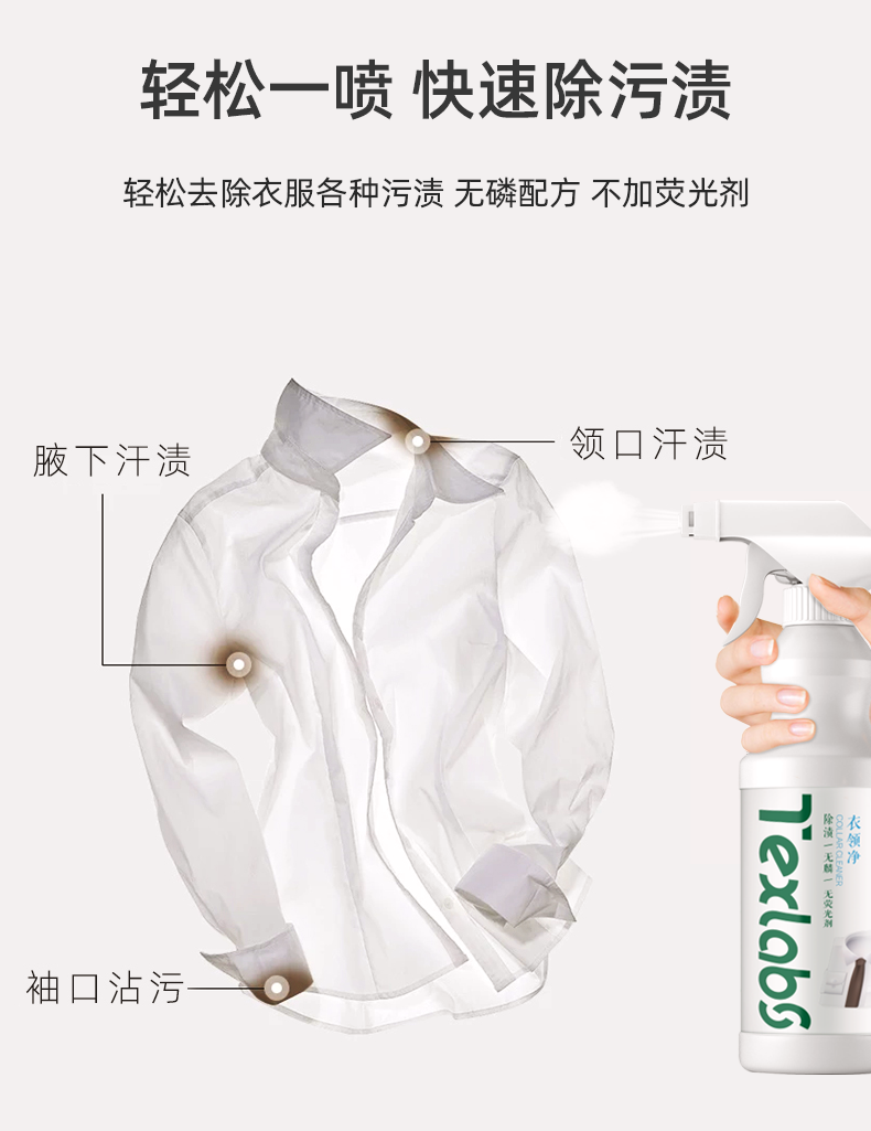 领口袖口,轻轻一喷,去除多重衣领污渍固渍,一喷一搓,操作简单,快速去污,不含荧光剂,24小时干净护衣~~【七天无理由退换】