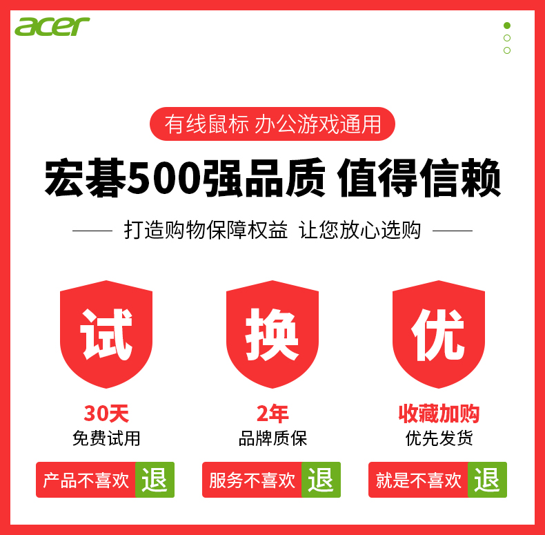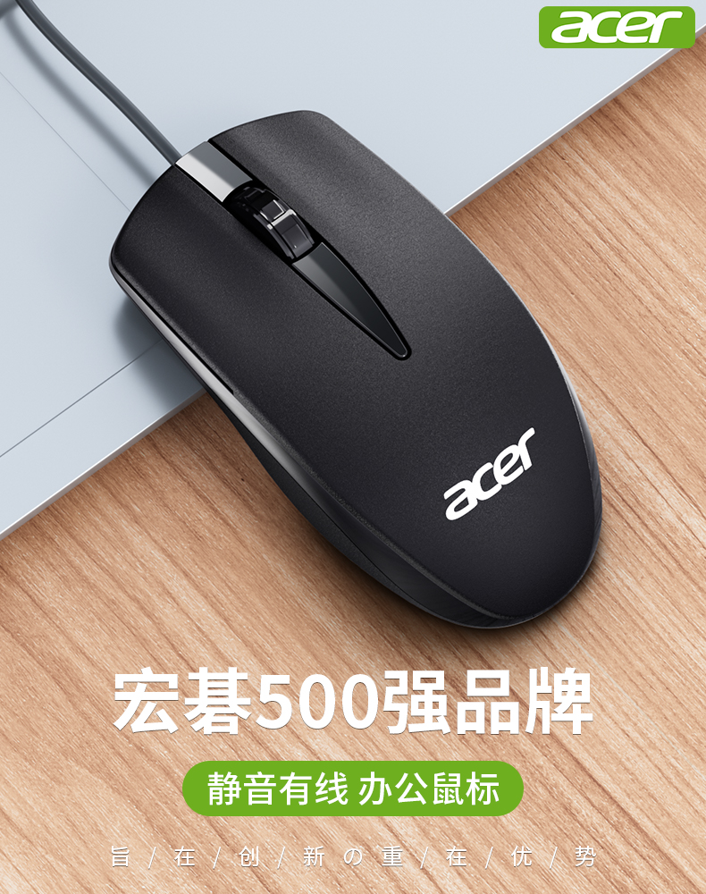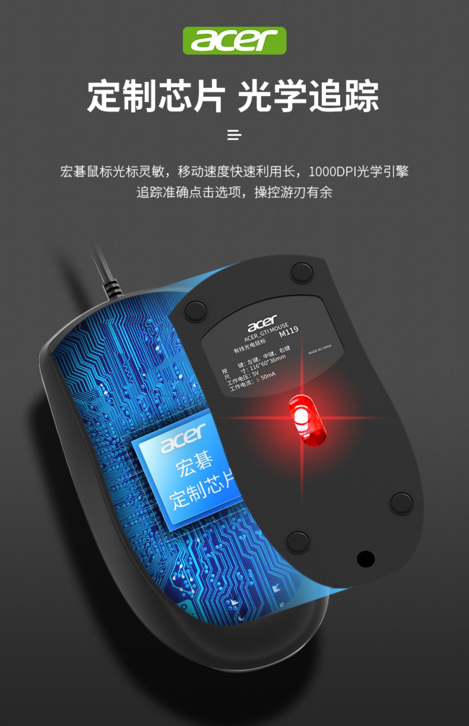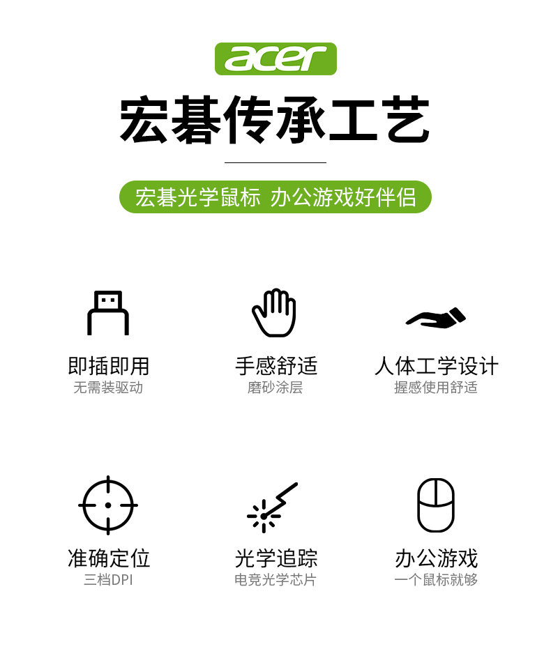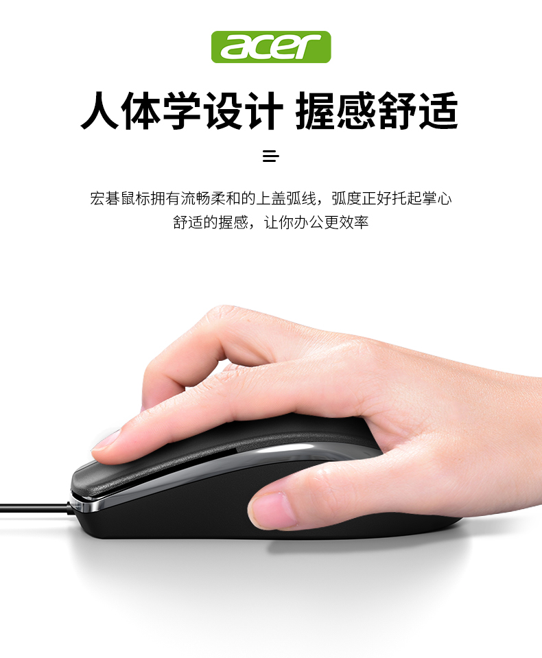 宏碁世界500强品质保证!传承宏碁工艺,人体工学设计,磨砂涂层,舒适握感!三档DPI精确定位,采用电竞光学芯片,办公游戏的好伴侣!现在下单送30天免费试用+2年质保!