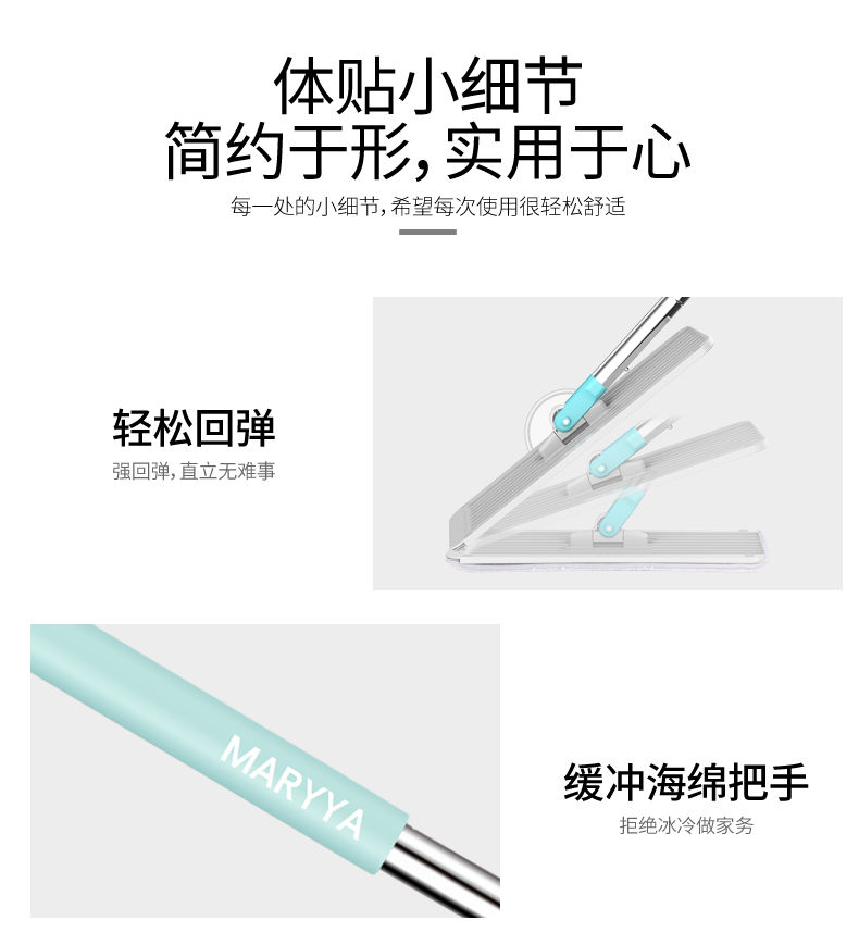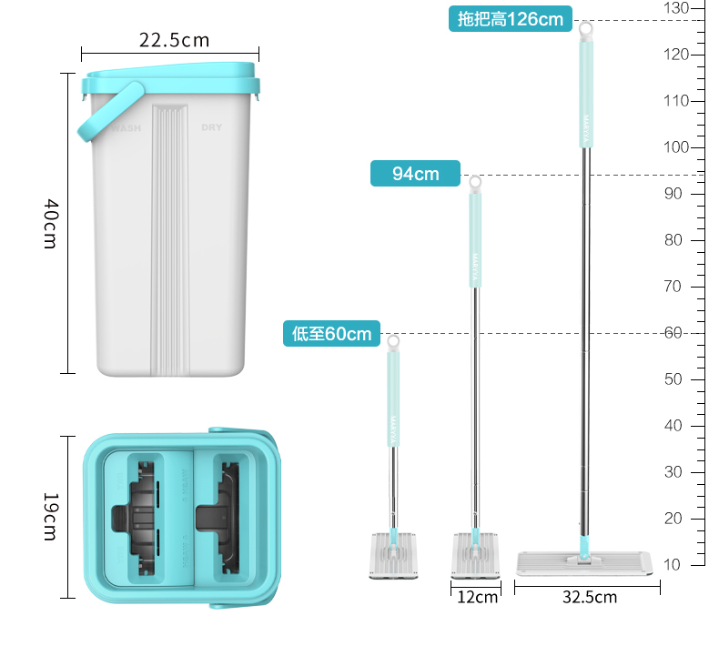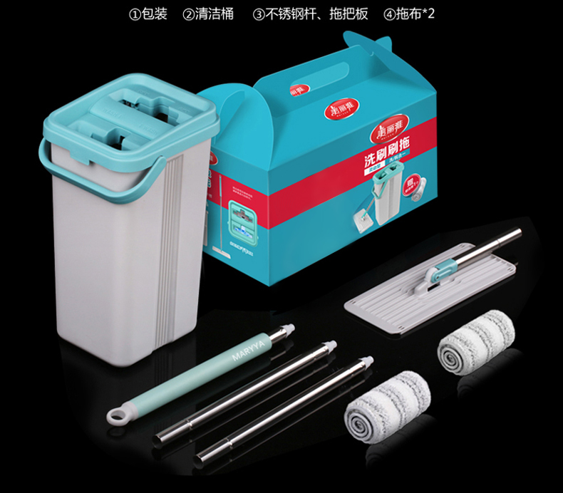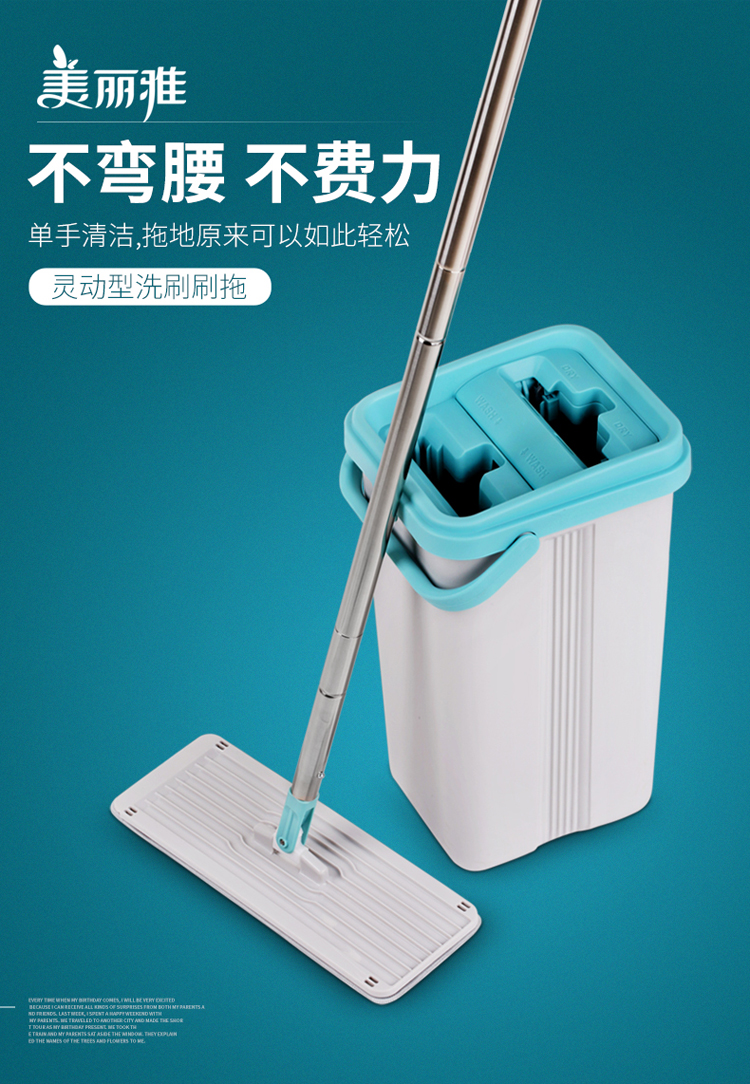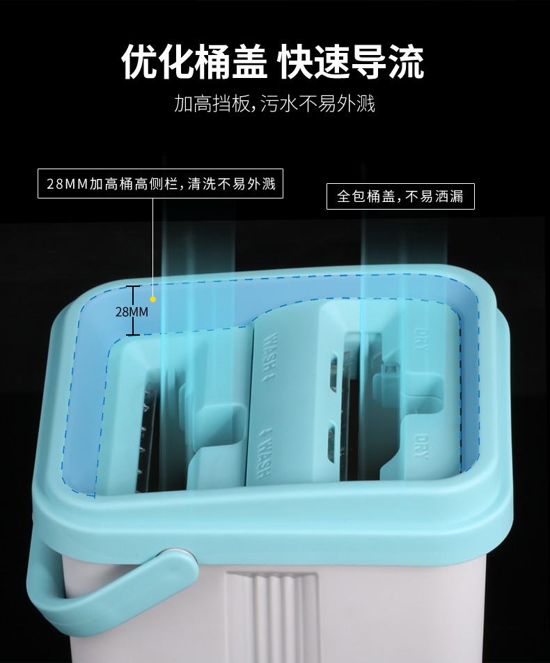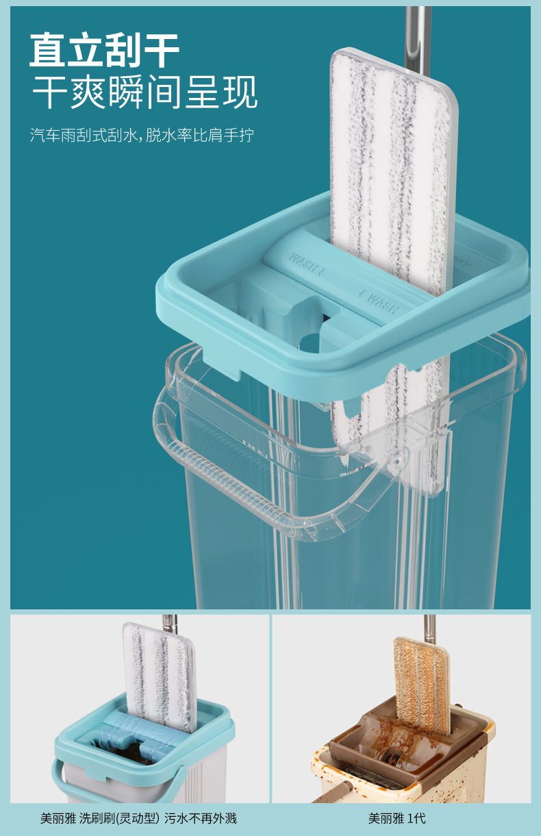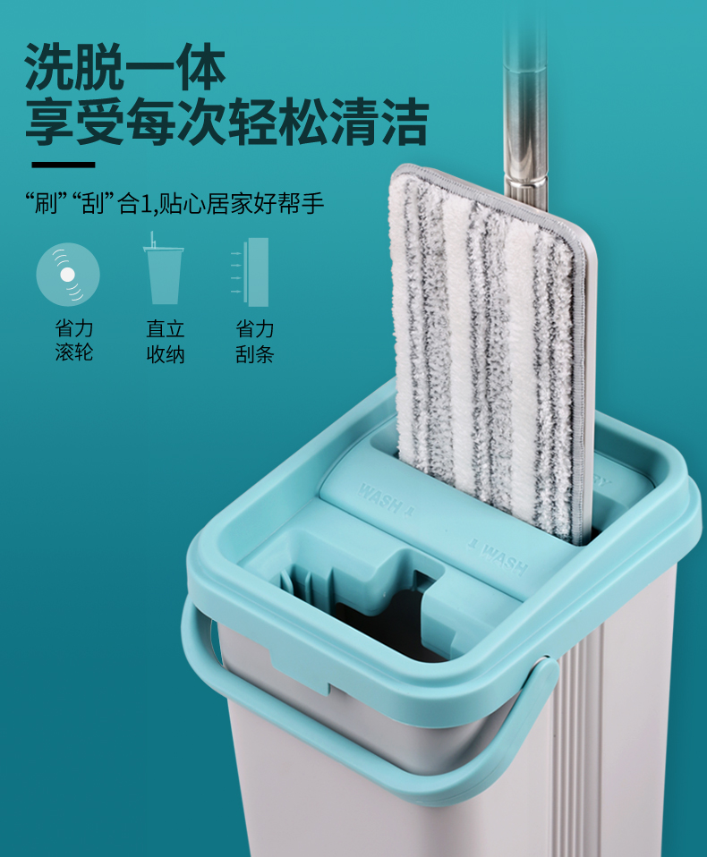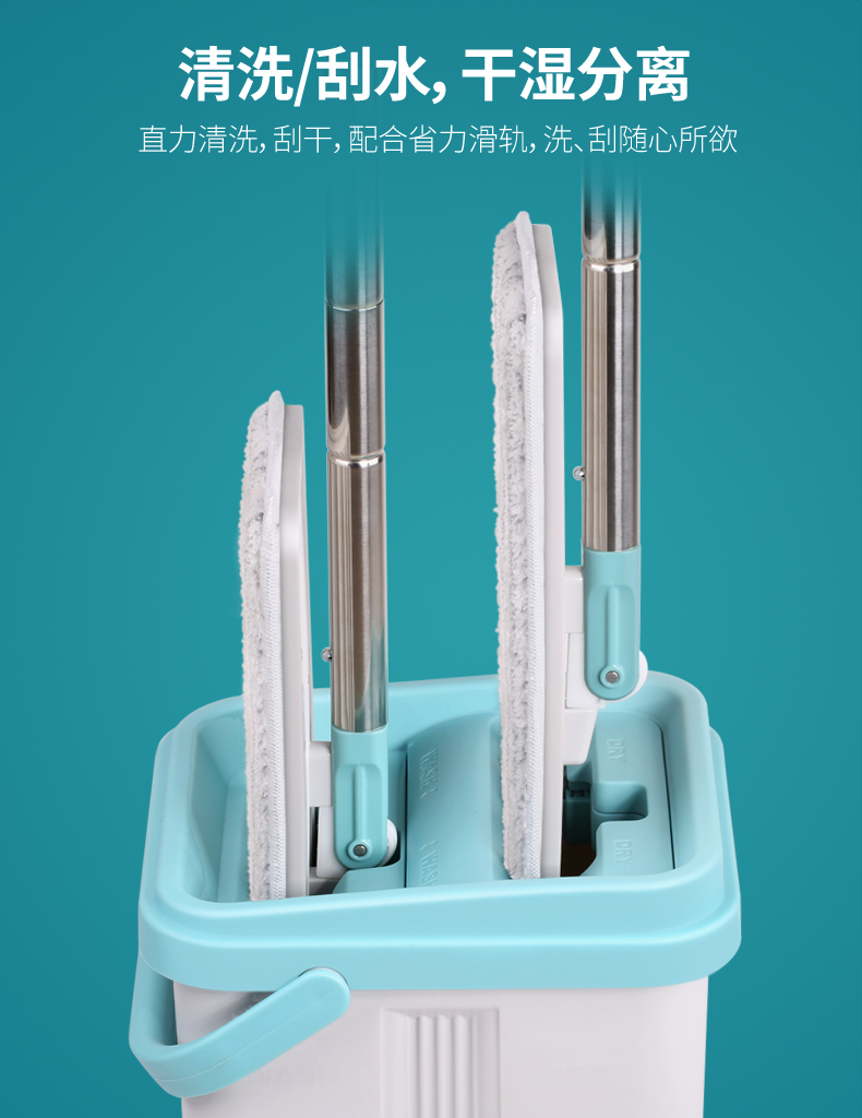 双桶设计,洗脱一体,免手洗,干湿分离,轻松洗涤,快速脱水,重油污克星,一拖无痕!不弯腰不费力,单手操作,轻松快捷,各种地面适用。