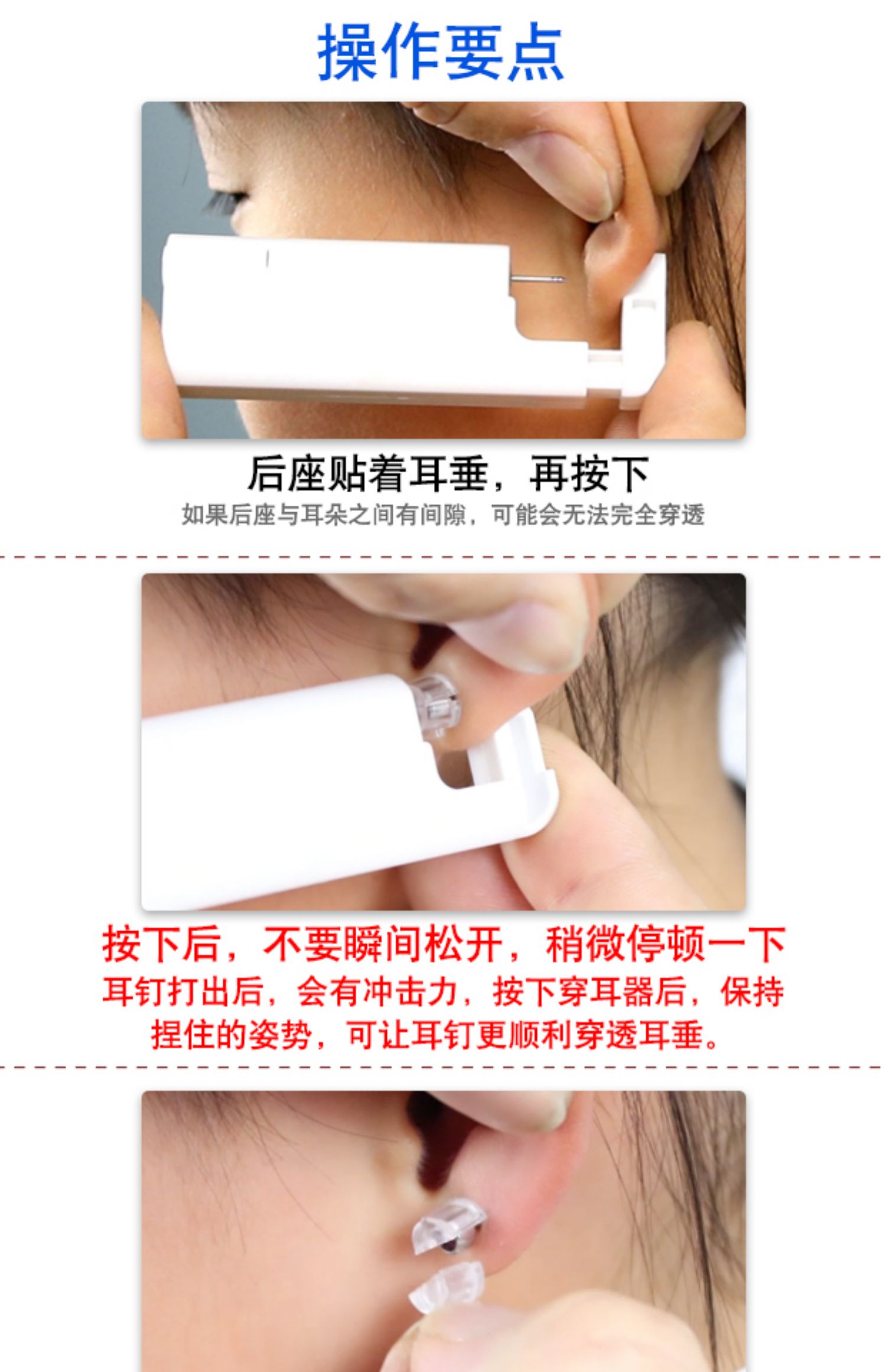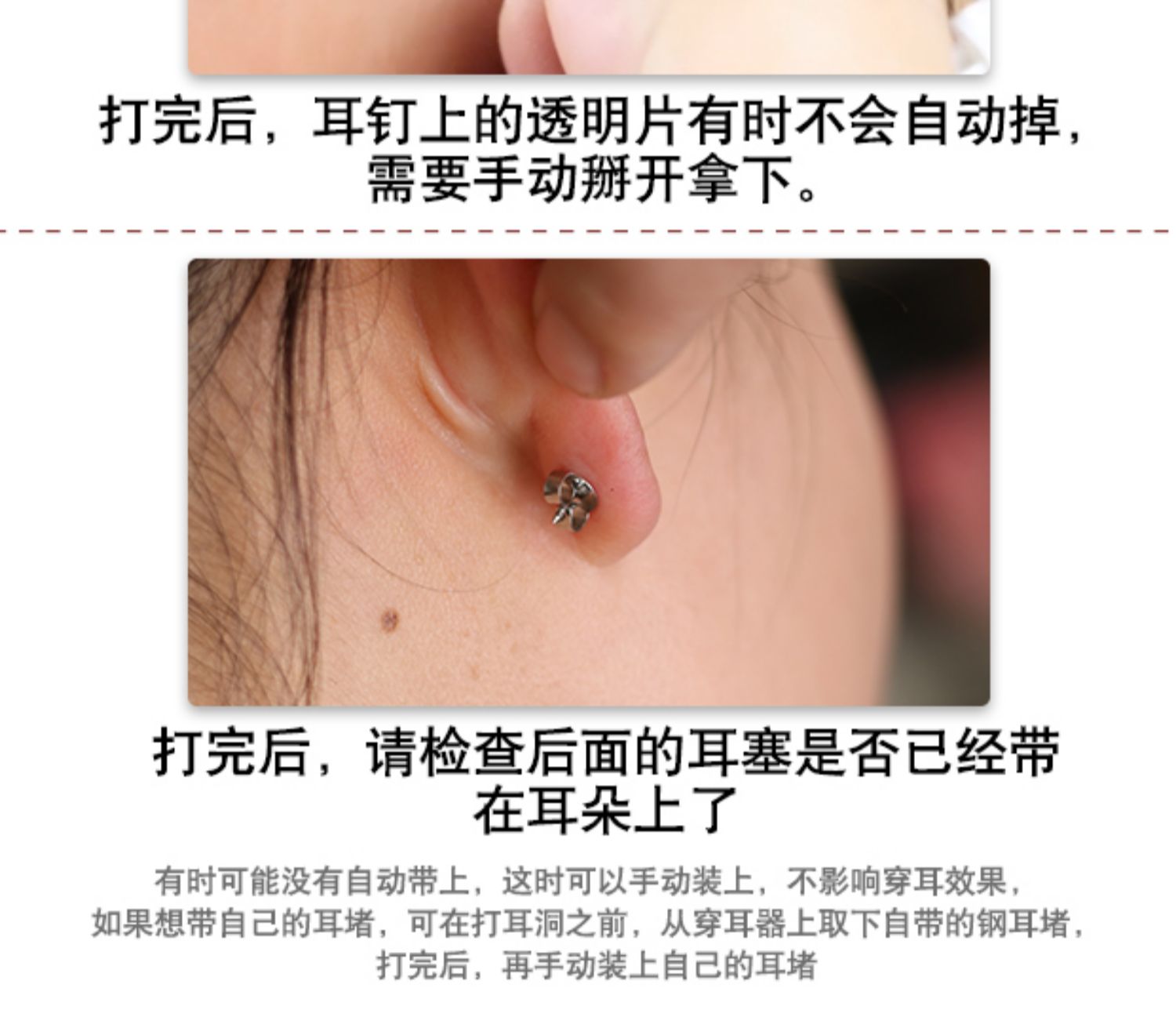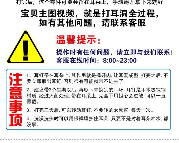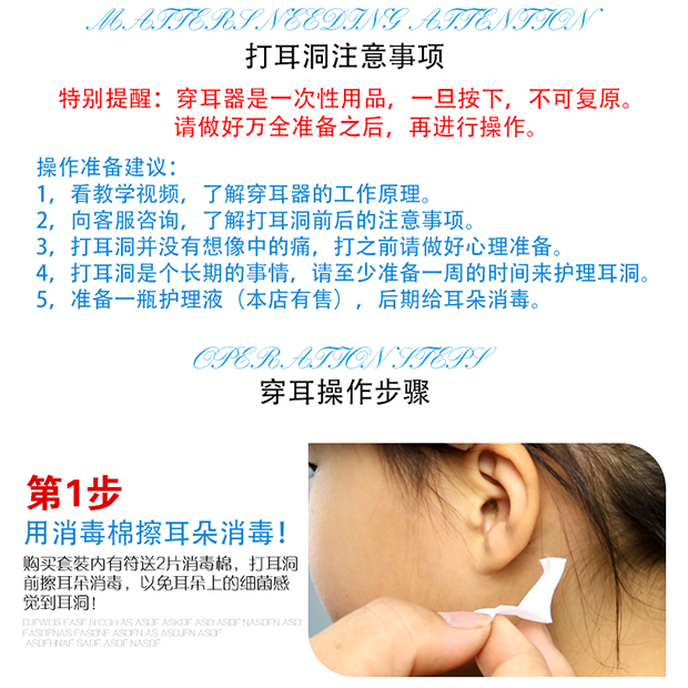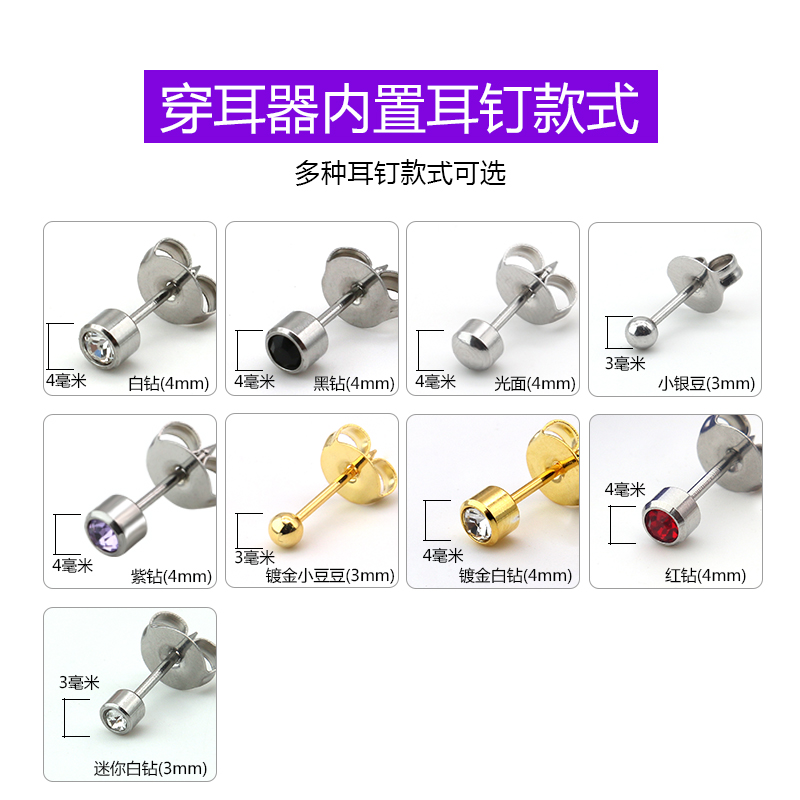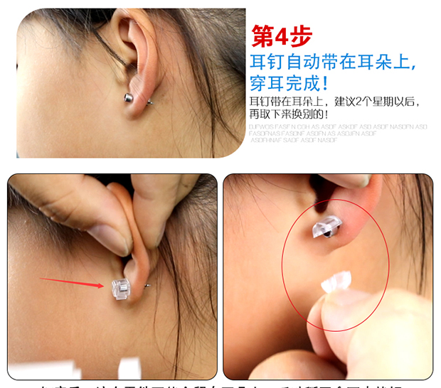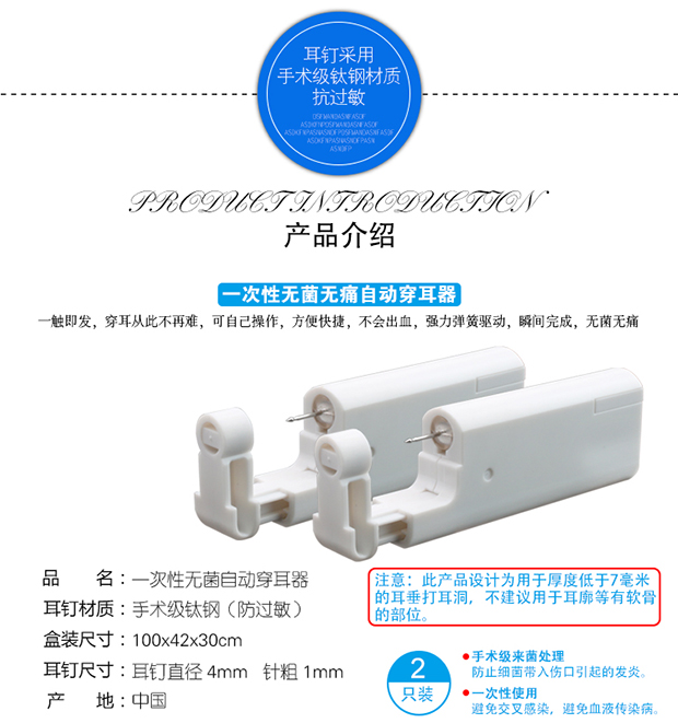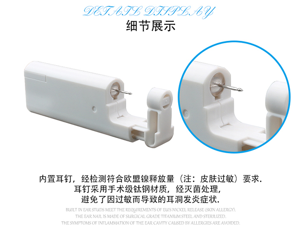 一次性自动穿耳器,安全方便。内置耳钉,经灭菌处理,避免因过敏而导致的耳洞发炎症状。