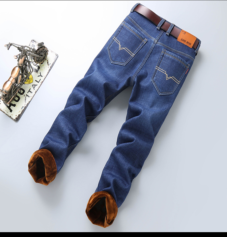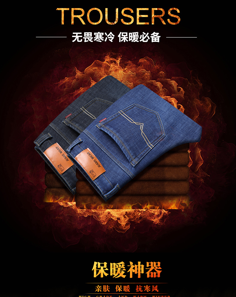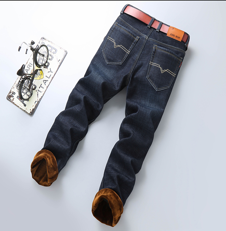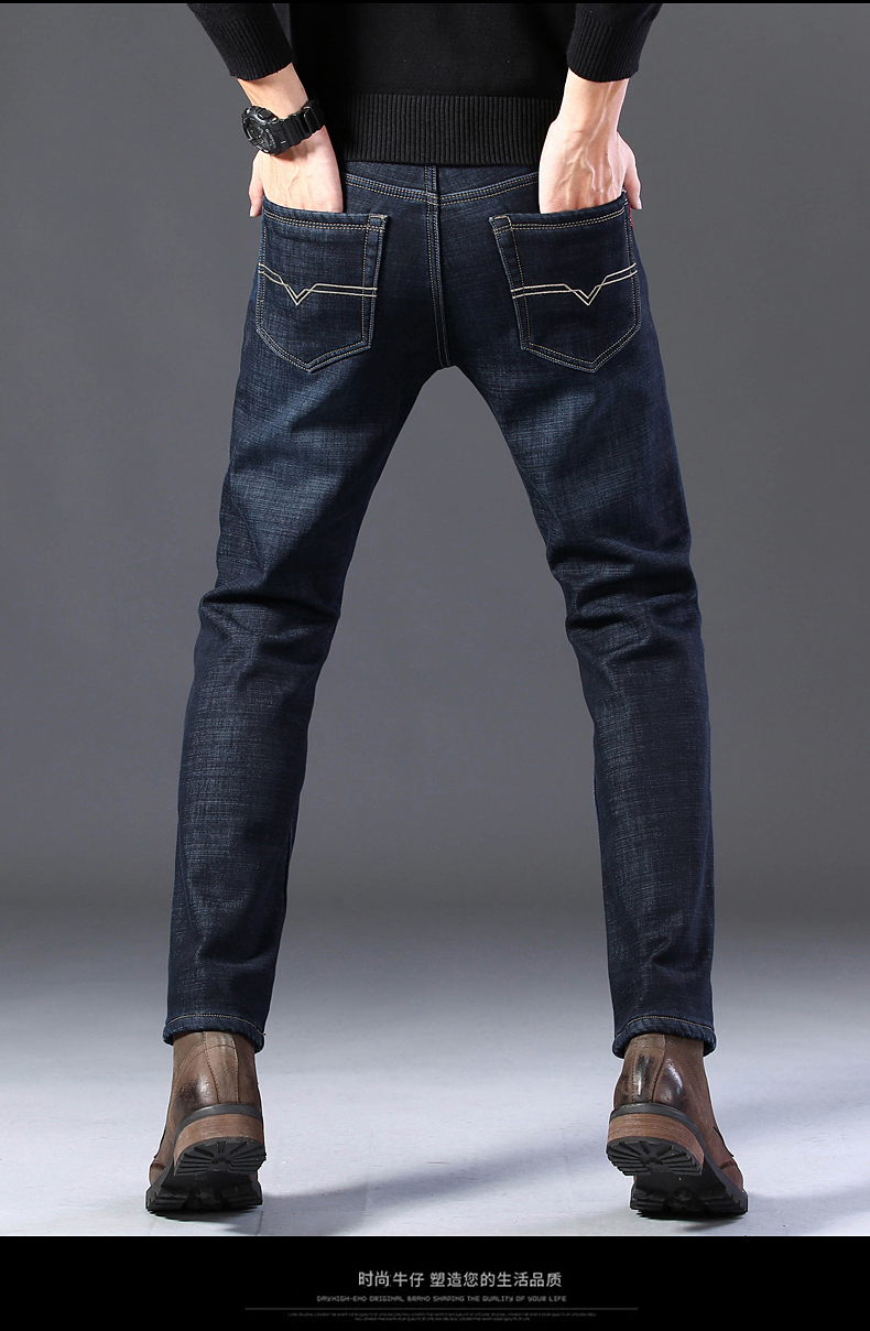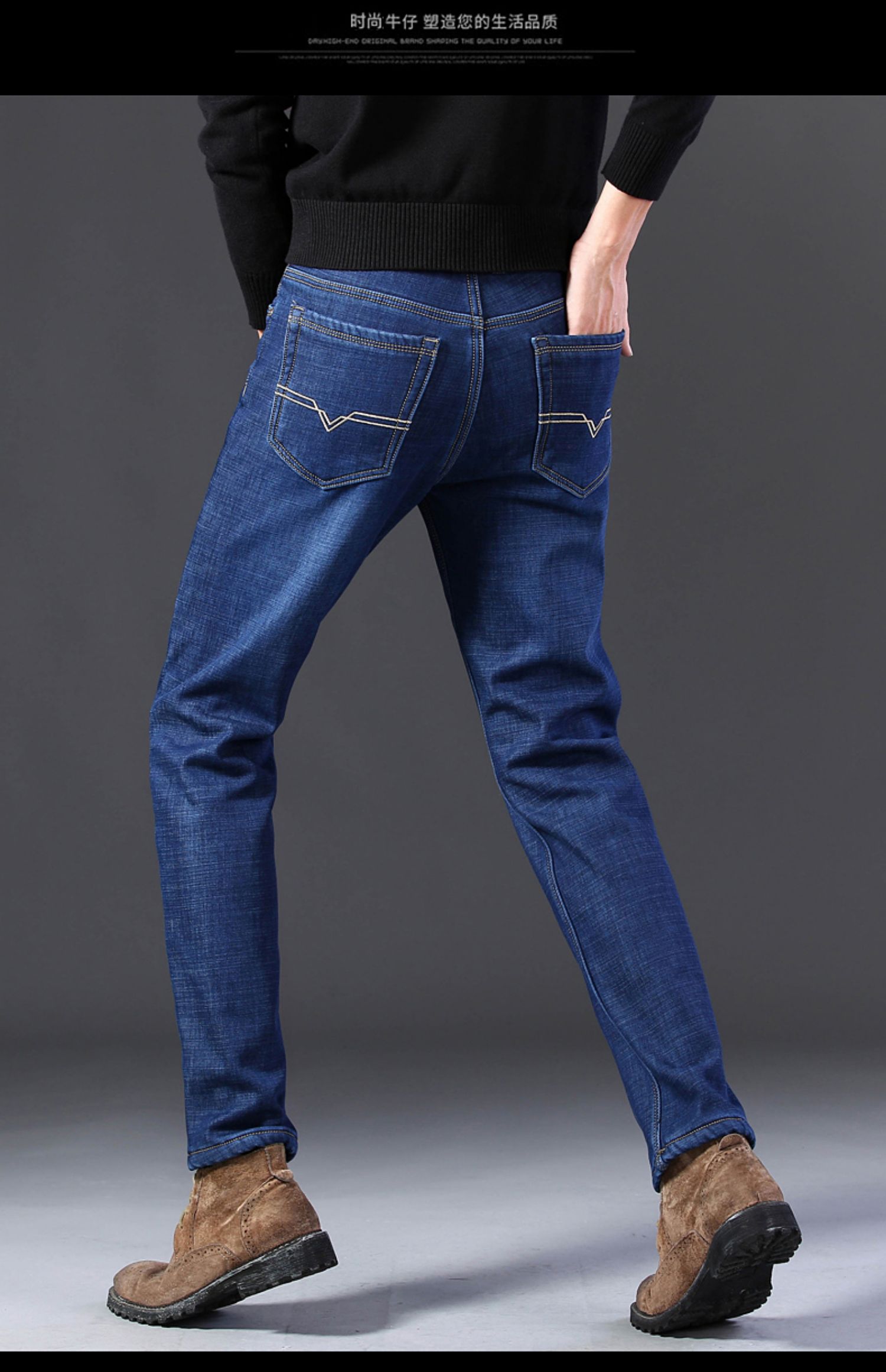 男士秋冬季加绒牛仔裤弹力高腰直筒裤男装