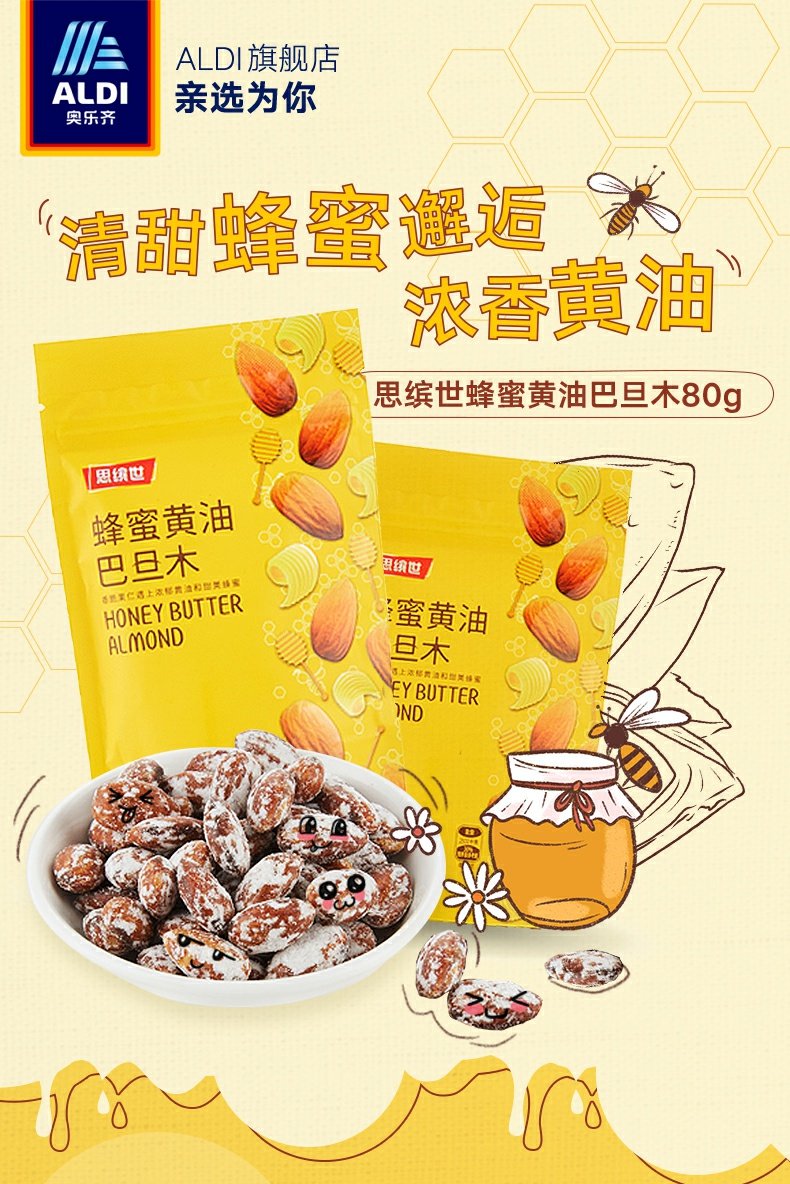 【满减5元】ALDI奥乐齐思缤世蜂蜜黄油巴旦木80g*2,坚果扁桃仁,好巴旦木饱含加州情怀,颗粒饱满轻火慢烤,静置入味入口酥脆,享受每颗果仁的醇香,清淡低钠,更加健康营养美味,吃货福利~