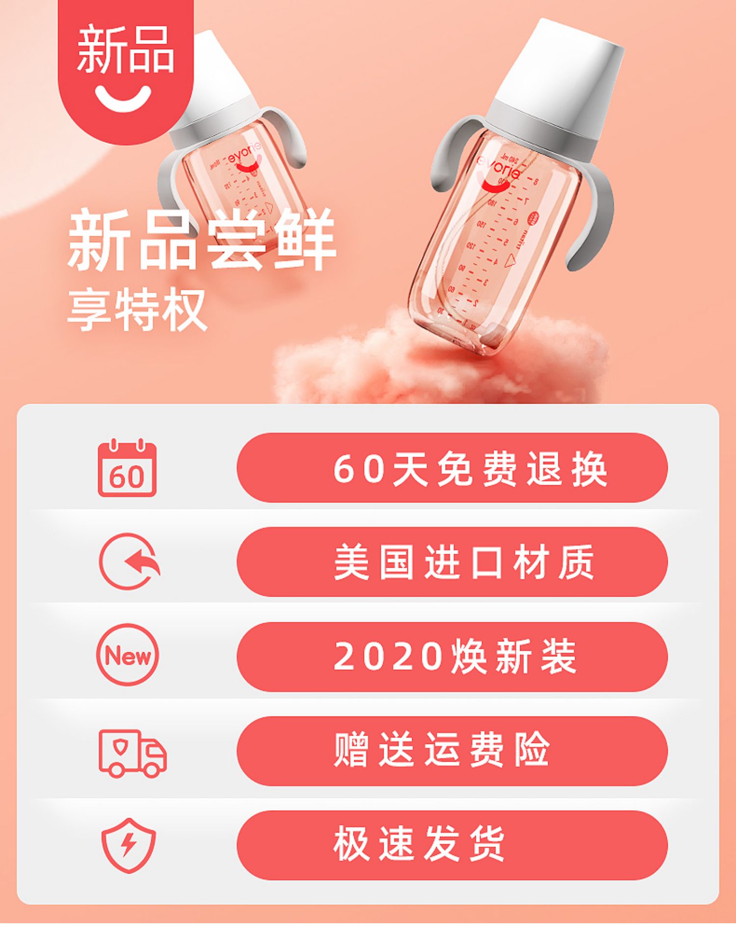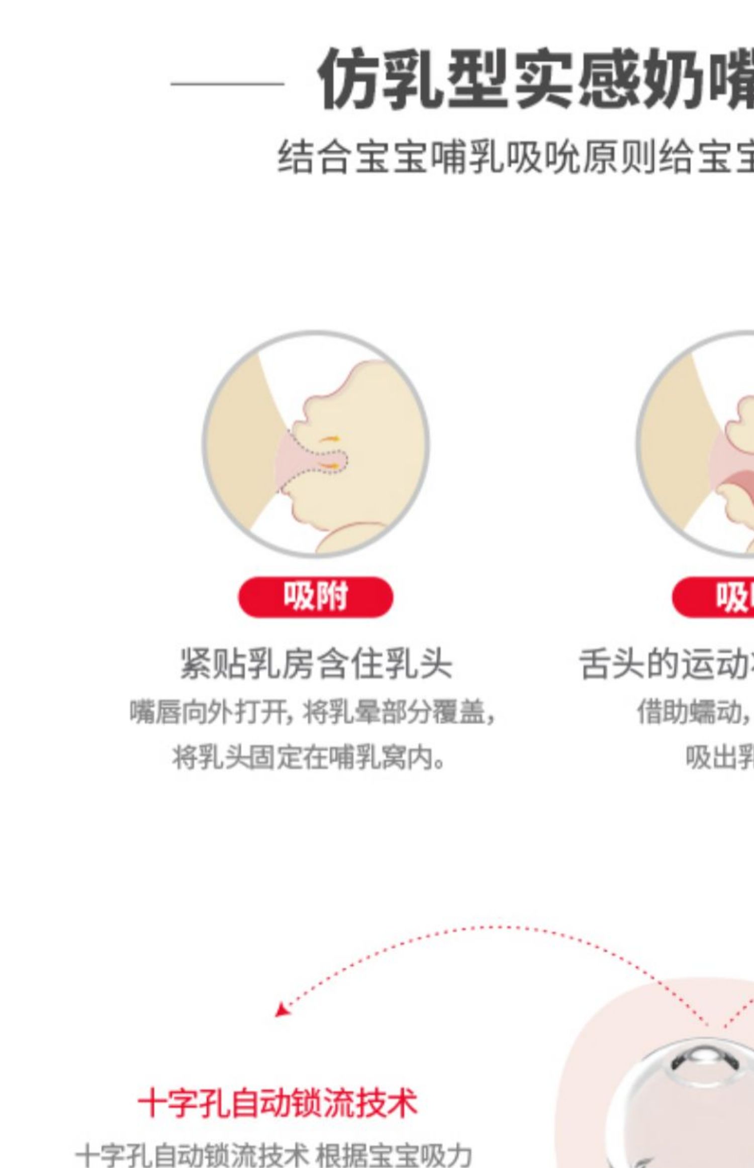 360°仿母乳奶嘴,超宽口,绝不呛奶防胀气,安全可靠,用了这个后宝宝水都喝多了,吸着也顺溜,喝奶时不会呛到,真的很棒,抓紧给宝宝撸一个!!