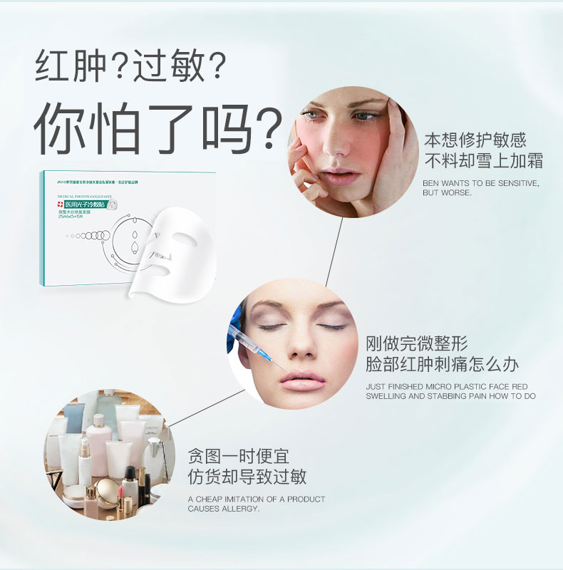 医用光子冷敷贴,祛痘淡印修复受损肌,七大优势,激活敏感肌,三螺旋活性胶原,修复强,愈活快,保湿高,五大科技加持,满满一片,给你全脸修复。