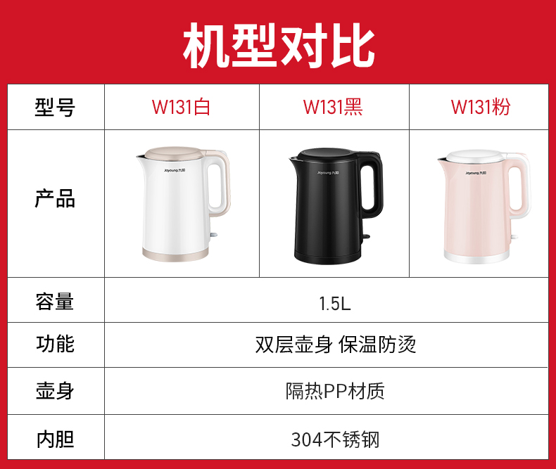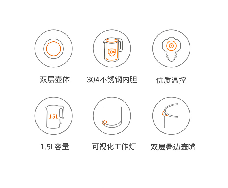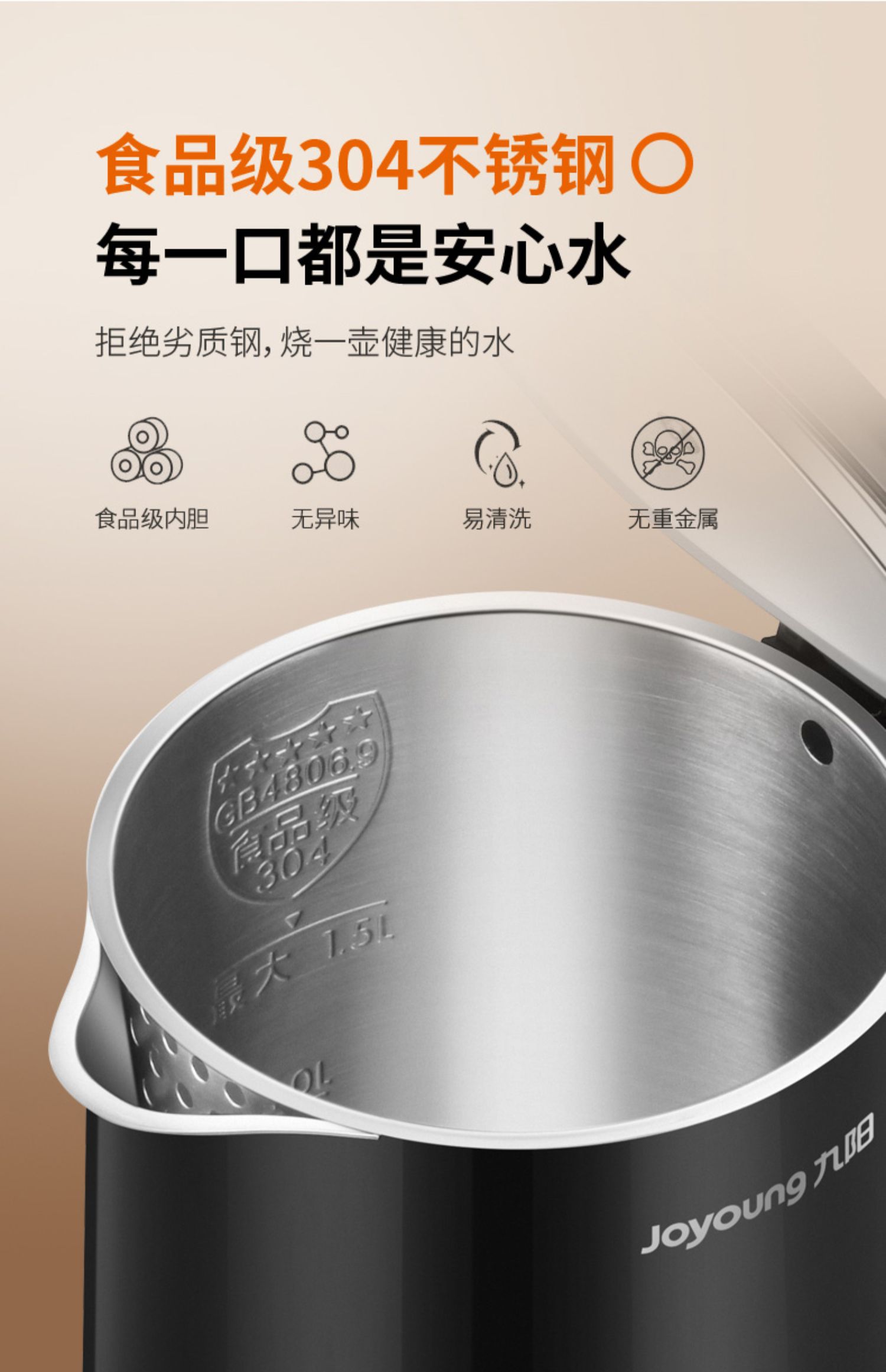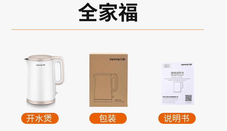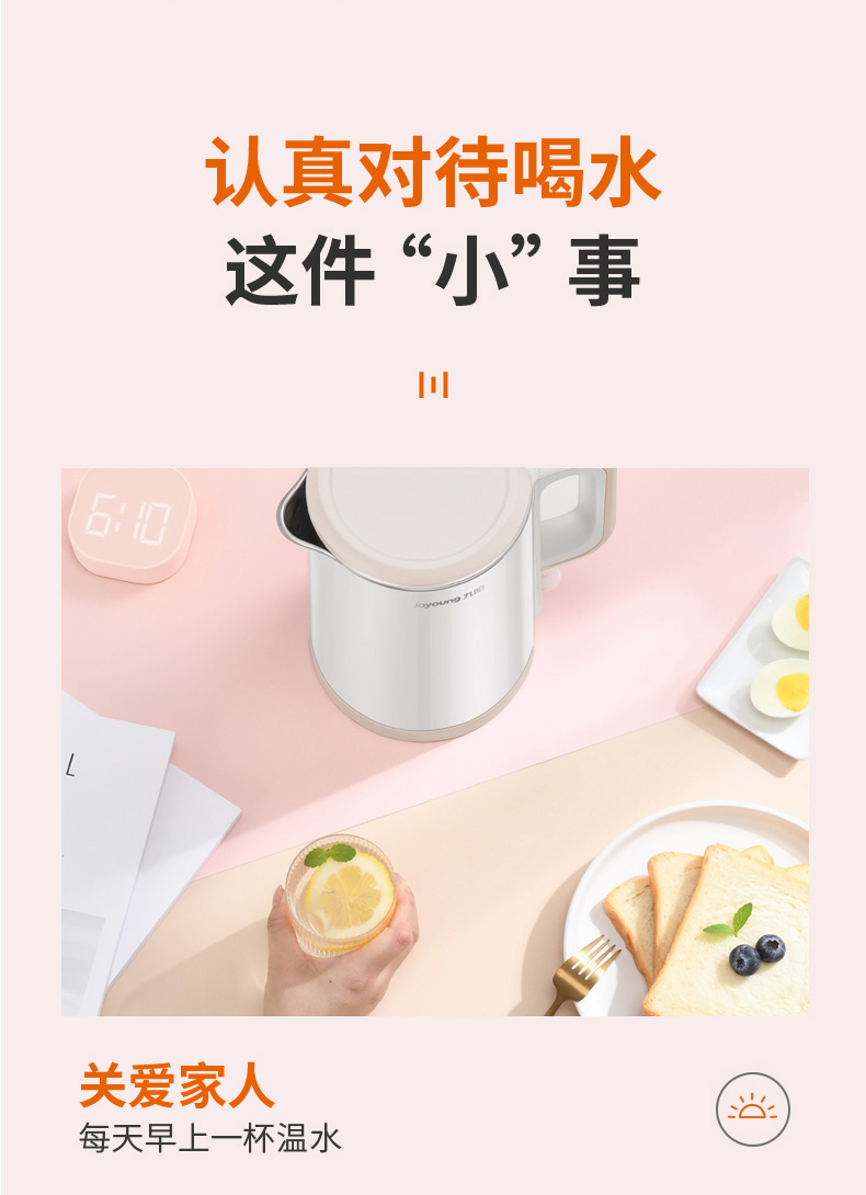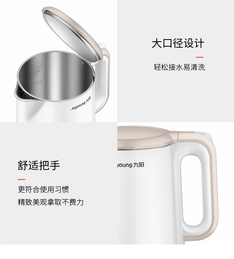 【九阳大牌】1.5L大容量电热水壶,304不锈钢内胆,快速沸腾,双层防烫,自动断电保温,70°开盖,防止烫伤,老人孩子取放无忧;居家‘新宠’优雅生活从一杯水开始!
