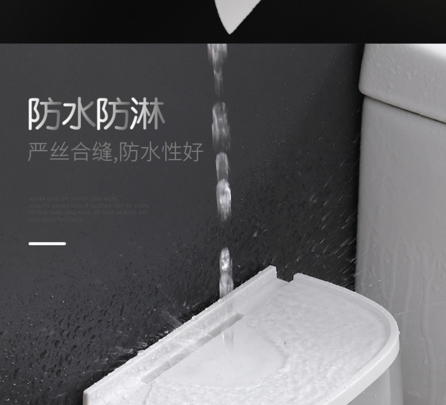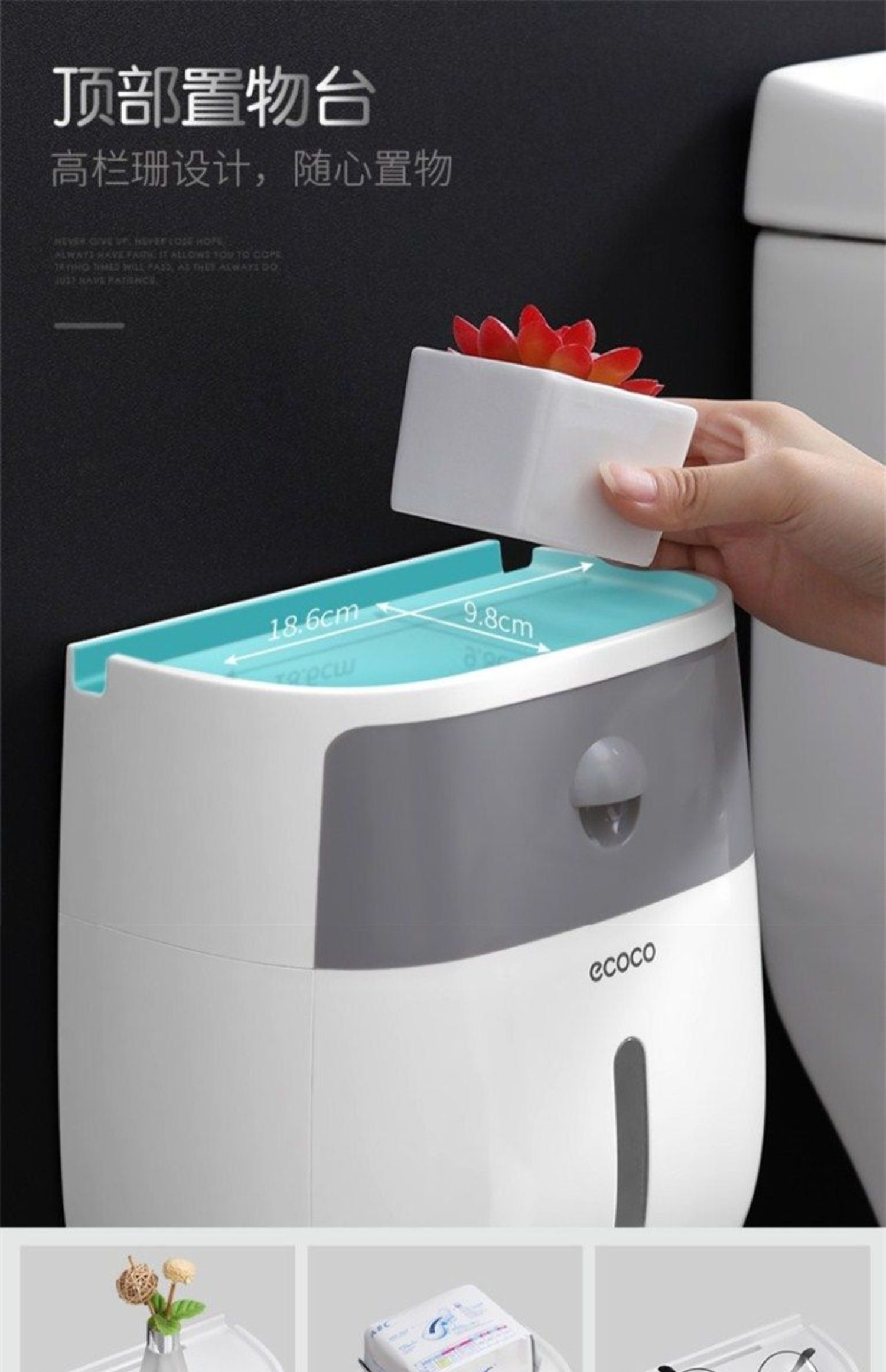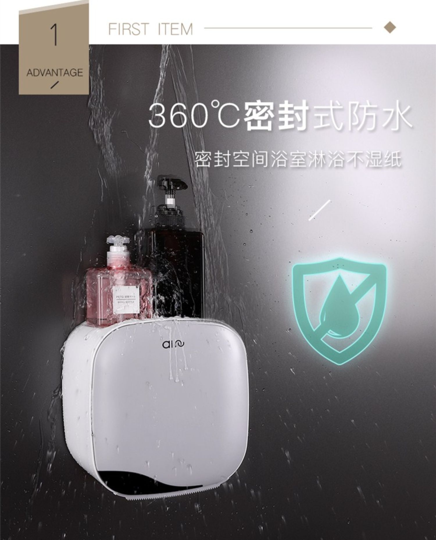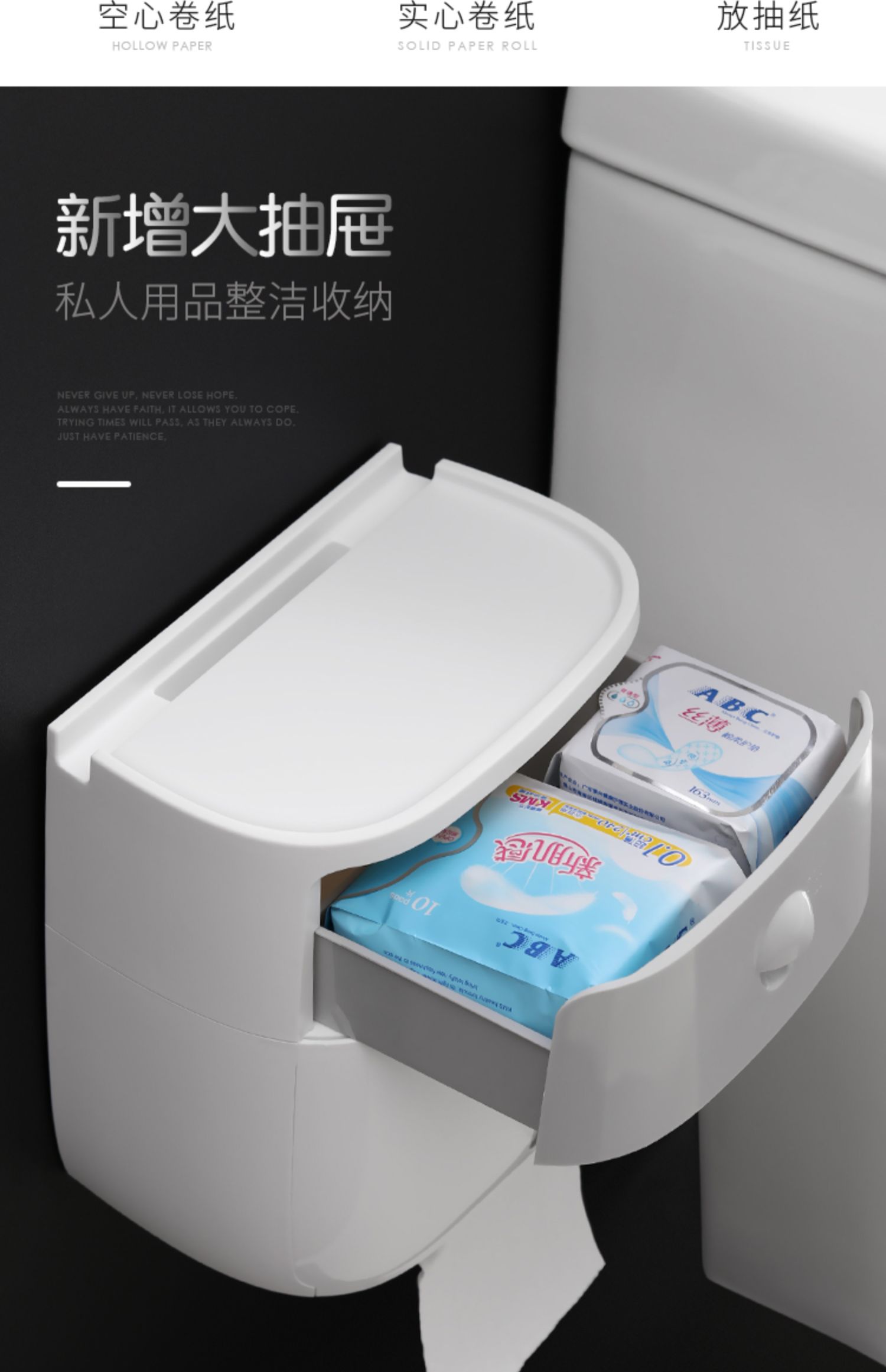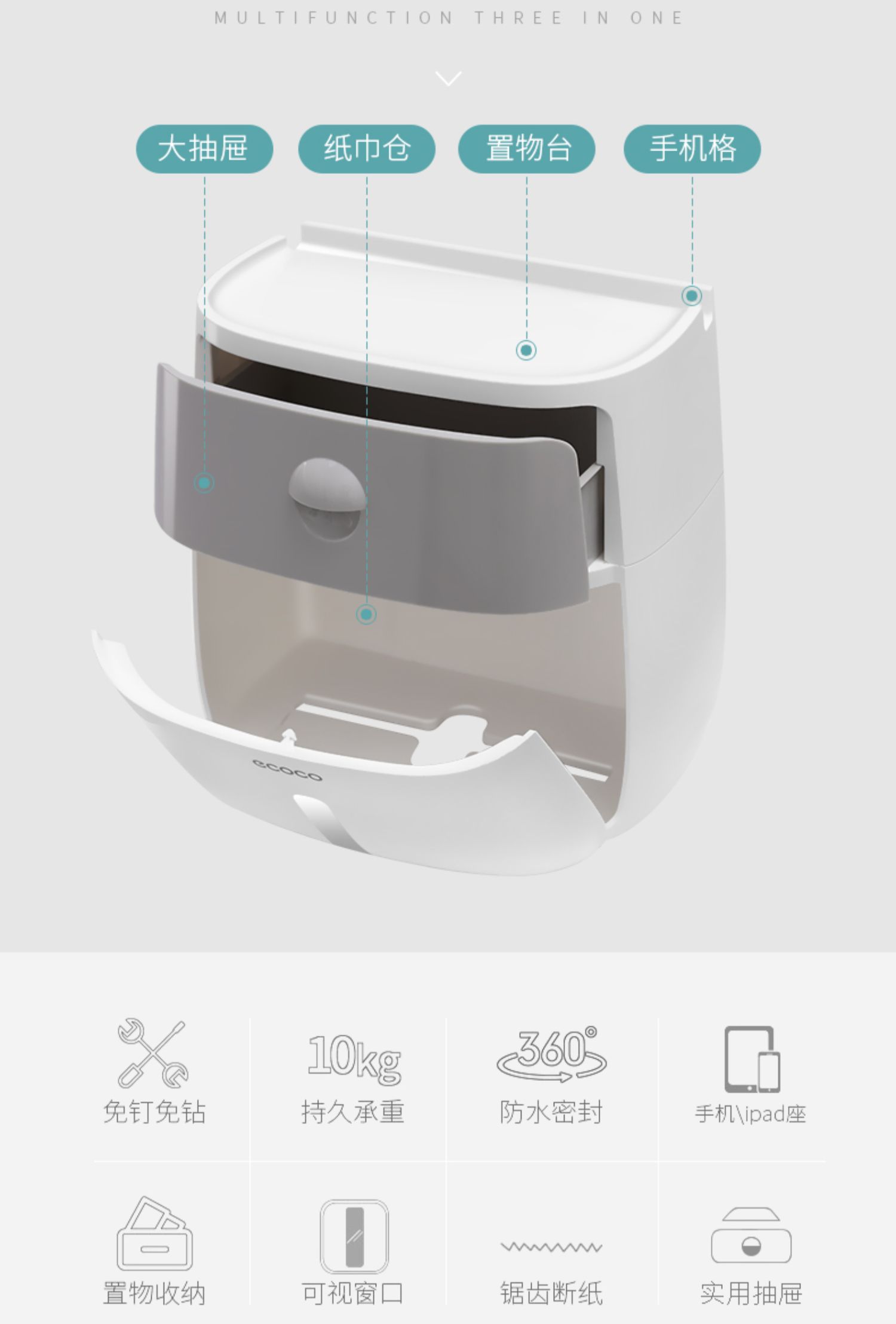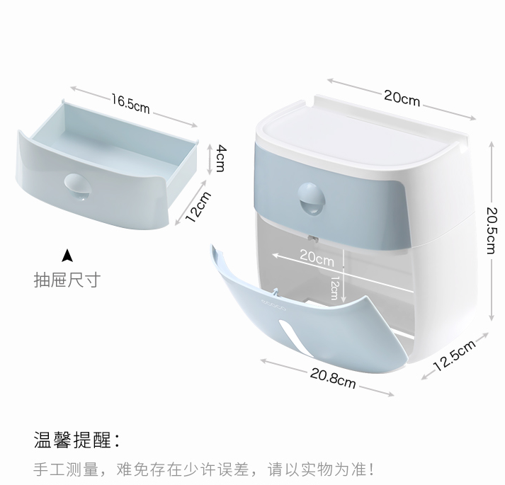 高颜值实力派,怎能不爱,免打孔安装方便,半自动按钮,一键开启,大抽屉私密空间,顶部双层置物,加高围栏设计,物品防滑不掉落,360°防水防淋,洗澡的时候也不担心纸巾打湿