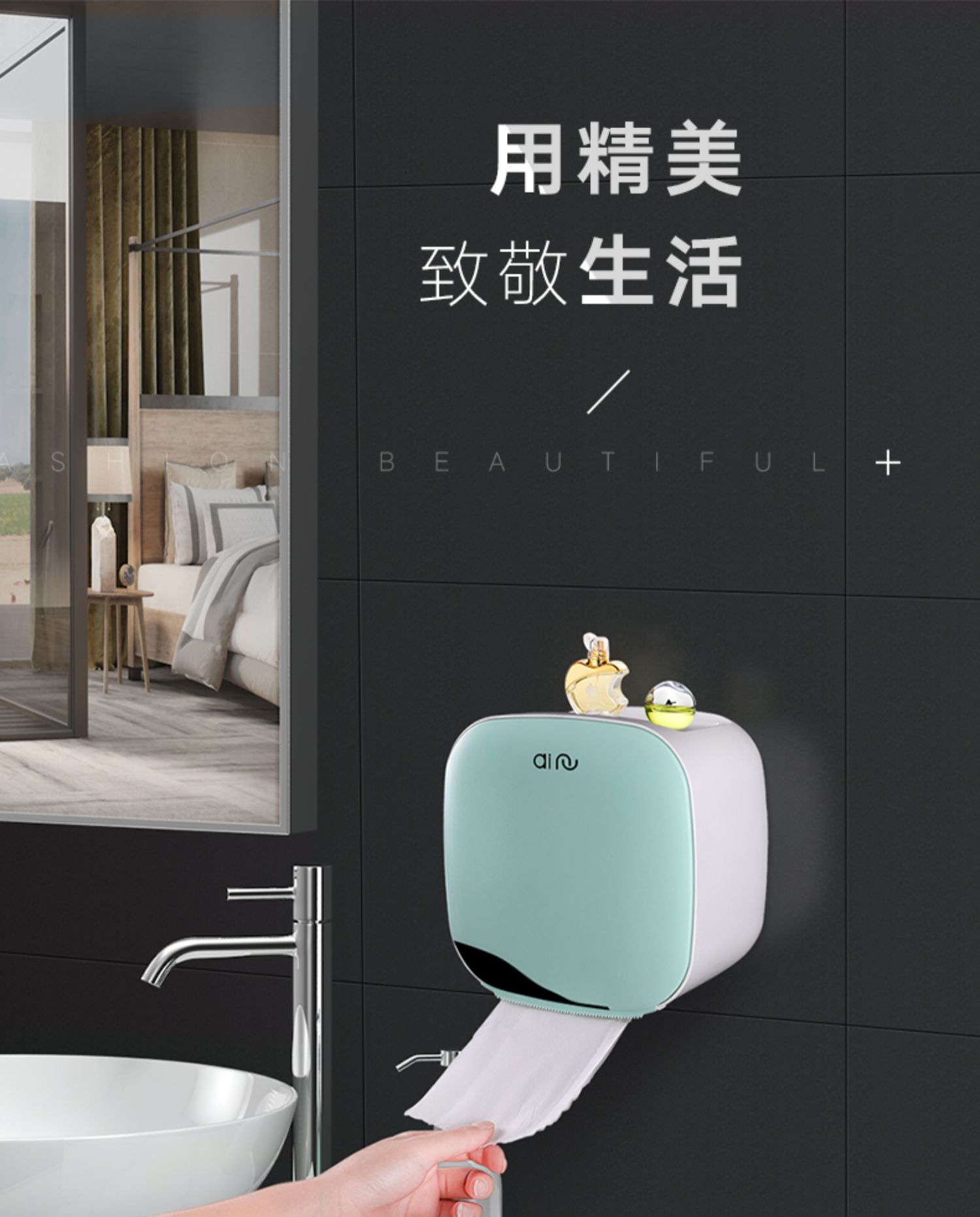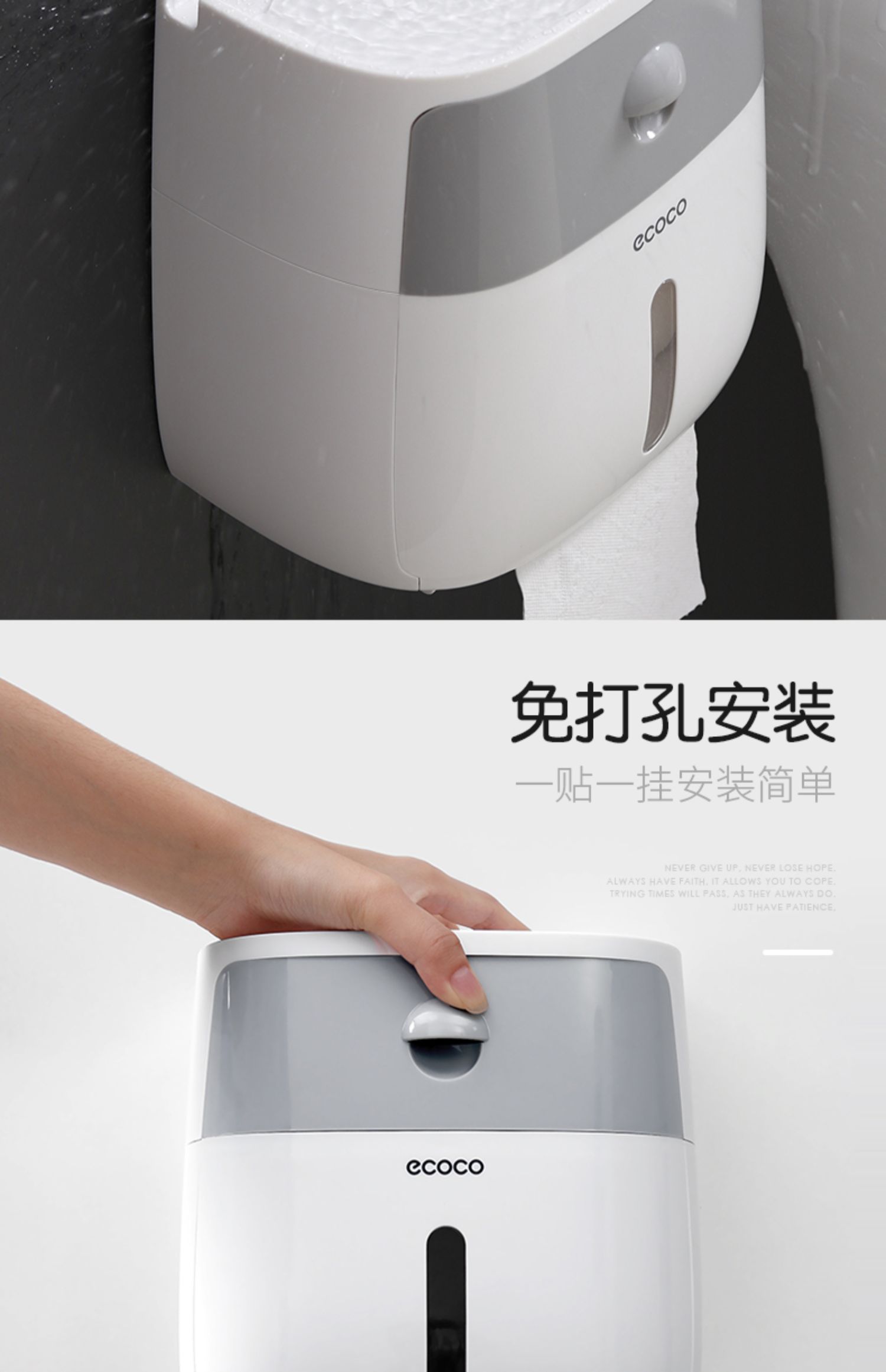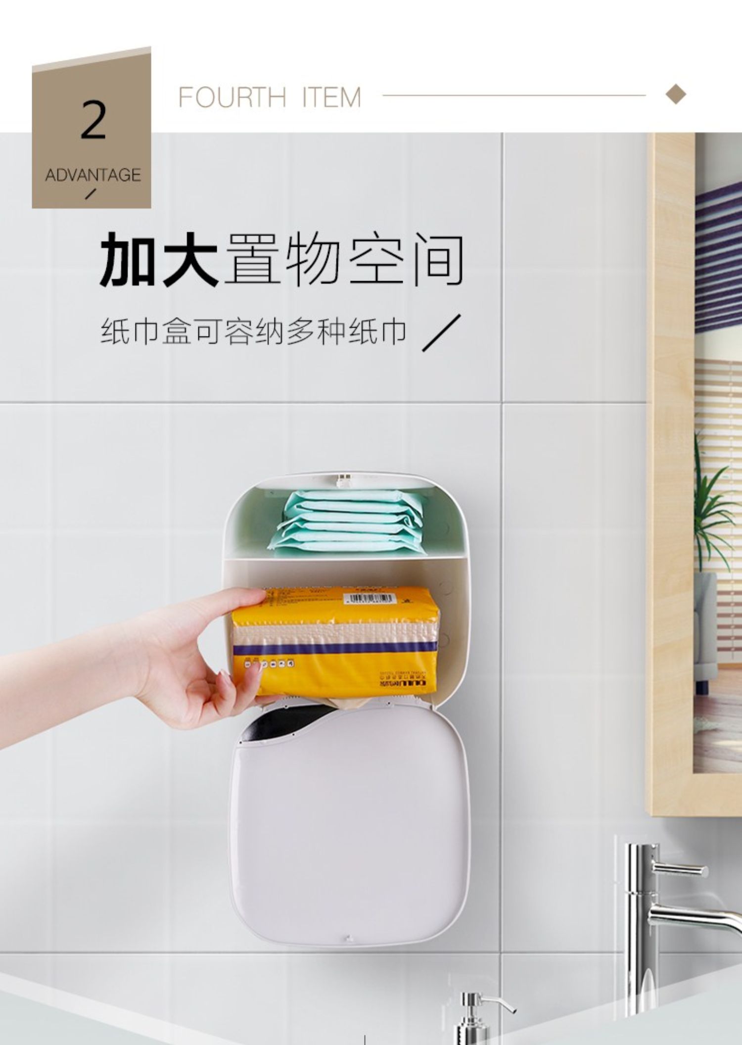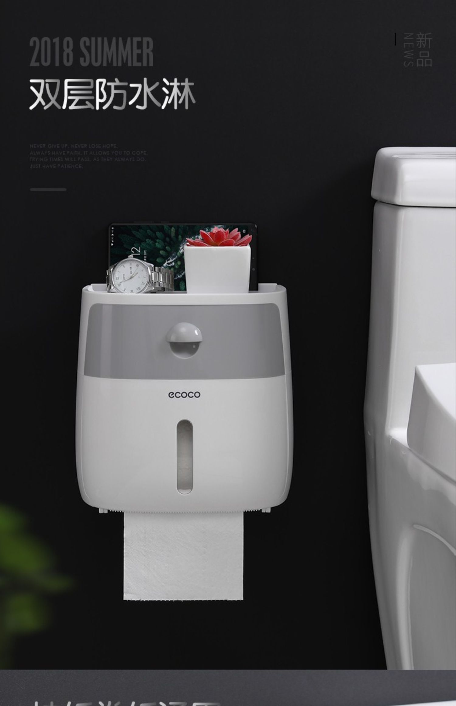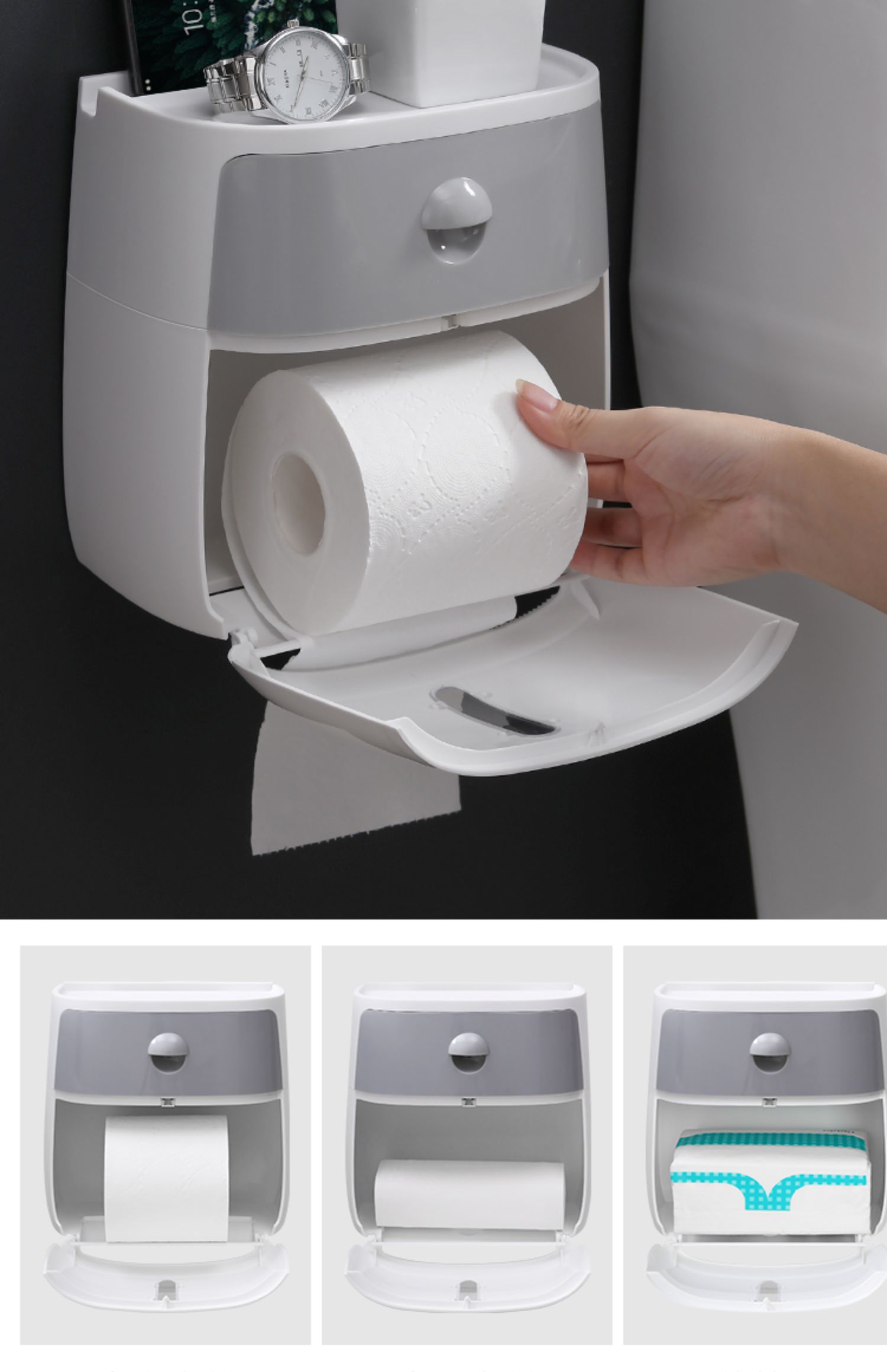 高颜值实力派,怎能不爱,免打孔安装方便,半自动按钮,一键开启,大抽屉私密空间,顶部双层置物,加高围栏设计,物品防滑不掉落,360°防水防淋,洗澡的时候也不担心纸巾打湿