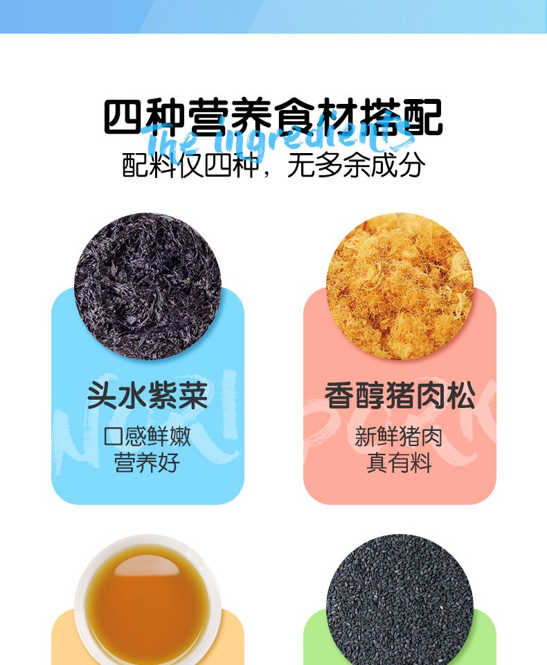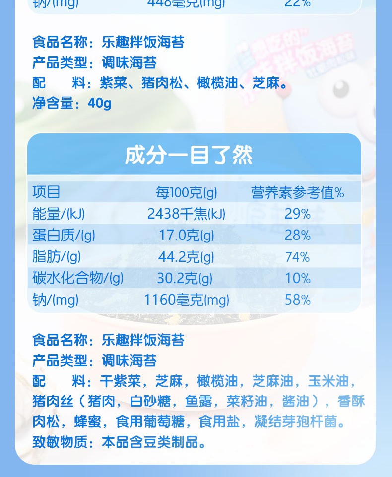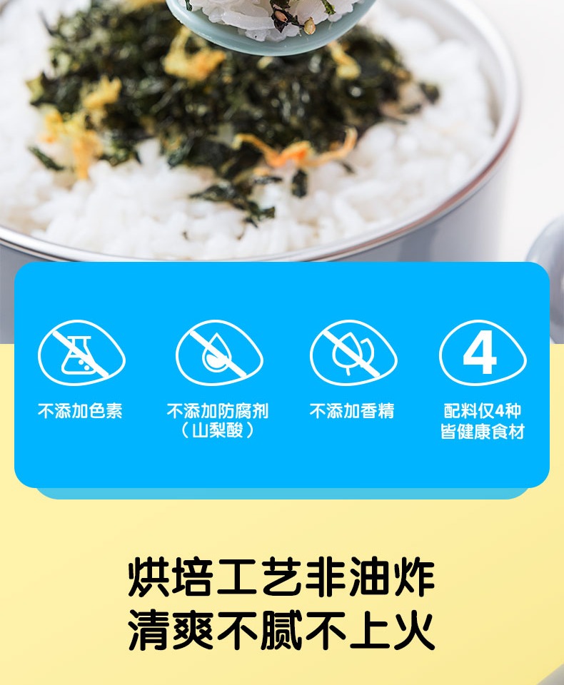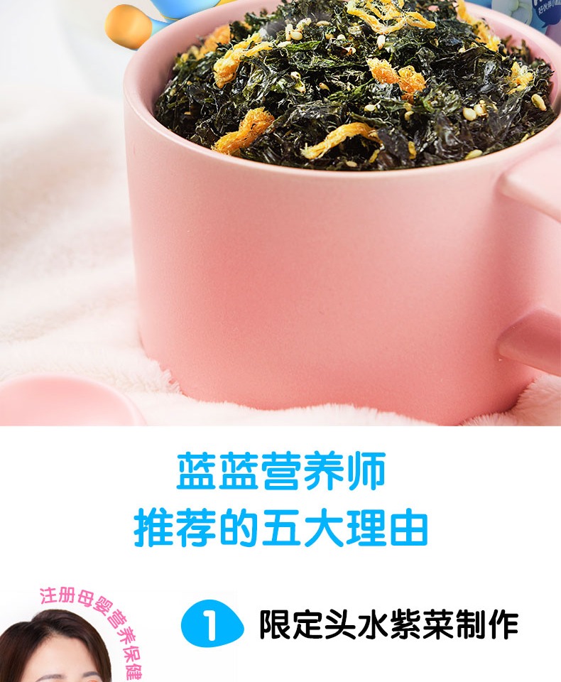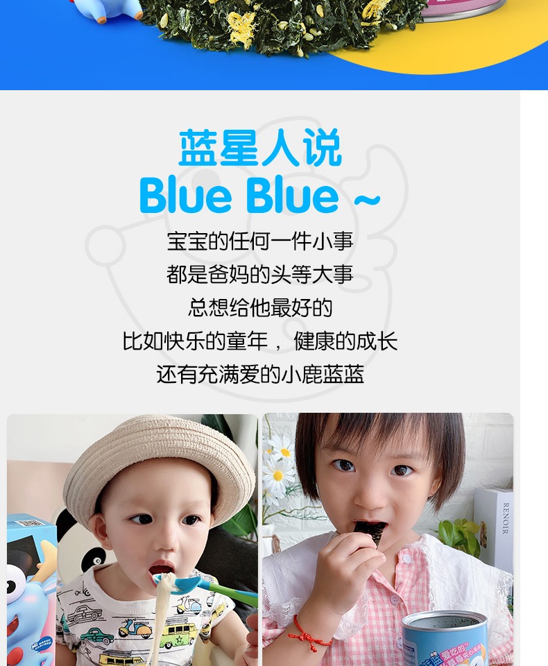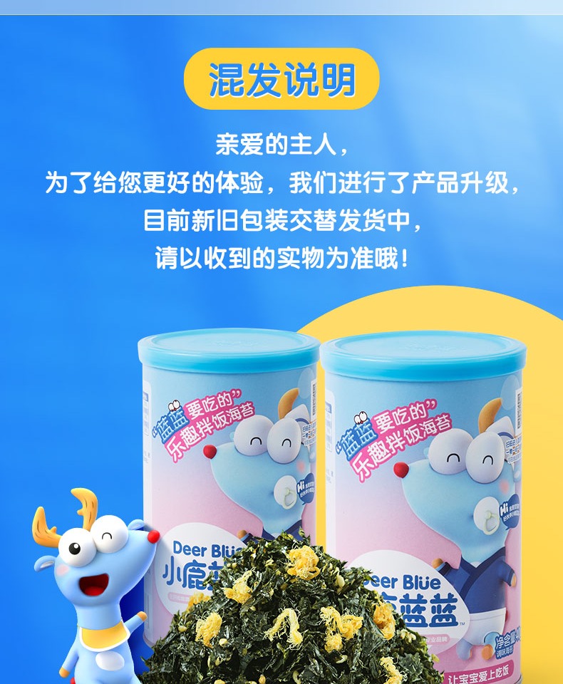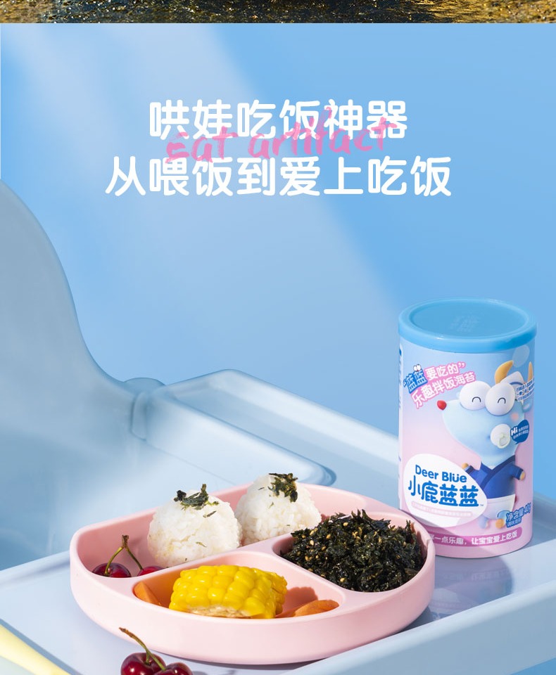 小鹿蓝蓝肉松海苔碎拌饭料,精选猪肉丝和海苔丝混合,特别添加益生菌、橄榄油,呵护宝宝小肚肚,给宝宝丰富的营养~