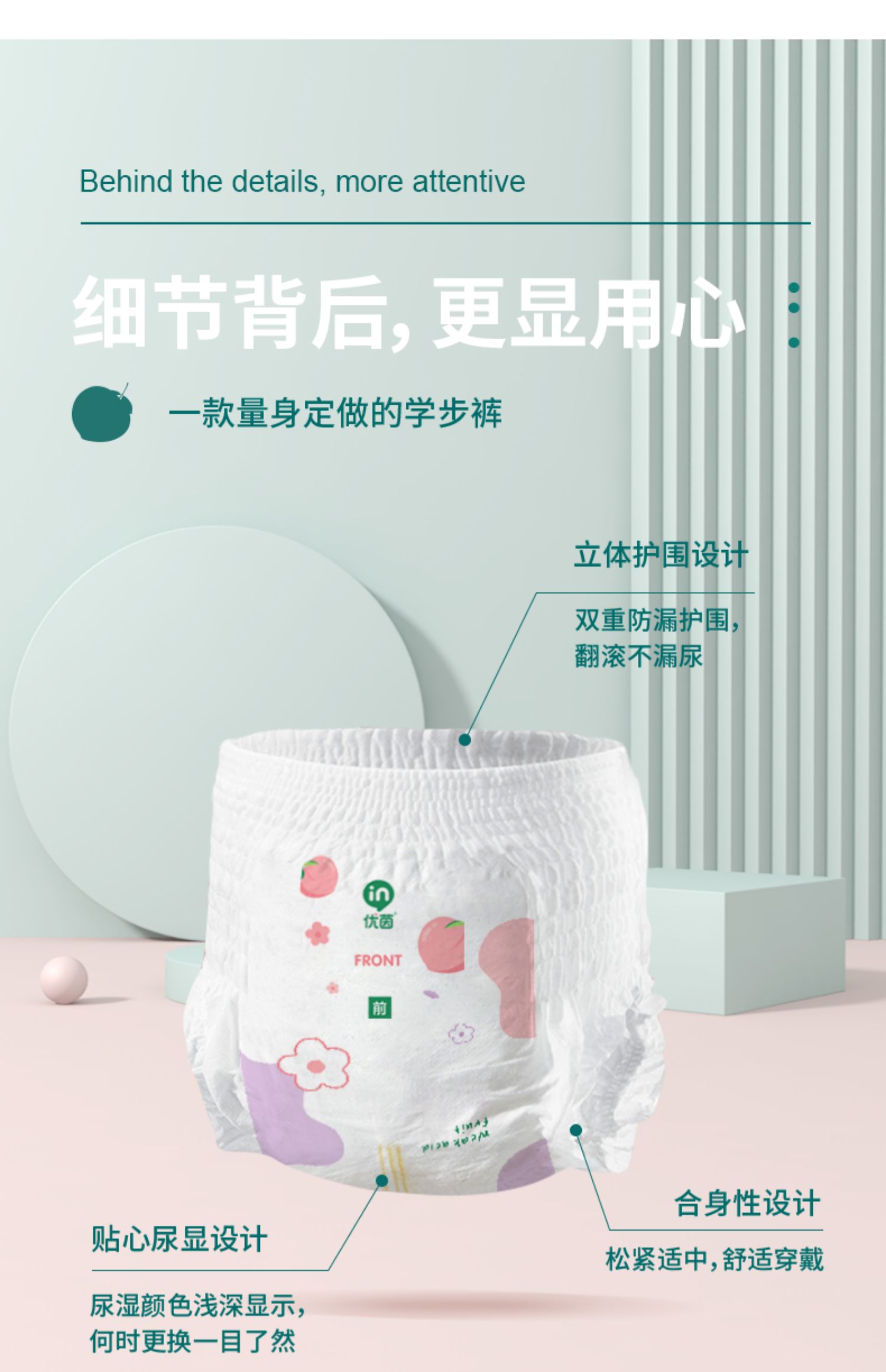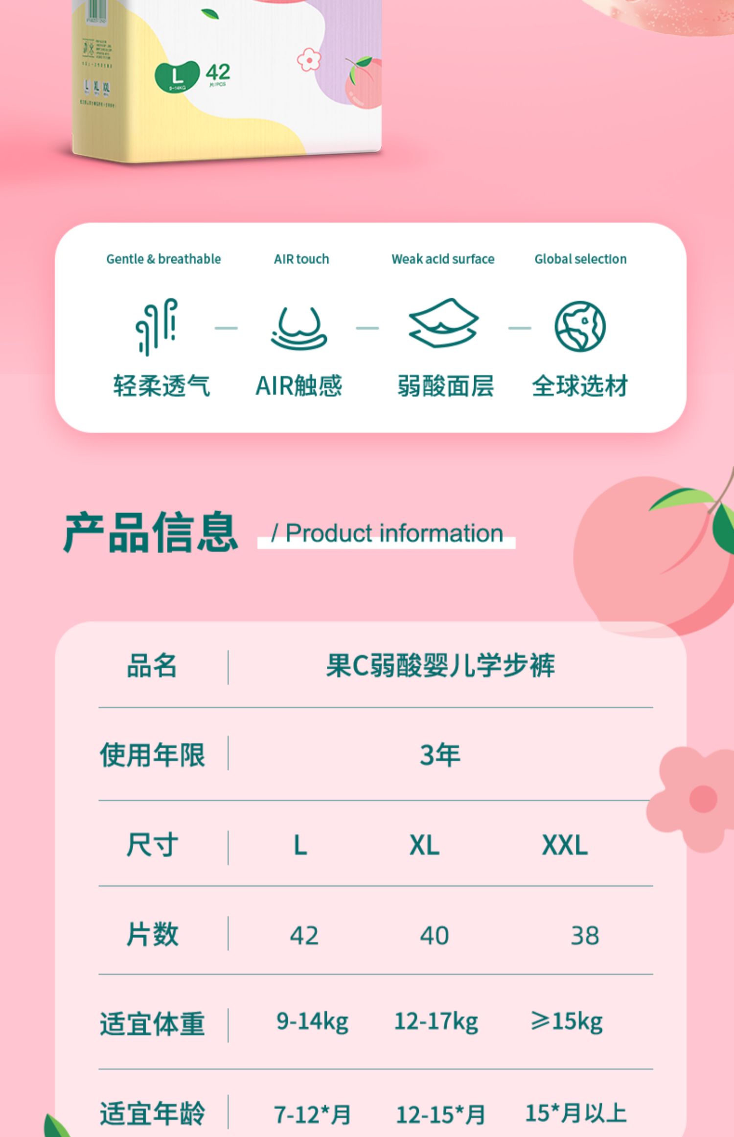 这是一款为宝宝量身定做的学步裤,中和酸碱度减少氮气对宝宝皮肤的刺激,给小PP创造低敏舒适的环境~3D水果AIR触感面层,保持小PP长效干爽~限时活动,宝妈快抢!