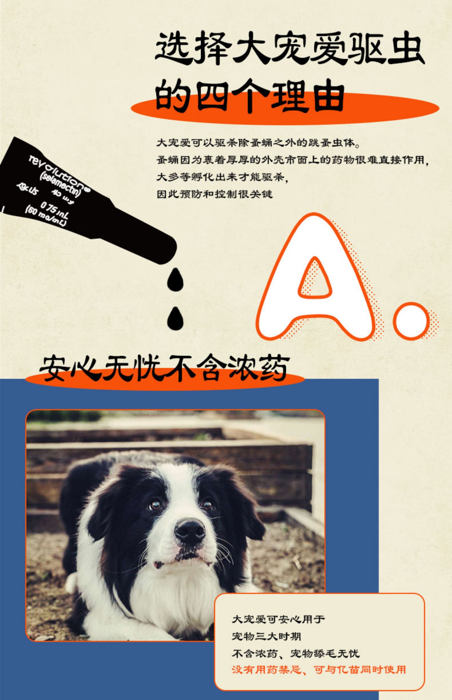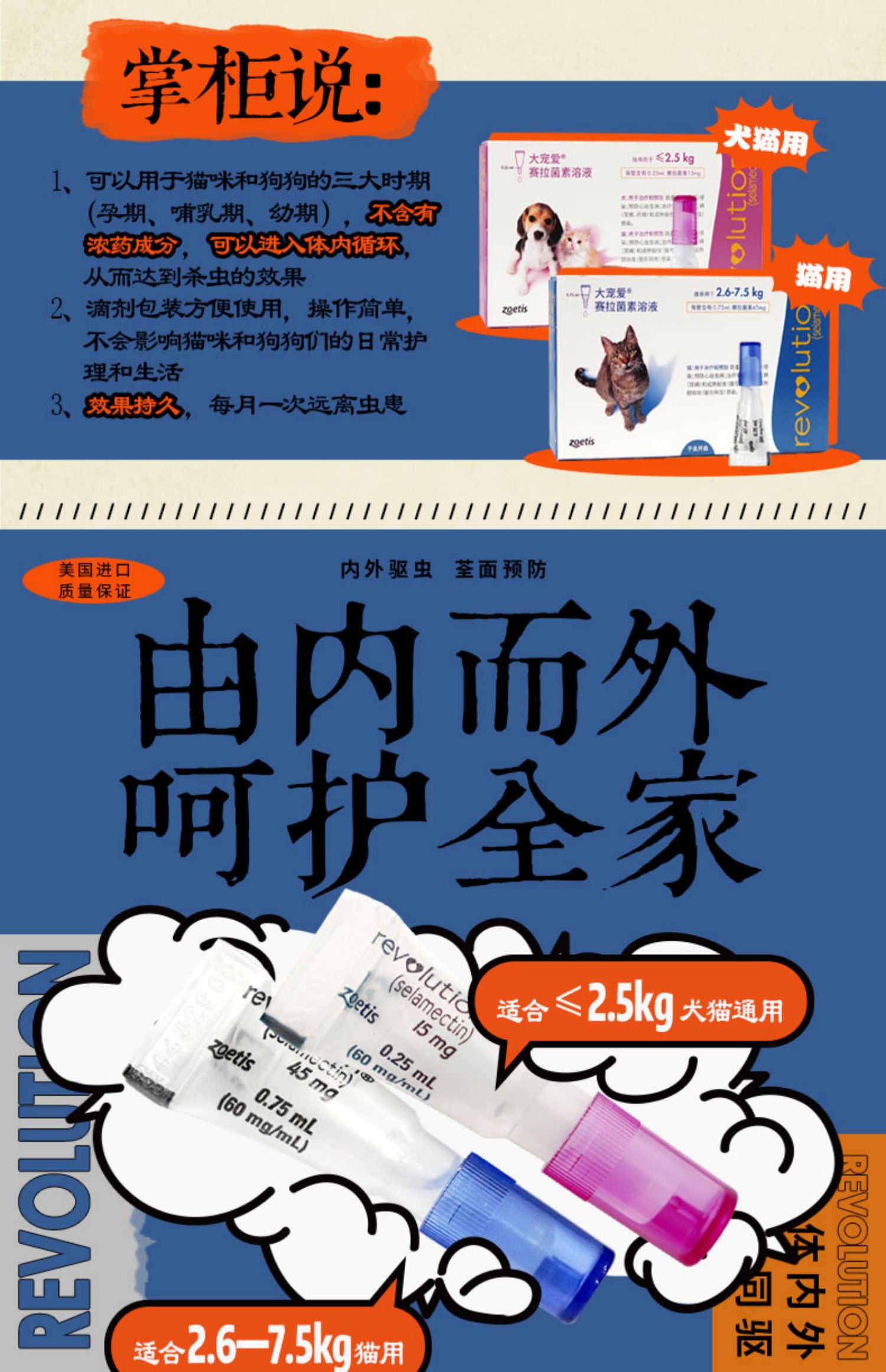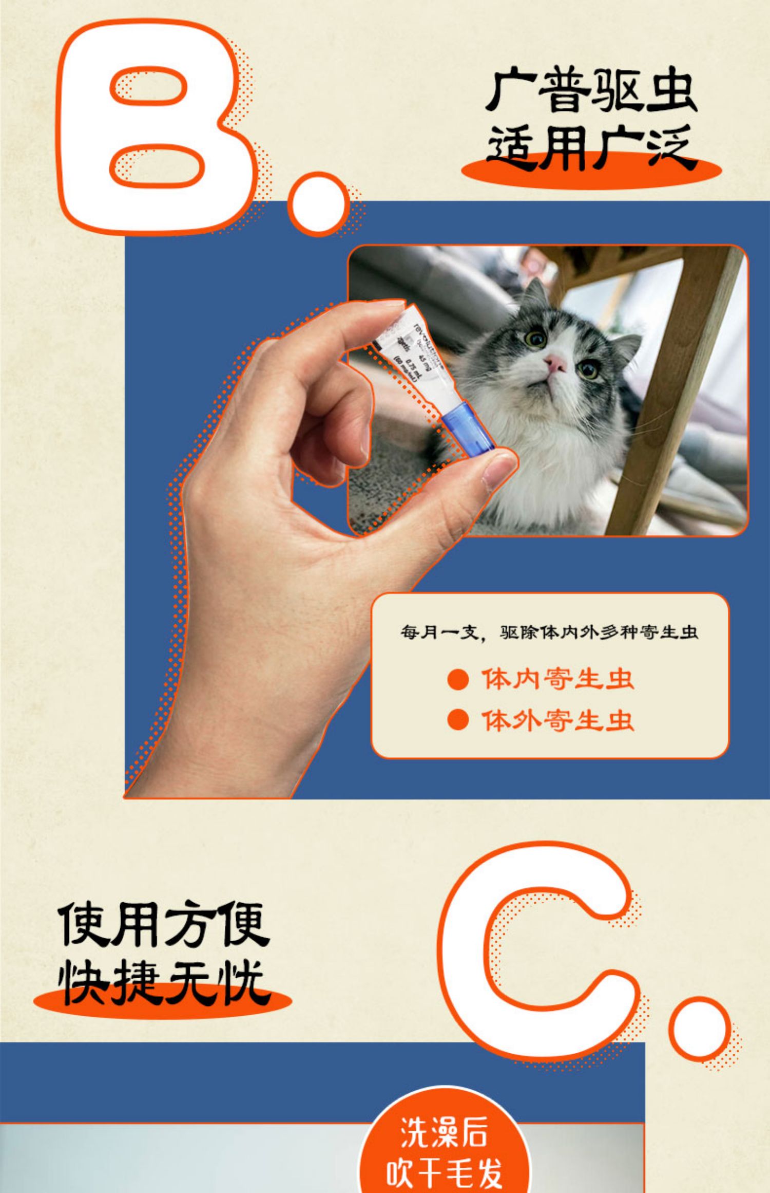 2.6kg-7.5kg内猫咪使用,有效驱除跳蚤、跳蚤蛋、耳螨、虱子、蛔虫钩虫等,孕期哺乳期可用,每月1支大宠爱,内外驱虫,呵护全家
