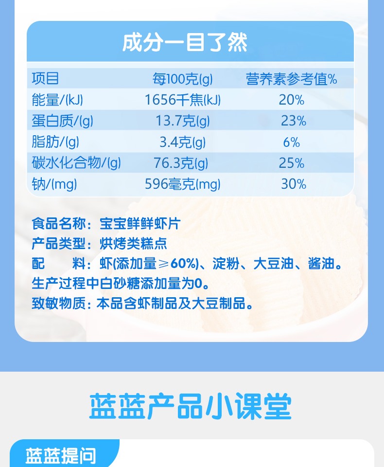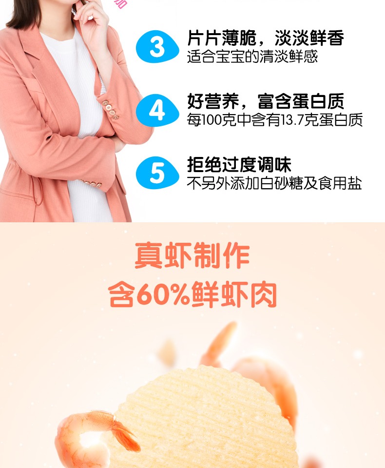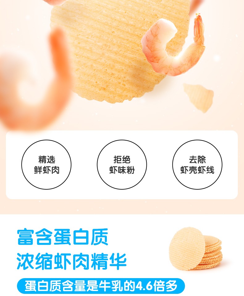 送一岁婴儿辅食食谱,宝宝鲜虾片,真虾制作,鲜味直达,百分之60鲜虾肉,双重杀菌,非油炸膨化工艺,富含蛋白质,片片酥脆,钠含量,无负担,妈妈更安心。