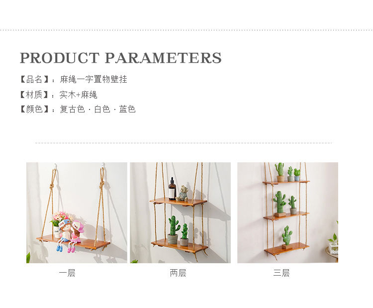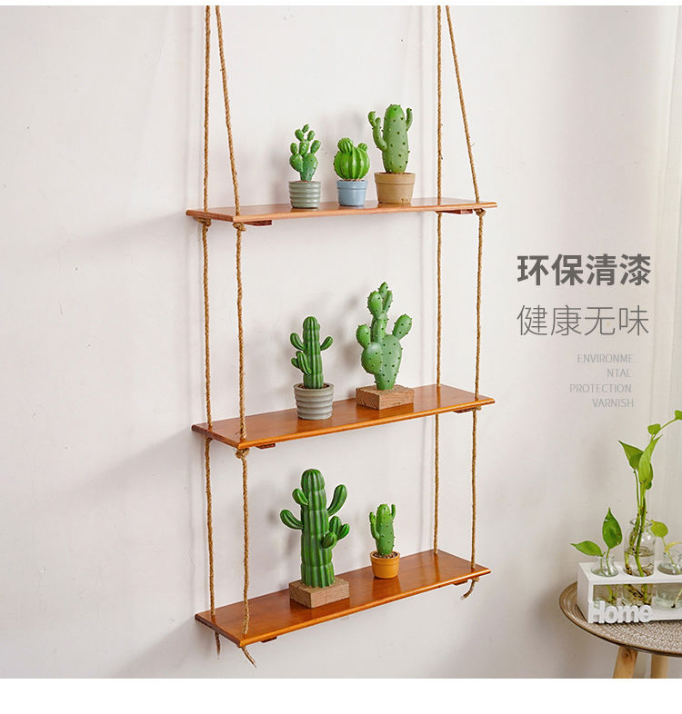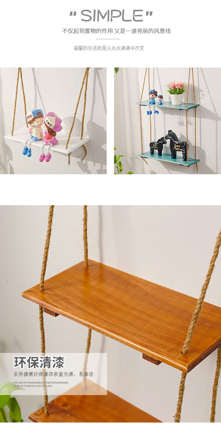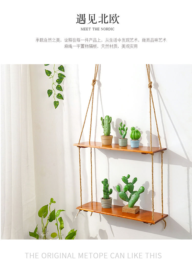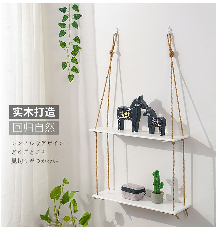 a卧室墙上置物架免打孔麻绳一字隔板实木