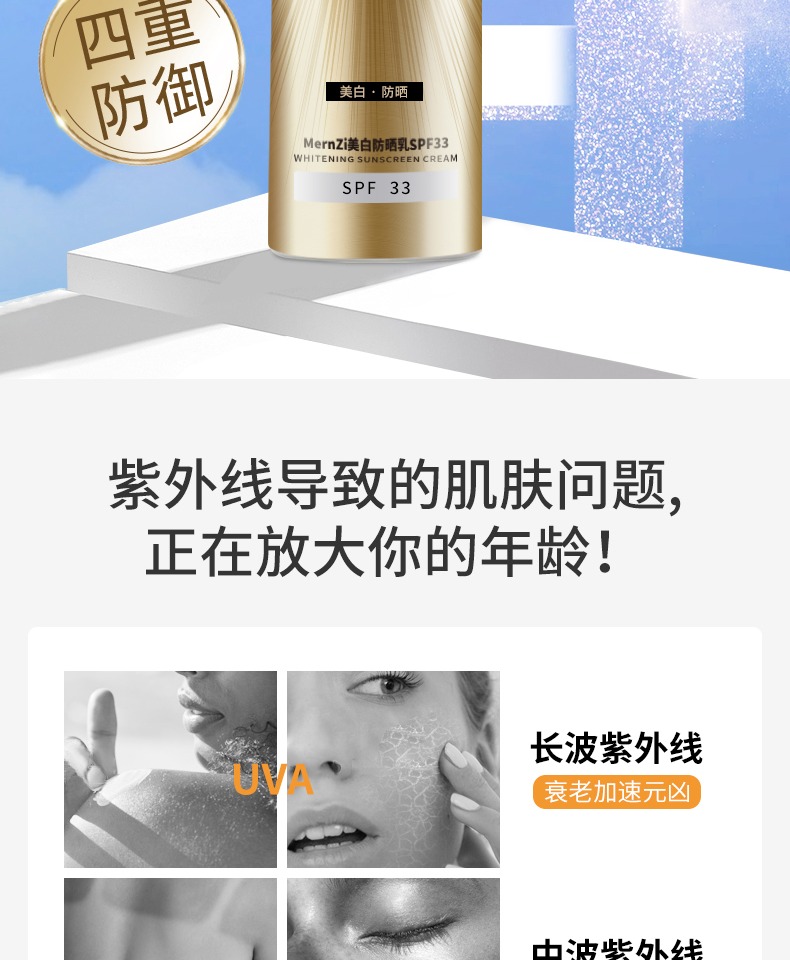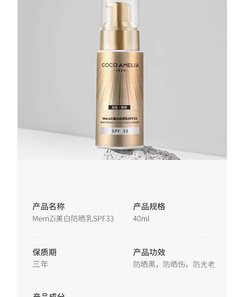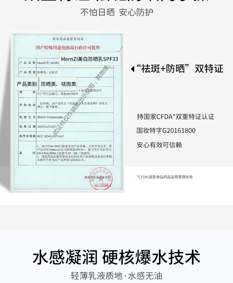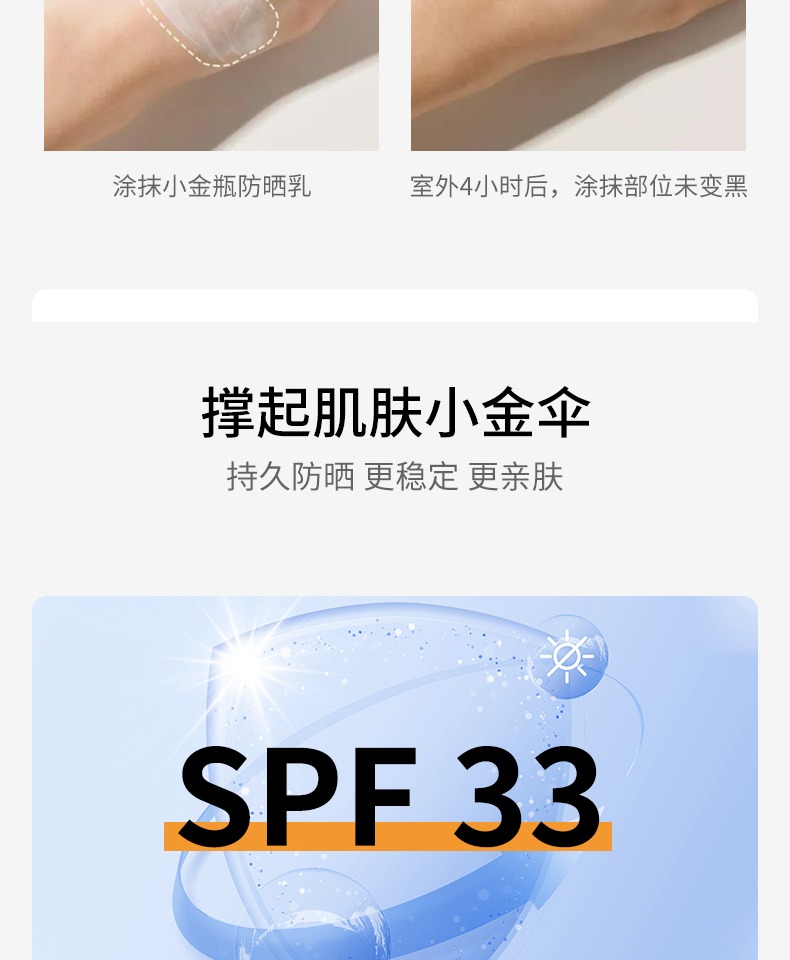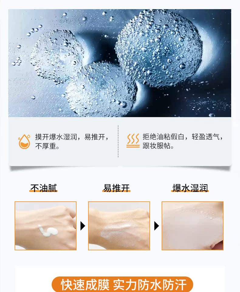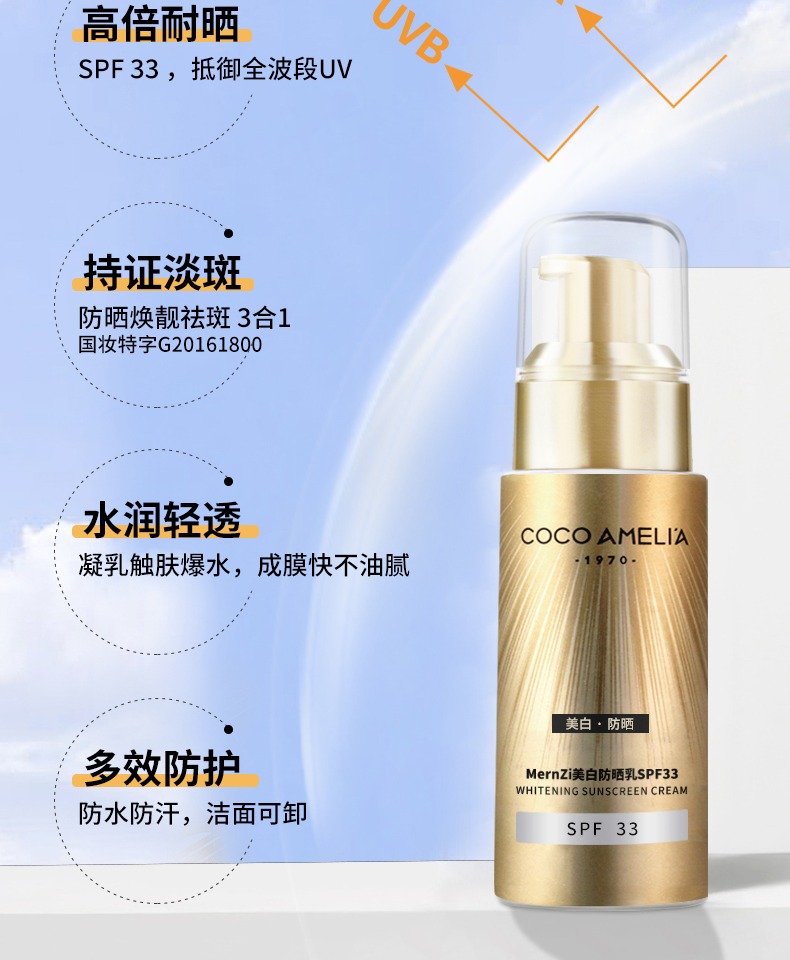 SPF33!!防晒、美白、祛斑、爆水四效合一,乳液质感,湿润轻盈,清新香调,疗愈舒心;有效隔断紫外线,减少黑色素的堆积,淡化色斑,提亮肤色;质地轻盈,贴合肌肤,特添加养肤成分,润养肌肤的同时形成屏障!