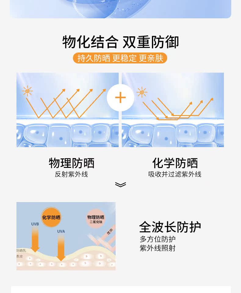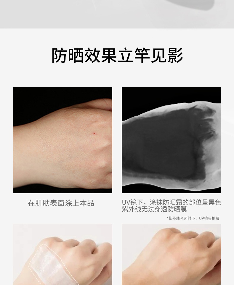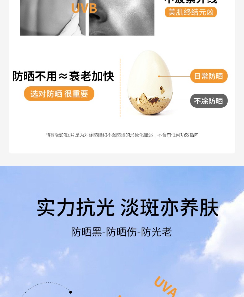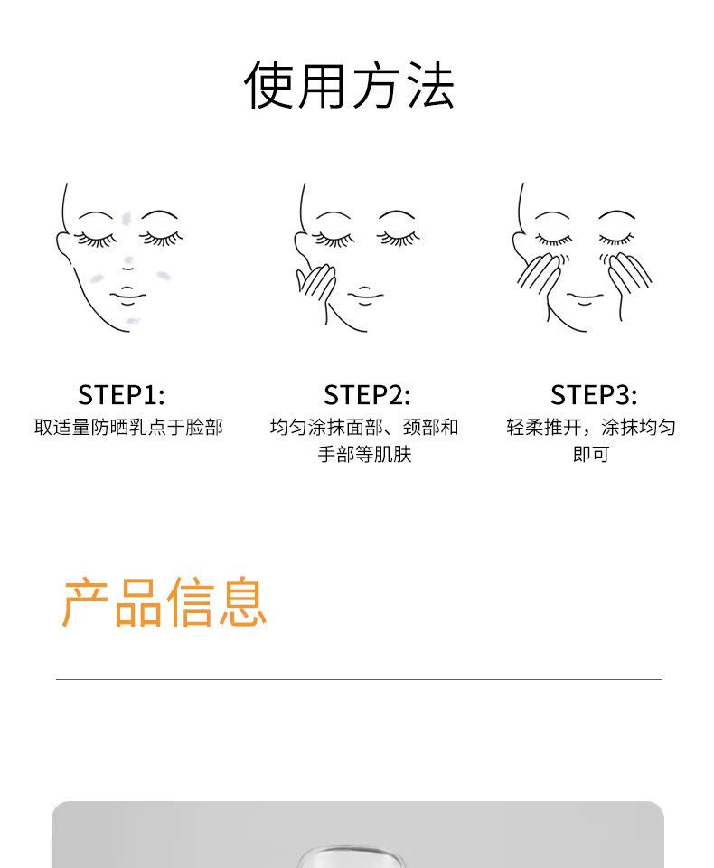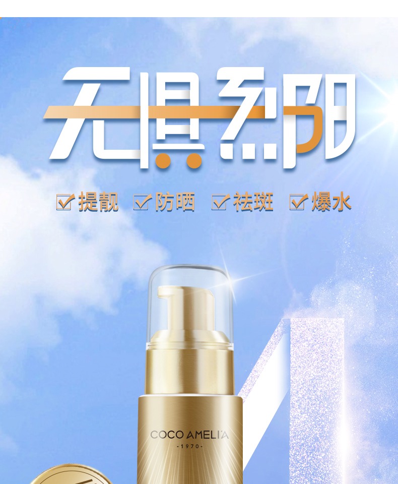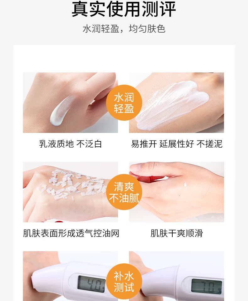 SPF33!!防晒、美白、祛斑、爆水四效合一,乳液质感,湿润轻盈,清新香调,疗愈舒心;有效隔断紫外线,减少黑色素的堆积,淡化色斑,提亮肤色;质地轻盈,贴合肌肤,特添加养肤成分,润养肌肤的同时形成屏障!