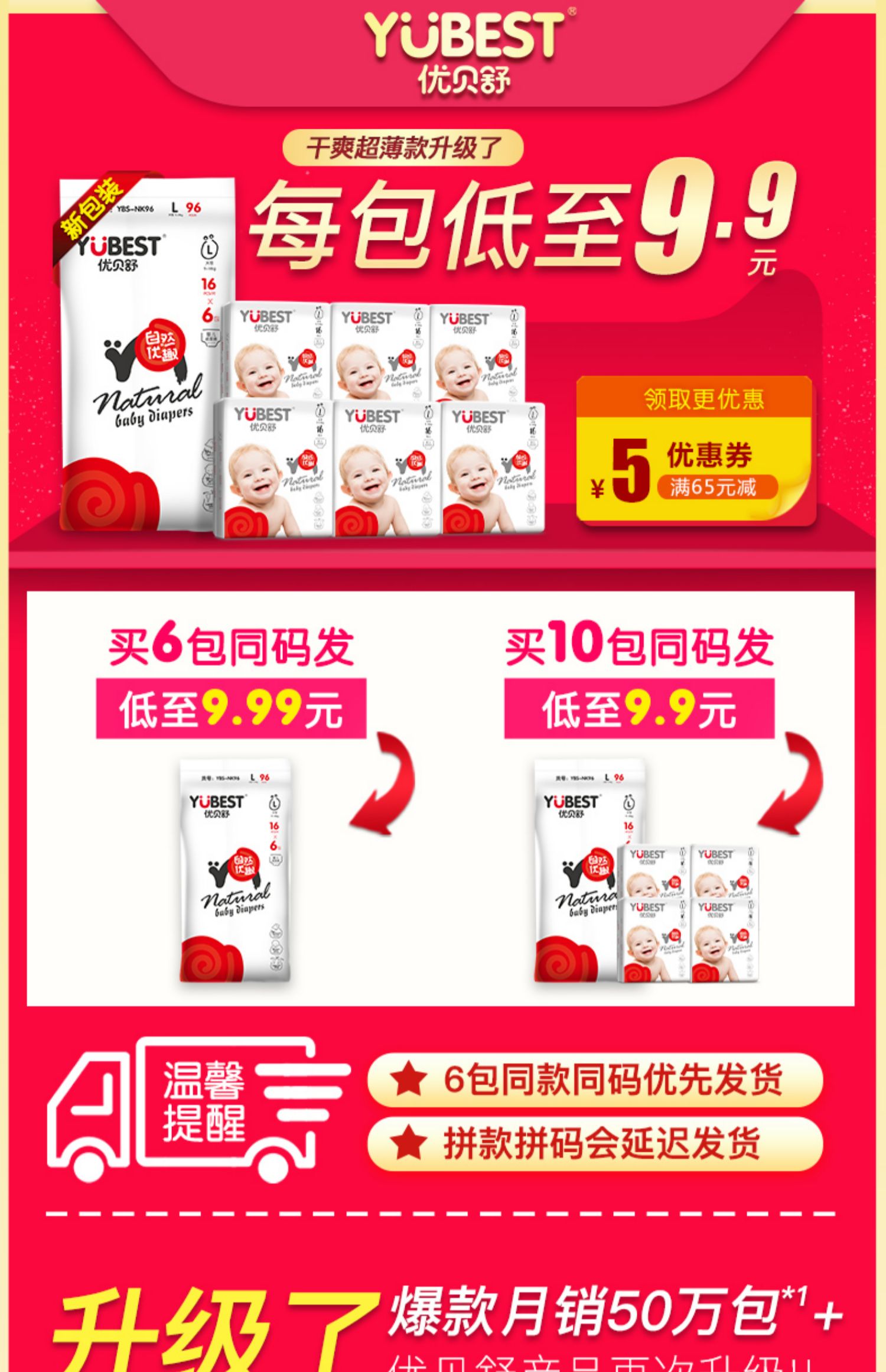 爆款特卖,累计销售1200万+,76万好评!优贝舒步步优趣系列纸尿裤、拉拉裤所有码自选,绵柔自然舒适,超薄瞬吸防,亲肤绵柔,拒绝红屁屁,亲民好价,亲子节宝妈安心买,宝宝安心穿。
