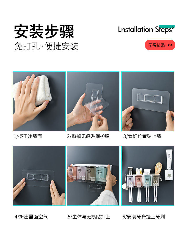 易取易放,多格收纳,置物台归纳收纳,告别杂乱,防尘防霉,定量不浪费,每次挤出都是同等计量,强悍承重力,强力贴持久承重,安稳稳固,放心使用。