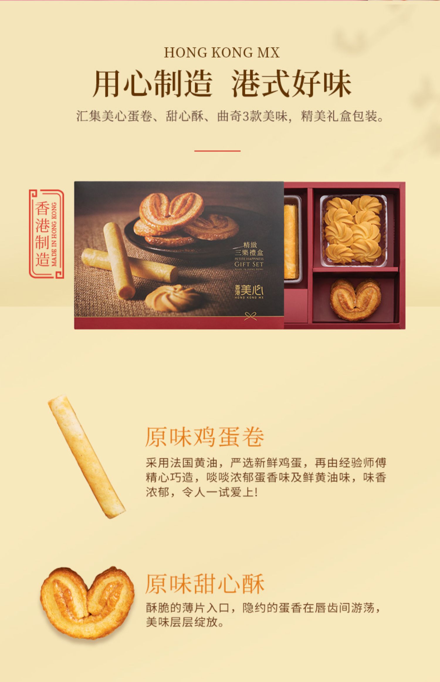 快抢!【美心官方旗舰店】美心蛋卷,甜心酥,曲奇三口味礼盒,线下超128元/盒!采用进口黄油,由经验师傅精心制作,色泽金黄,甘香酥脆,酥软可口,超级好吃!精美礼盒包装,3种不同口味,独立小包装,方便携带