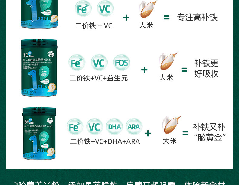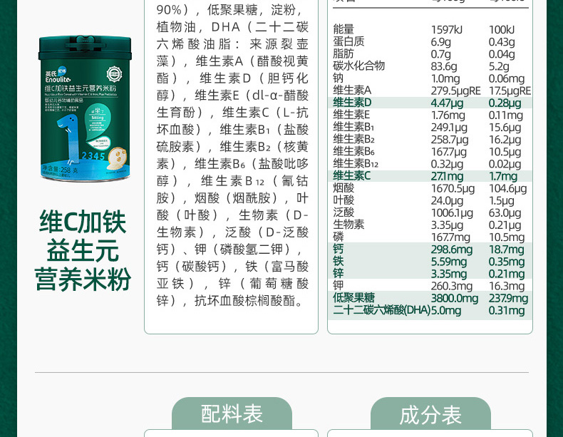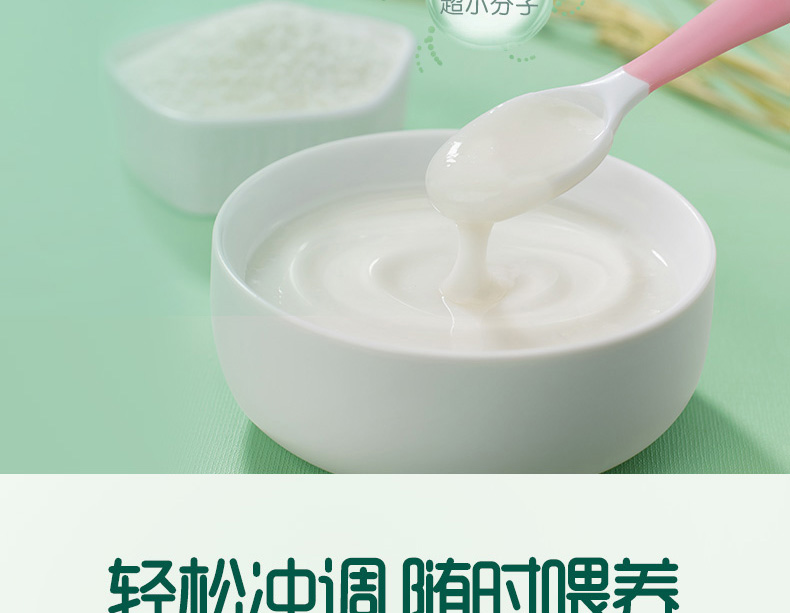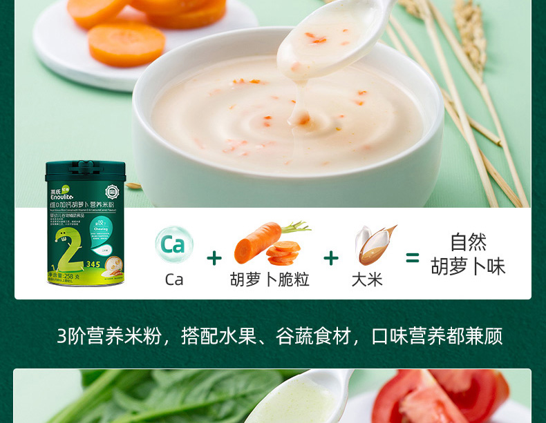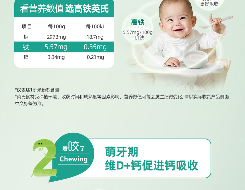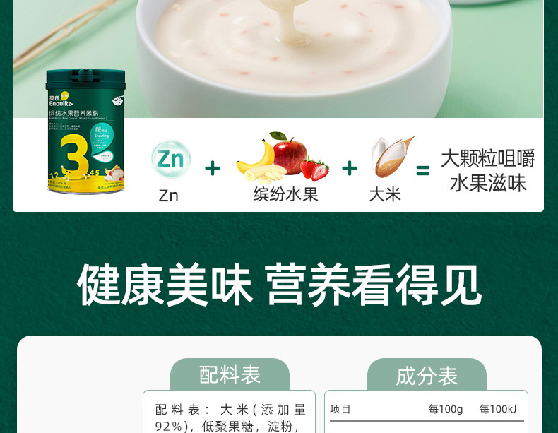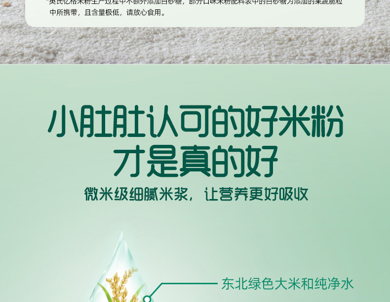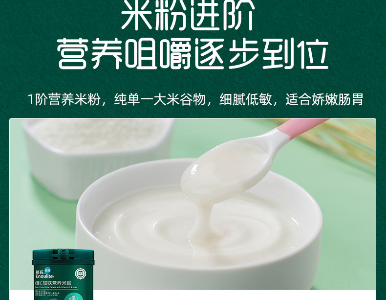 英氏婴儿营养辅食米粉,米粉中不添加多余成分,充分满足宝宝日常所需,维C加铁口感细腻,吸收加倍,全方位守护宝宝健康成长