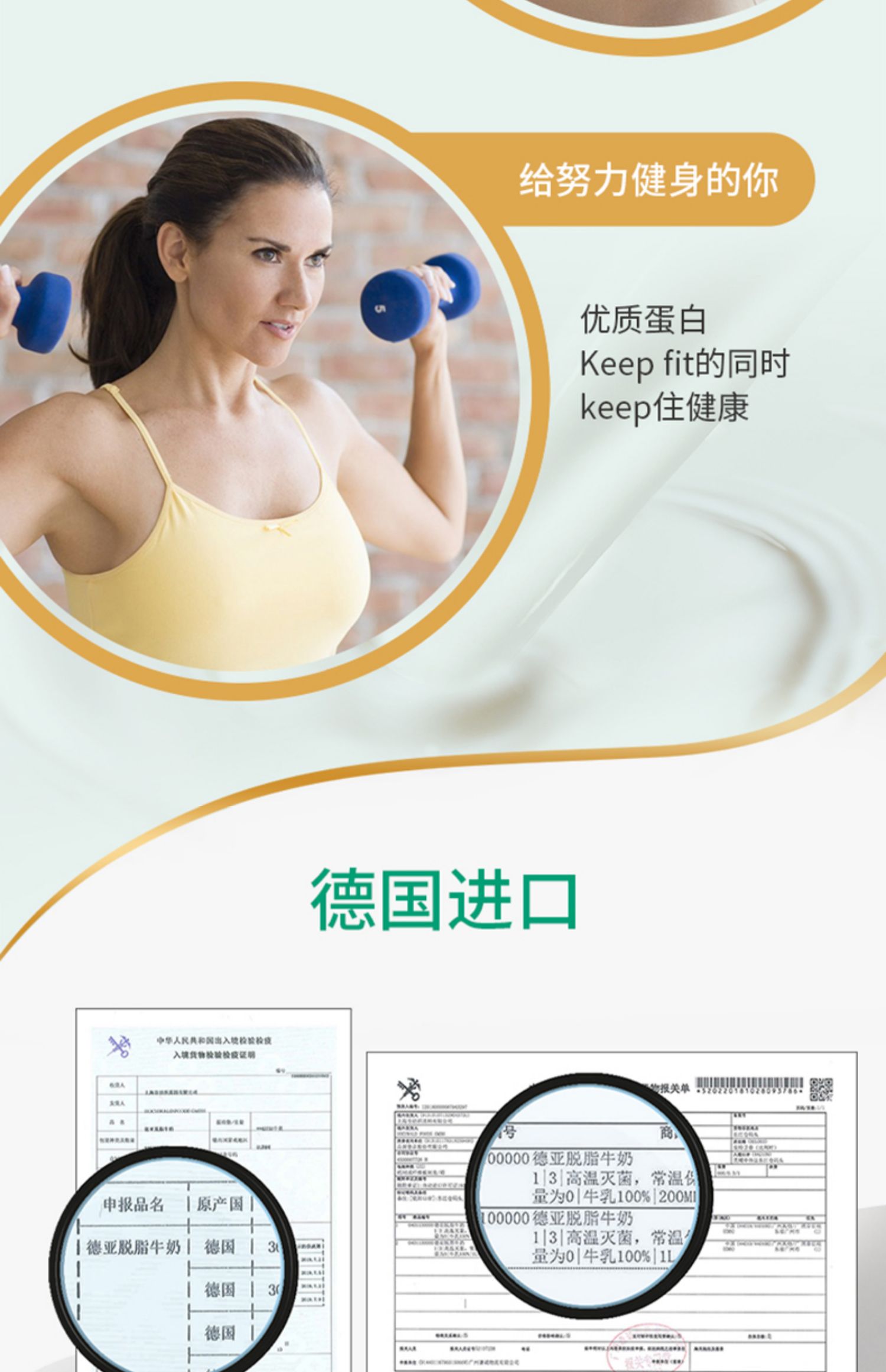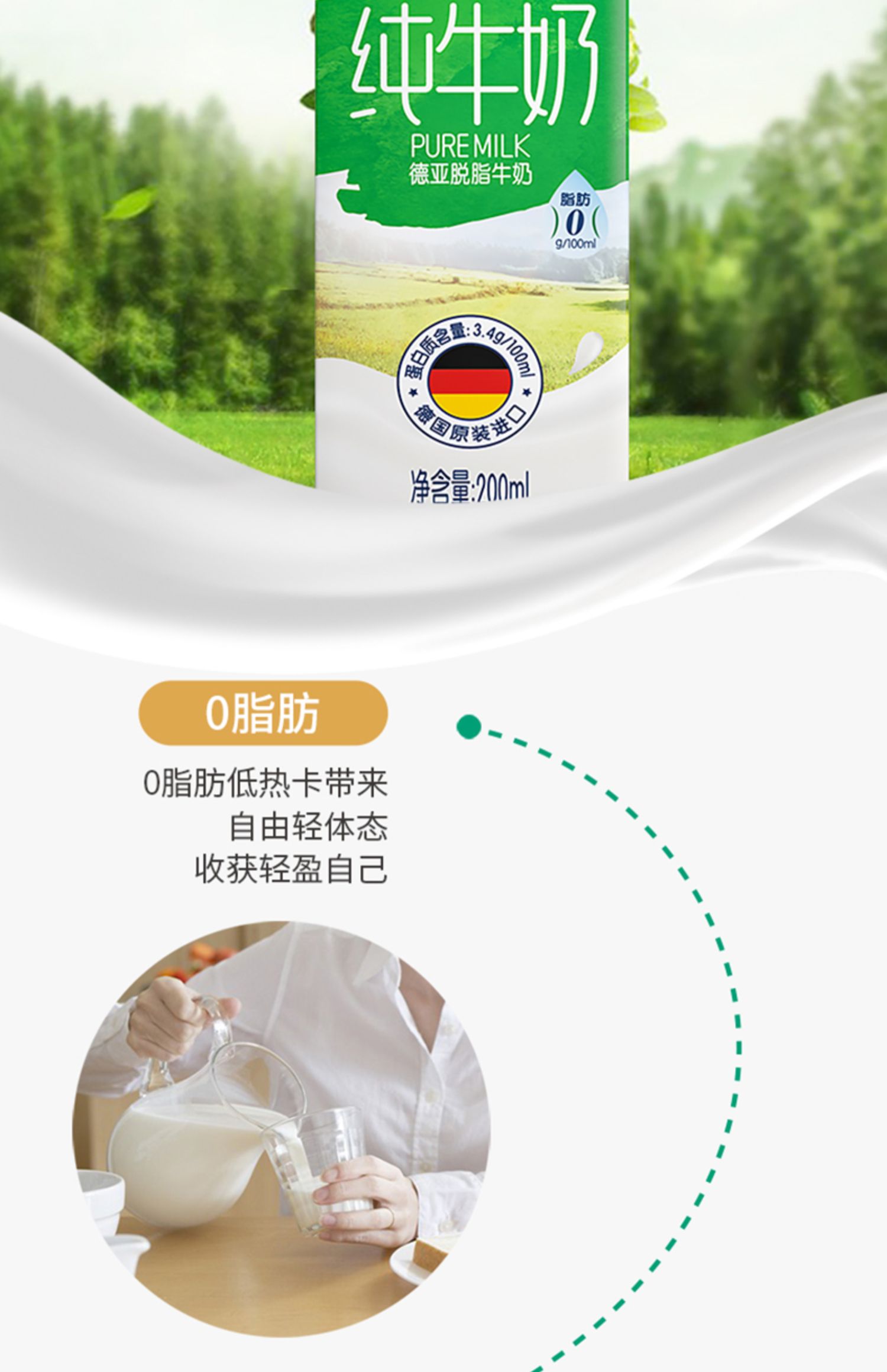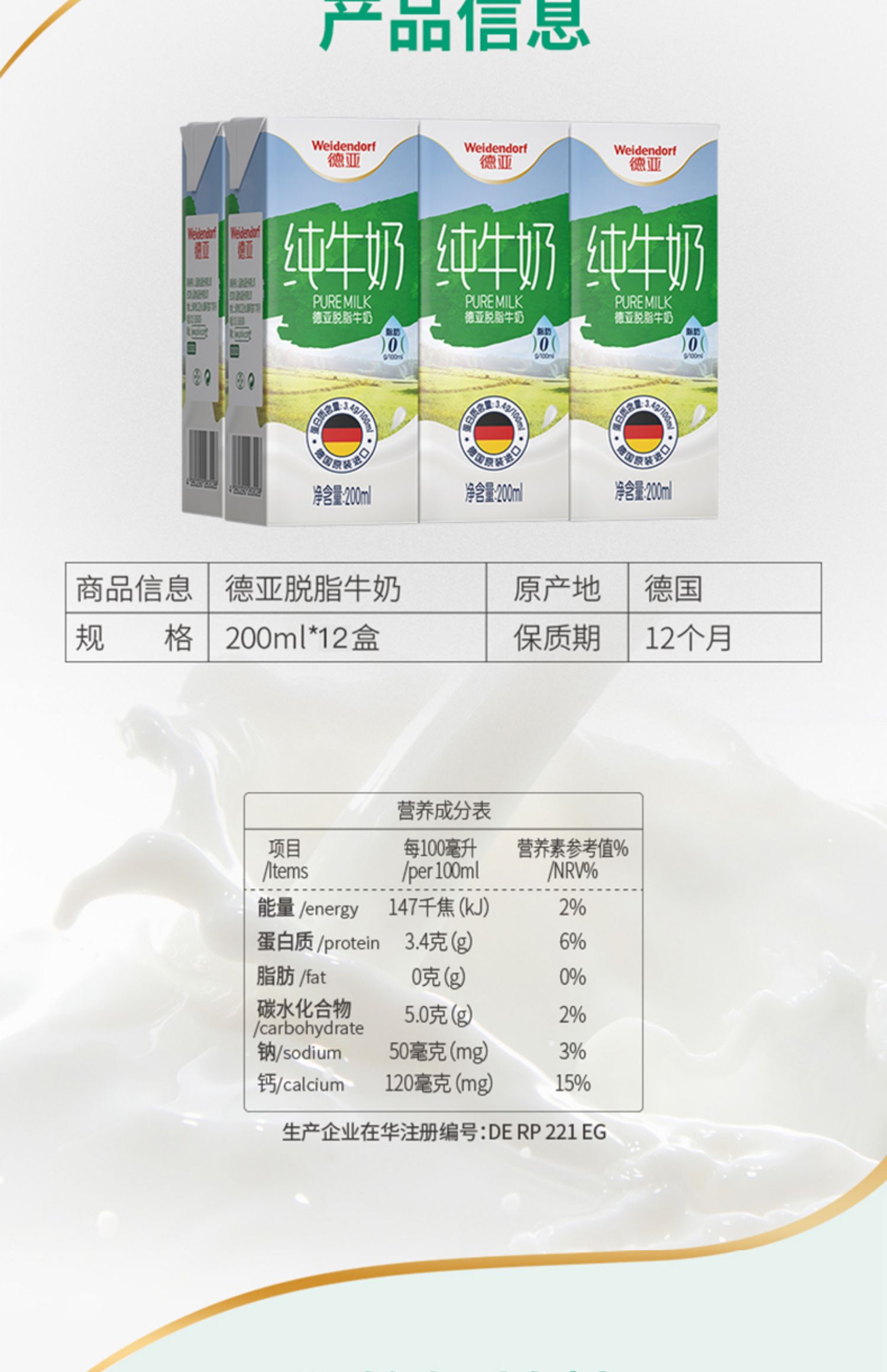 【德亚】德国原装进口脱脂纯牛奶,200ml*12盒装,优选全球黄金奶源带,优质蛋白,进口奶源,新鲜批次。