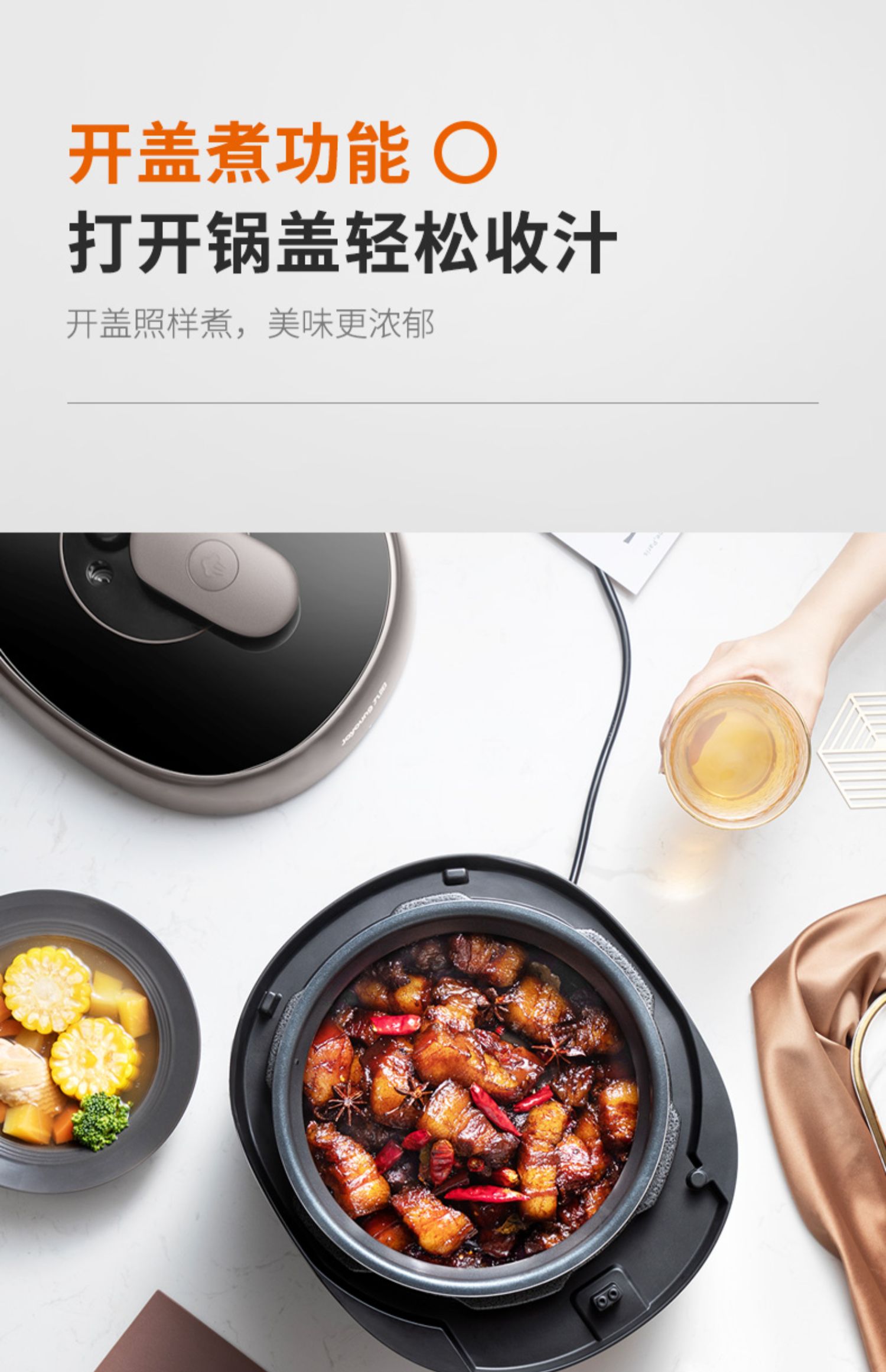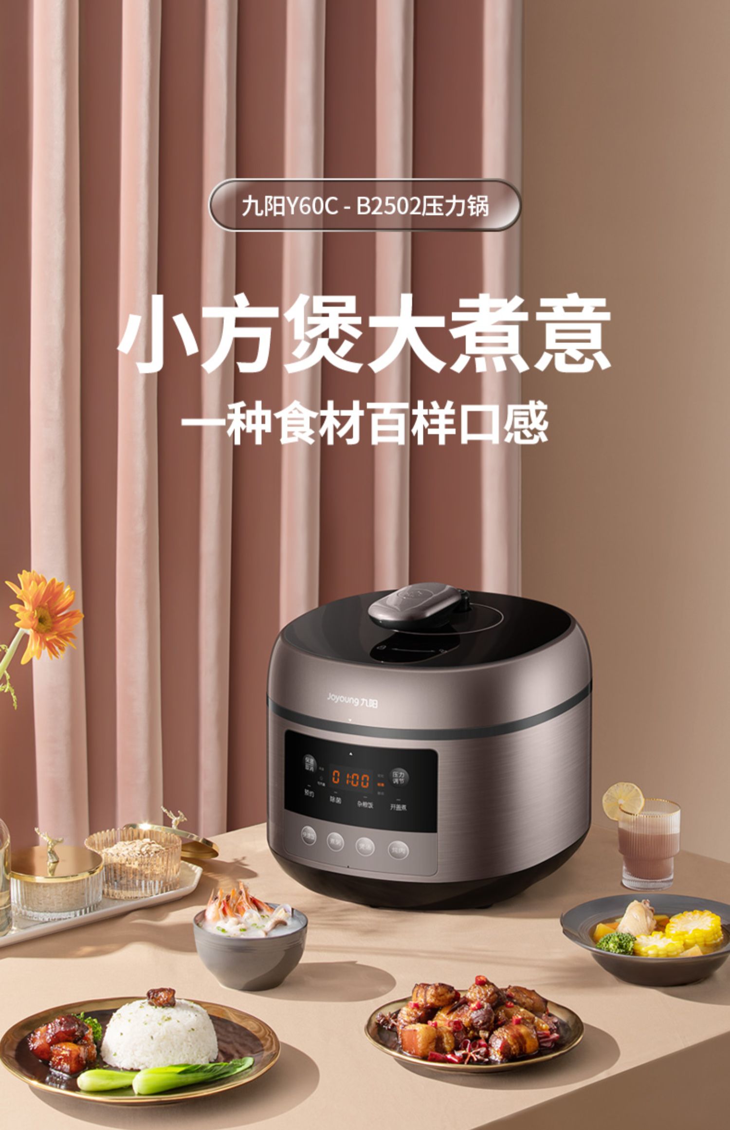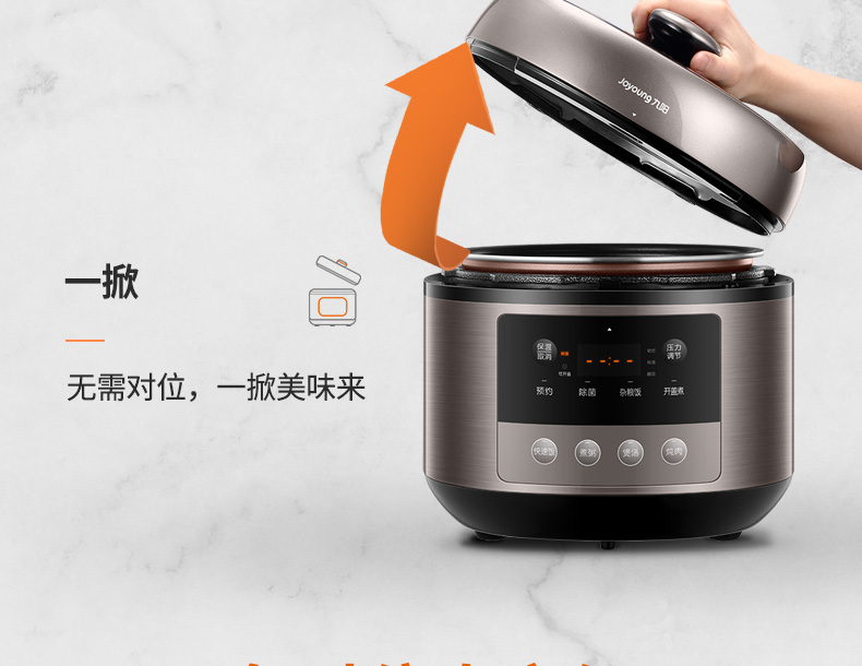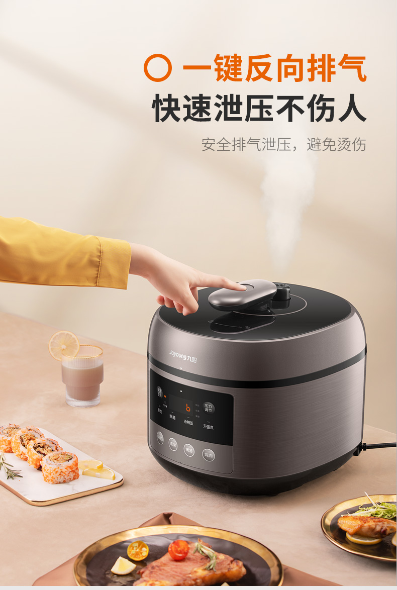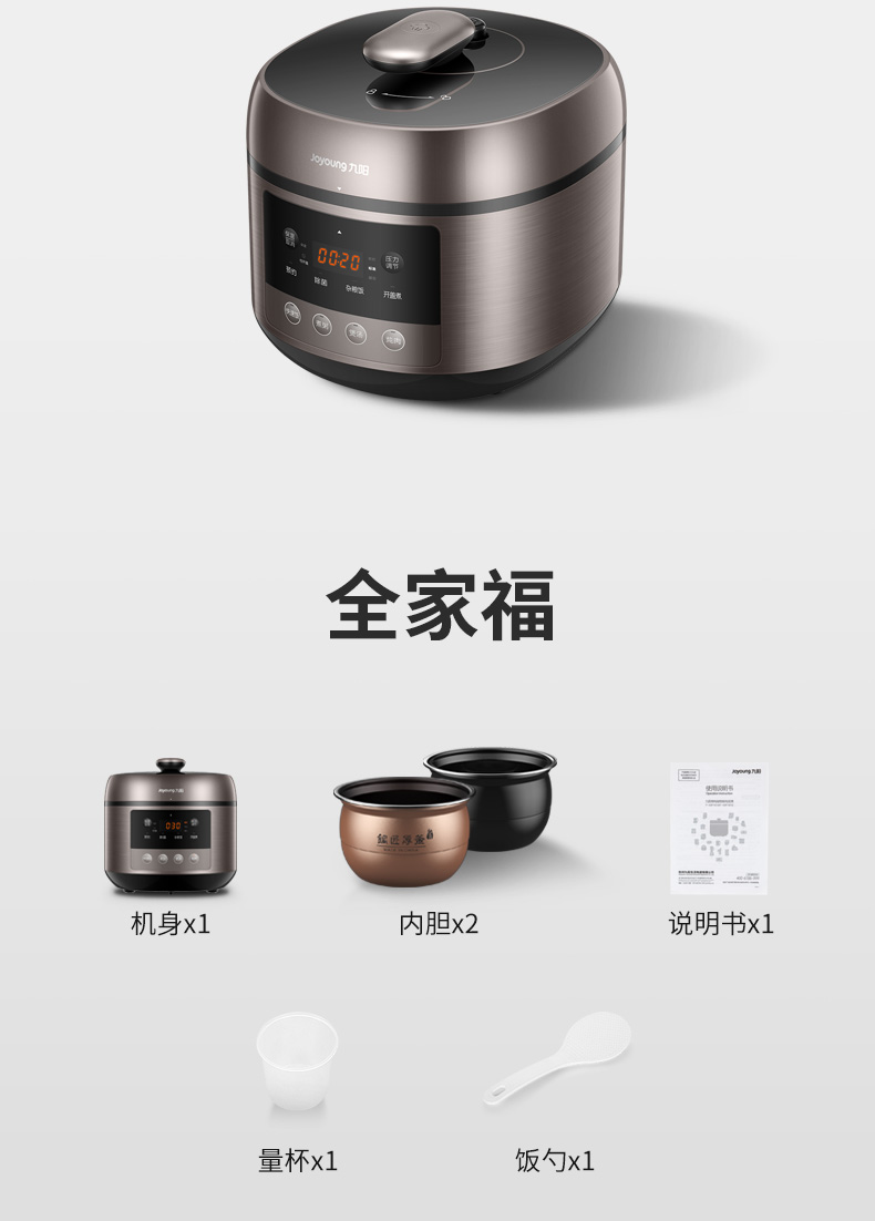 球釜双胆,九阳6L大容量电压力锅,时尚方煲造型,一机双胆,多重安全防护,智能界面操控,24H智能预约,10大功能菜单,更有轻养云食谱,智能实时菜单,美味轻松选择,煲煮炖闷吃你想吃的